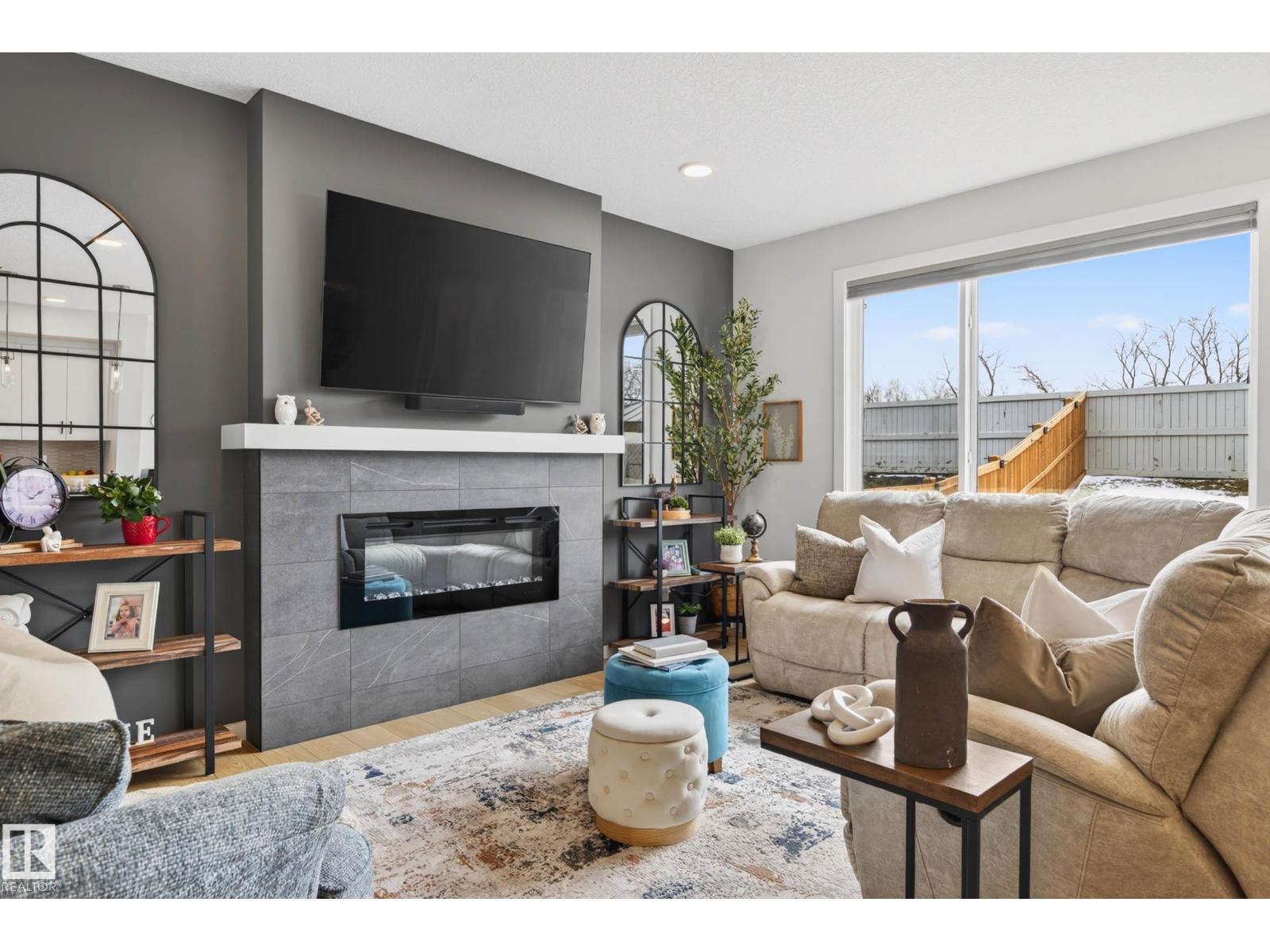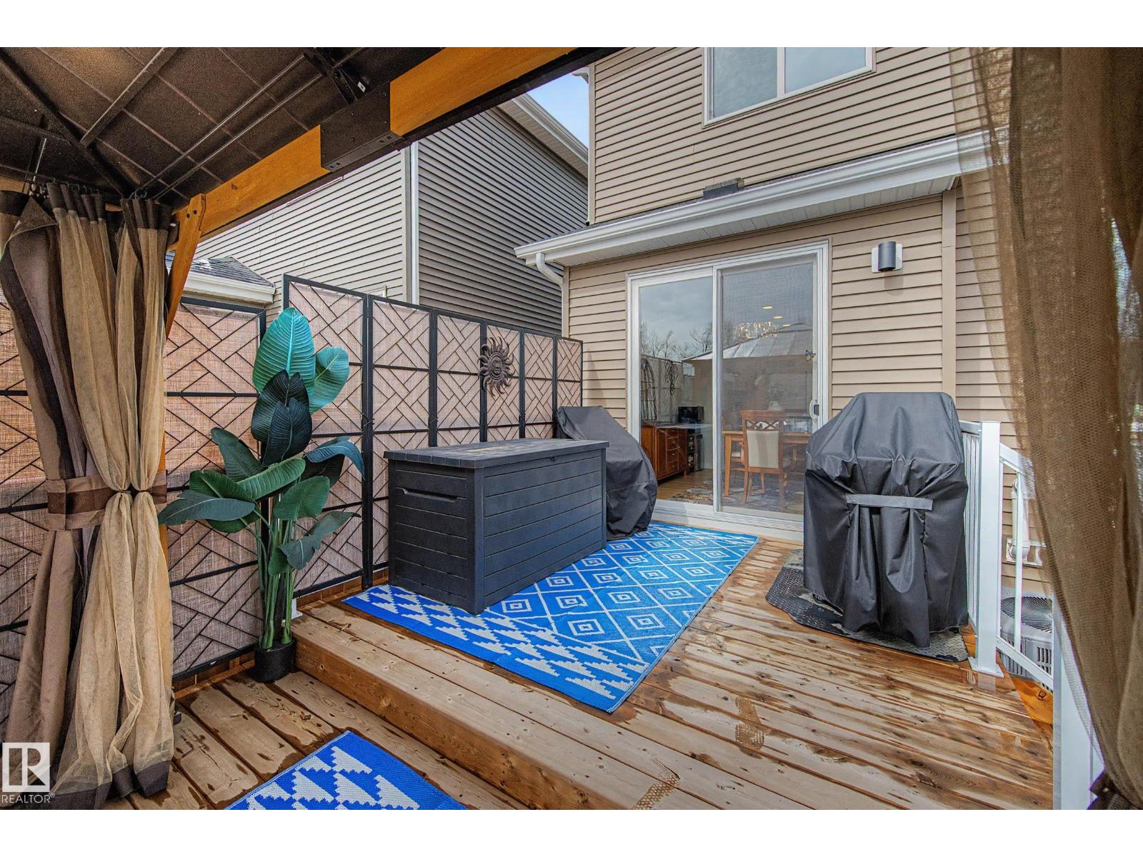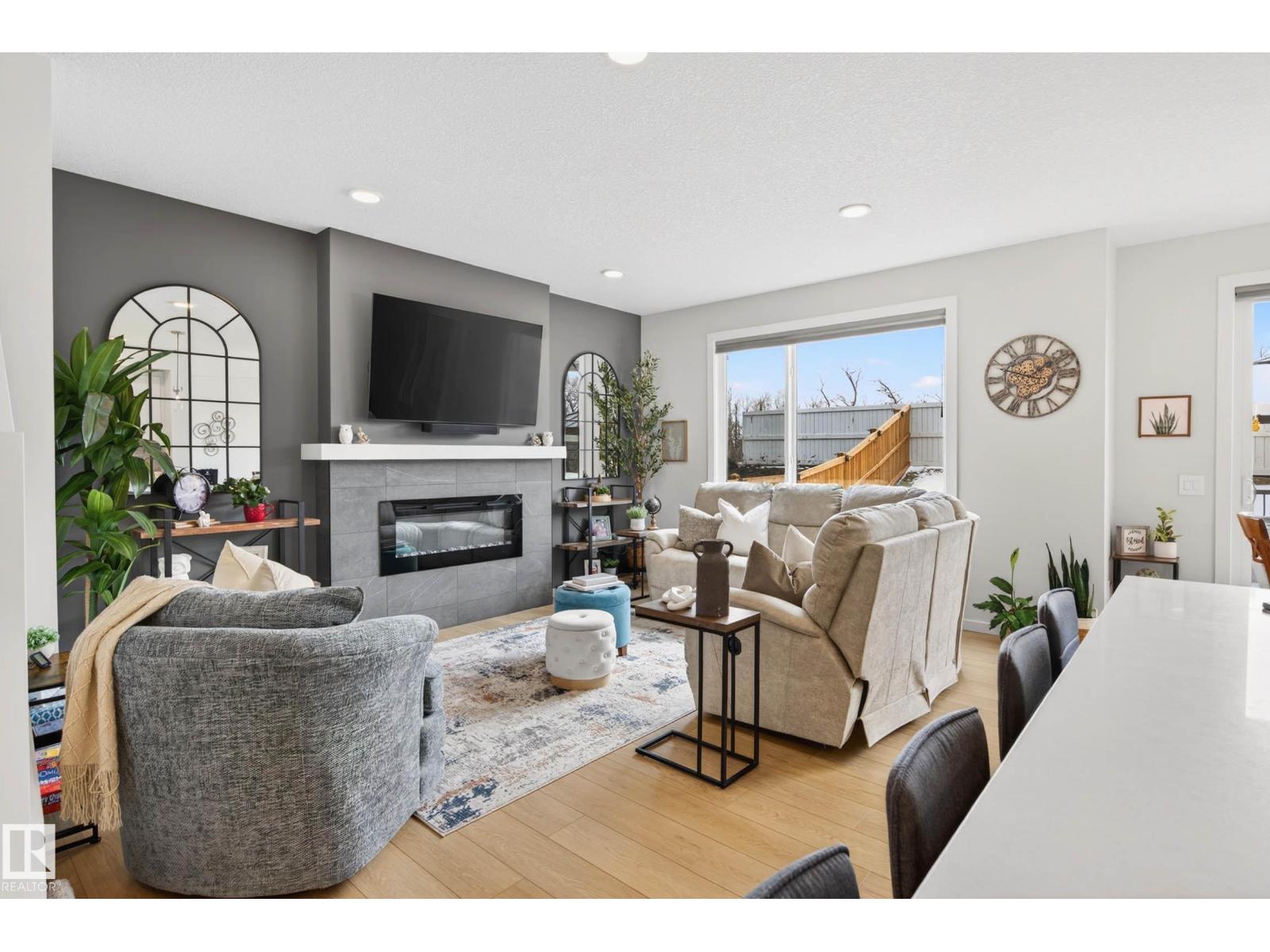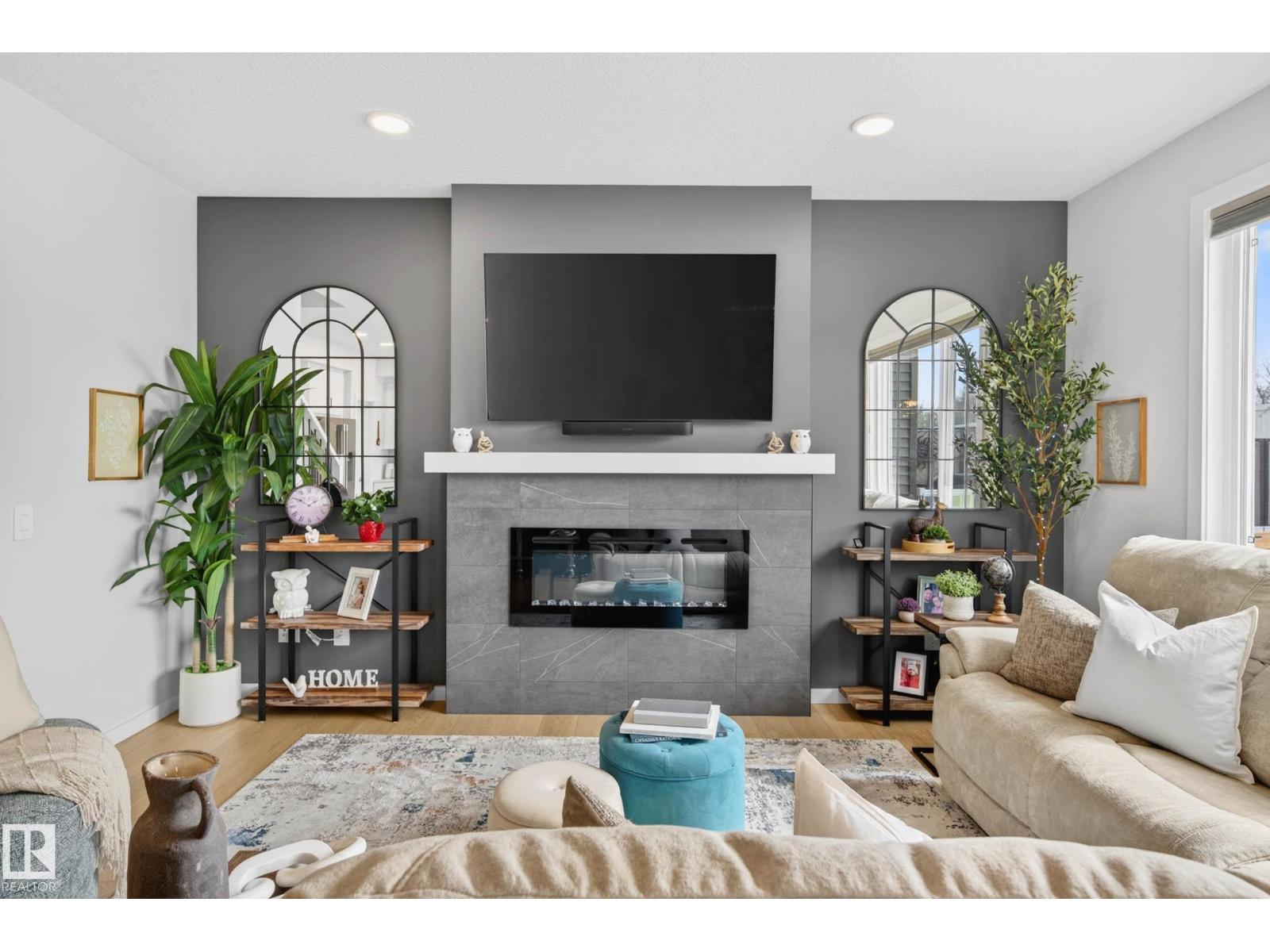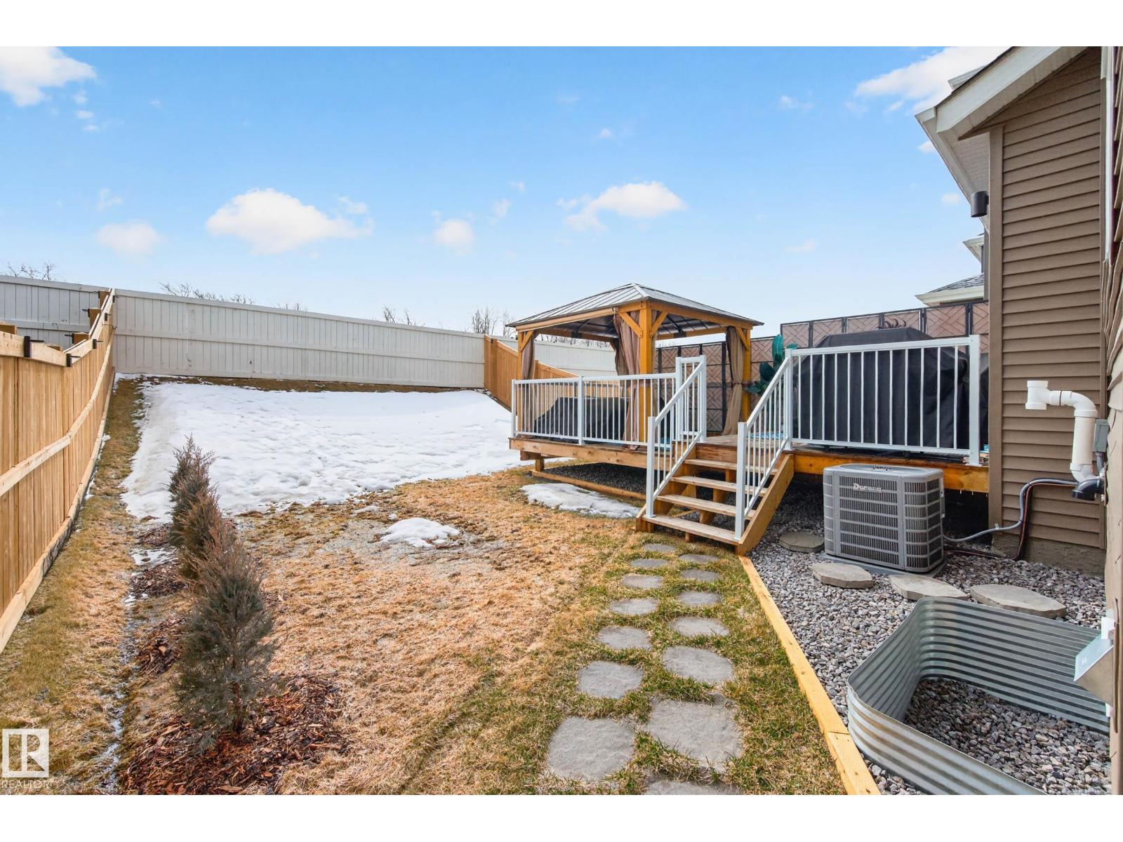 Welcome to this beautifully upgraded home nestled in the vibrant, family-friendly community of Southfork Leduc. Built by Homes By Avi w/extensive upgrades & exceptional pride of ownership. Designed for growing families & future flexibility as home features separate side entrance w/concrete sidewalk & plumbing rough-ins for a potential legal suite in 9’ basement. Step inside a bright, stylish interior where upgrades are immediately evident. Kitchen is functional & elegant, showcasing two-tone cabinetry, upgraded SS Bosh/LG appliances & lighting. Living room is warm & inviting, highlighted by a beautifully tiled fireplace & custom blinds that add a polished, designer finish. Upstairs, you’ll find added touches like iron spindle railings, den, laundry room & WIC's in each bdrm. Extra-large, 2-tier deck (w/weed barrier), gazebo & rock features complete professionally landscaped/fenced yard. Permanent gemstone lighting & Central A/C for added convenience. Nestle your family in this home that is INCREDIBLE! (id:63190)