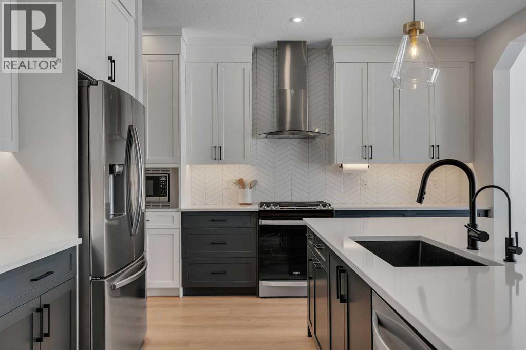 Welcome to 23 Savoy Terrace SE, located in Calgary’s innovative garden to table community of Rangeview. Perfectly positioned just south of Mahogany and east of Seton, this home offers convenient access to major roadways and a wide range of nearby amenities. Set on one of the most desirable lots in the community, this exceptional walk-out property backs west onto green space, a tranquil pond, and water feature, with unobstructed views stretching to a nature reserve and the Rocky Mountains. Offering breathtaking sunsets and privacy, this is truly a premium lot. Designed with both luxury and functionality in mind, the gourmet chef’s kitchen showcases full-height cabinetry with crown molding, quartz countertops, a designer tile backsplash, and an expansive island with bar seating. Upgraded with a gas stove, stainless steel appliances, and a butler’s pantry, this space is perfect for cooking, hosting, and everyday living. The open concept layout creates a seamless flow into the dining and living areas, ideal for entertaining. The living room is anchored by a cozy gas fireplace and framed by oversized windows that flood the home with natural light while capturing the incredible west-facing views. Step outside onto the oversized deck with a gas line for your BBQ, perfect for enjoying evenings overlooking the water and green space. A main floor den/office and a 2-piece powder room complete the level. Upstairs, the primary retreat is a true standout, featuring vaulted ceilings, expansive windows, a spacious walk-in closet, and a luxurious 5-piece ensuite with a soaker tub, standalone shower, and double vanity. The upper level also includes a generous bonus room, two additional bedrooms, a 4-piece bathroom, and a convenient laundry room. Additional features that enhance comfort, style, and value include a highly functional floor plan, modern interior design finishes throughout, air conditioning, a water softener and filtration system, and completed front landscaping, offering both move in readiness and long-term peace of mind. Rangeview is a thoughtfully designed community where food, sustainability, and connection take center stage, bringing residents together through shared gardens, local food production, and a lifestyle rooted in nature. (id:63190)