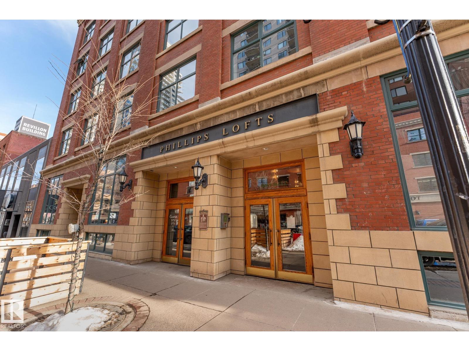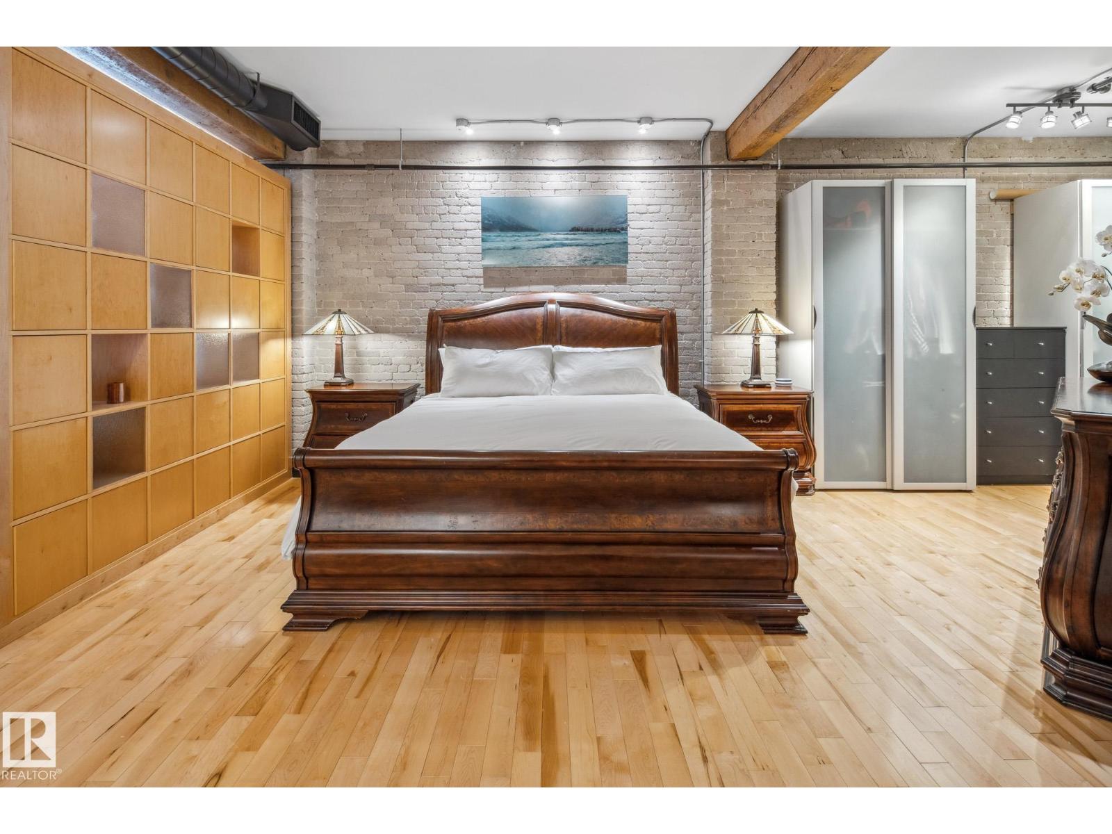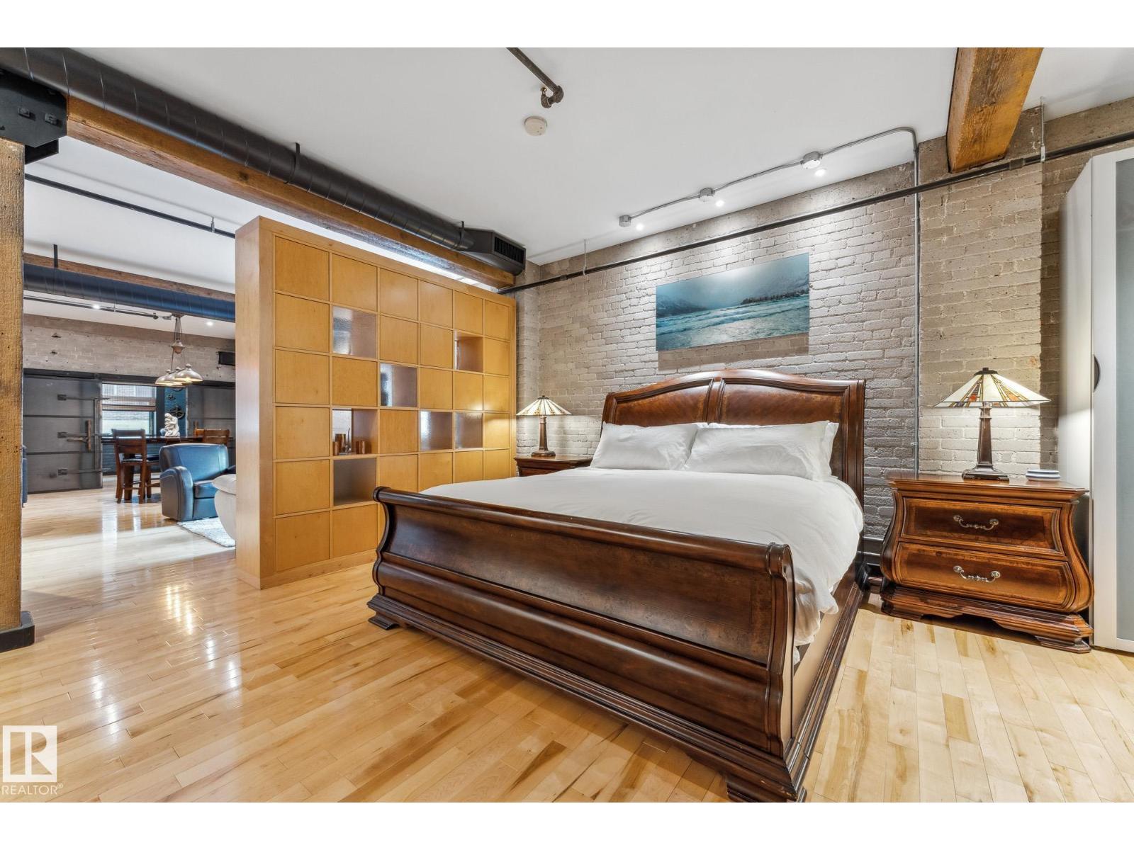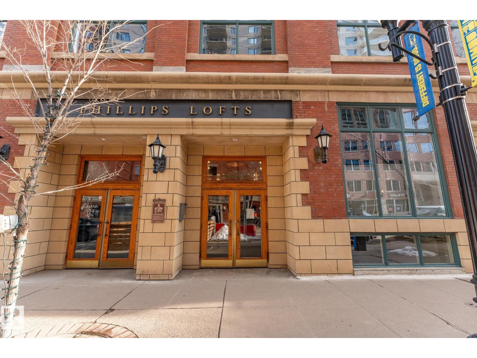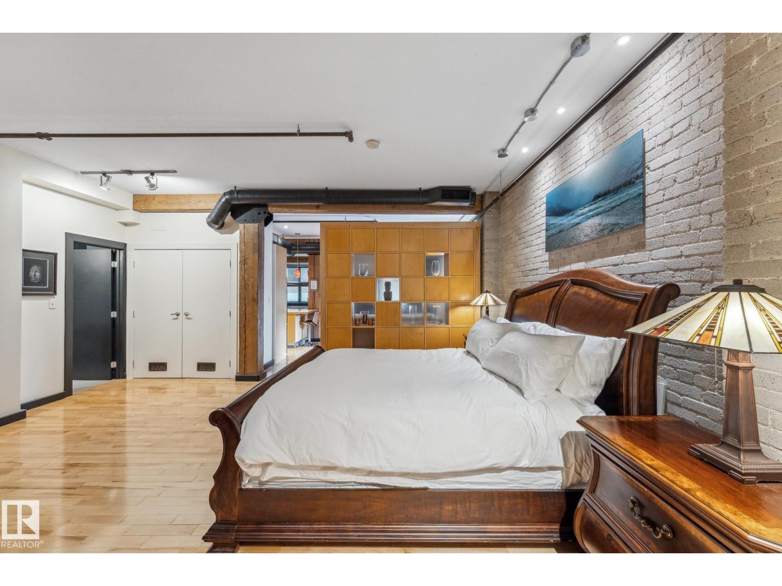 Quintessential Downtown Loft with Amazing Exposed Brick and Wood! This beautifully open concept and modernized one bedroom and den has been upgraded throughout boasting gleaming hardwood floors, custom built sliding steel doors, custom storage wall providing privacy and cupboard space to the master bedroom, 9’+ ceilings, central air conditioning (only certain units in building have it), underground parking (only certain units in building have it as well) and a storage cage that can be rented from the complex. Phillips Lofts is a historic building that is completely non-smoking, is pet friendly, and features a roof top patio as well. At over 1,500 sq/ft and situated in the absolute heart of Downtown’s 104 Street next to amazing restaurants, pubs, wine bars, coffee shops, the summertime outdoor market, and Rogers Place, this transcendent home is truly a must see! (id:63190)