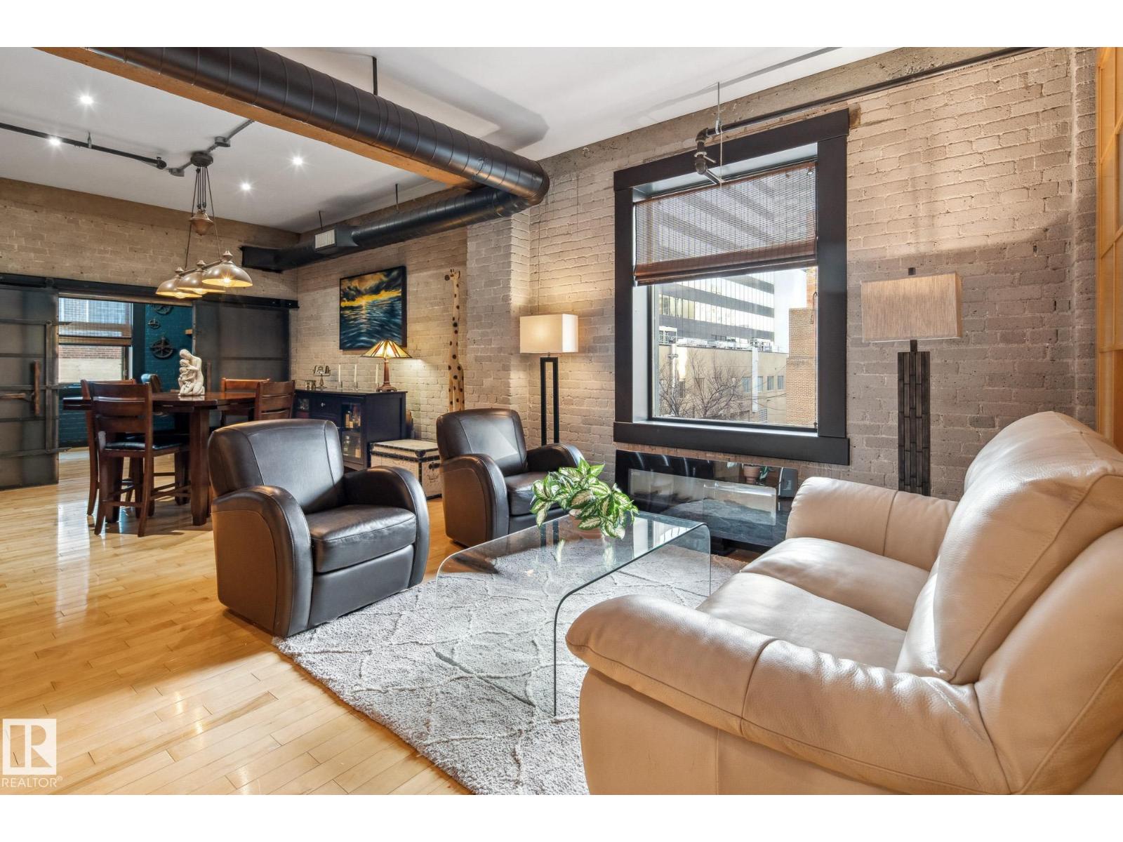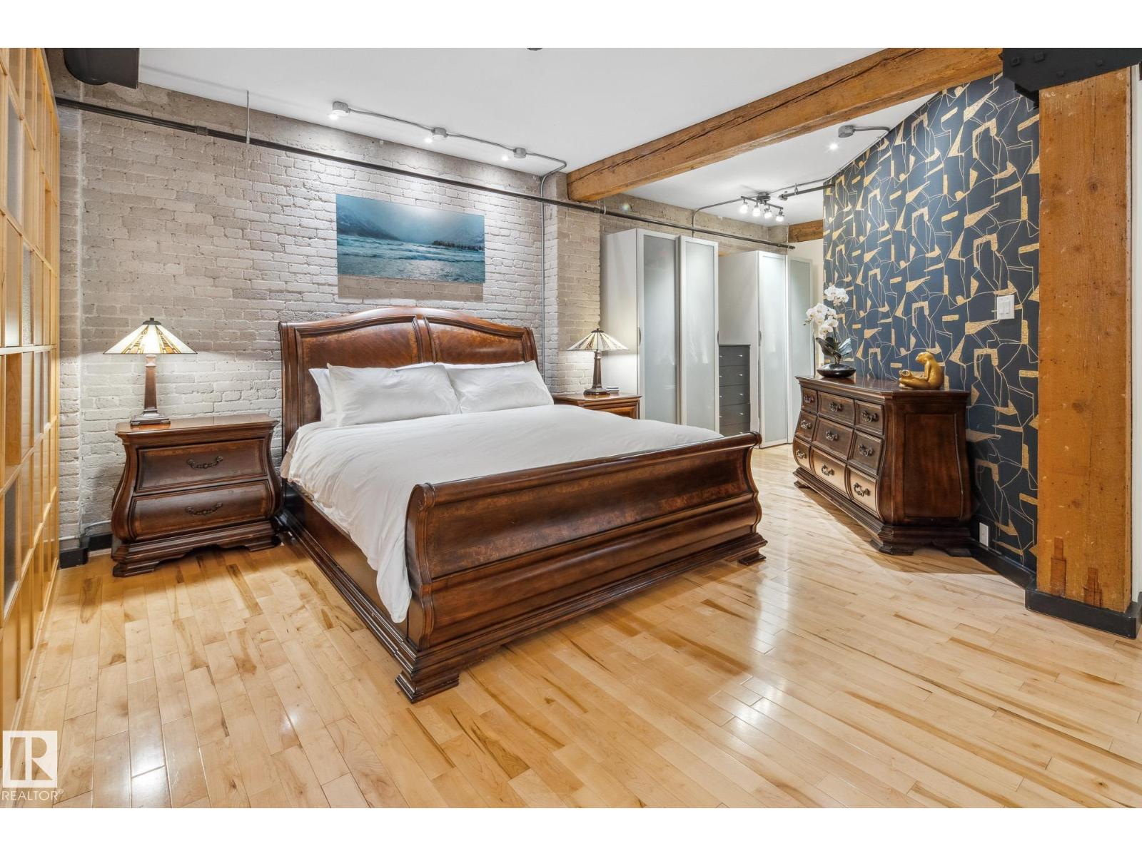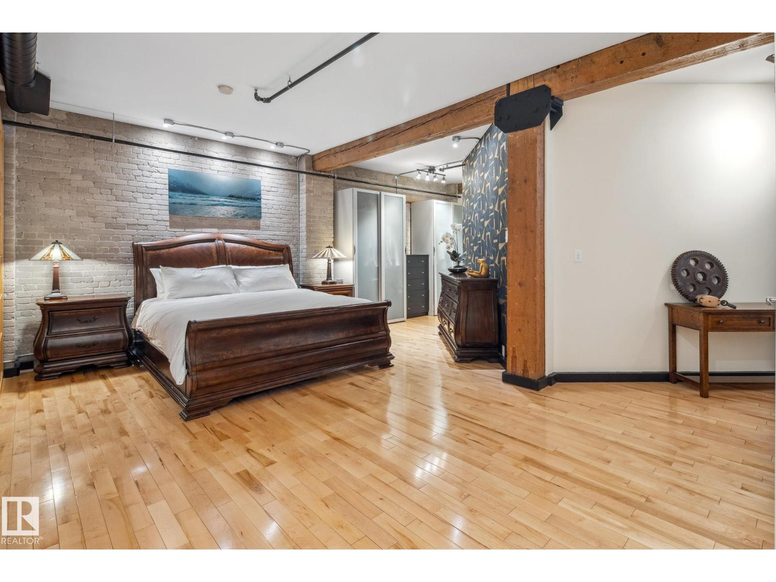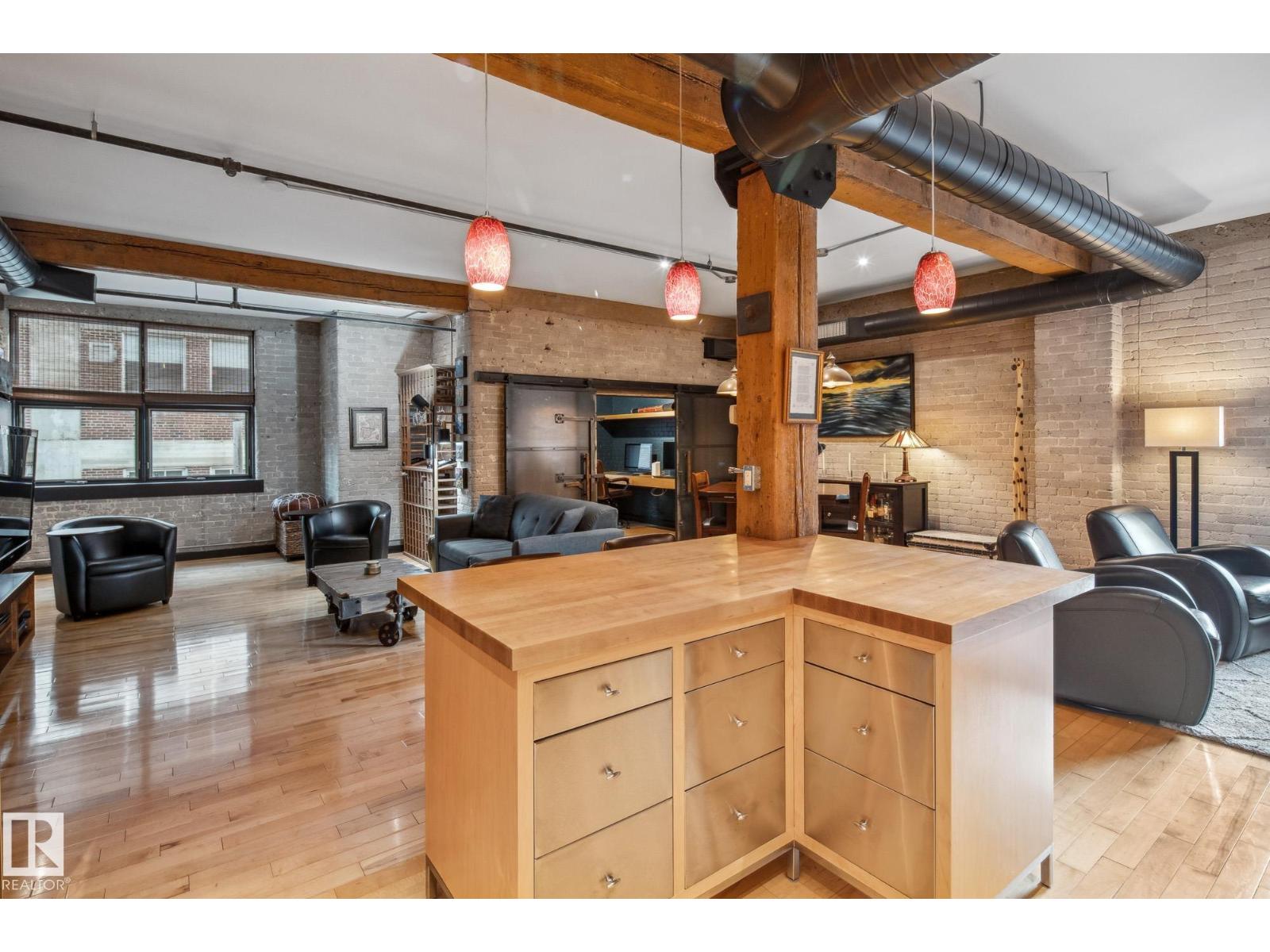 Quintessential Downtown Loft with Amazing Exposed Brick and Wood! This beautifully open concept and modernized one bedroom and den has been upgraded throughout boasting gleaming hardwood floors, custom built sliding steel doors, custom storage wall providing privacy and cupboard space to the master bedroom, 9’+ ceilings, central air conditioning (only certain units in building have it), underground parking (only certain units in building have it as well) and a storage cage that can be rented from the complex. Phillips Lofts is a historic building that is completely non-smoking, is pet friendly, and features a roof top patio as well. At over 1,500 sq/ft and situated in the absolute heart of Downtown’s 104 Street next to amazing restaurants, pubs, wine bars, coffee shops, the summertime outdoor market, and Rogers Place, this transcendent home is truly a must see! (id:63190)