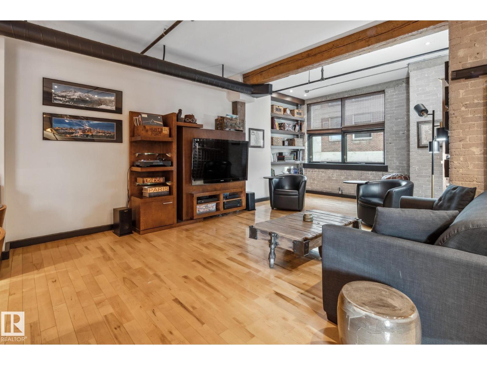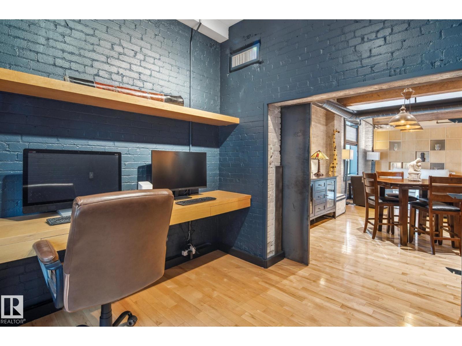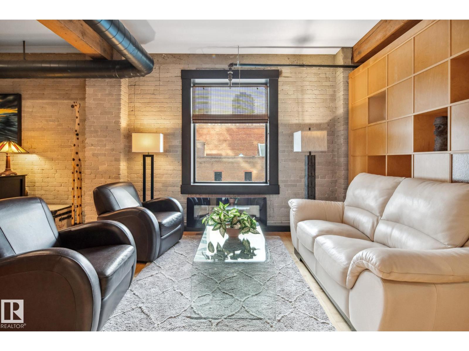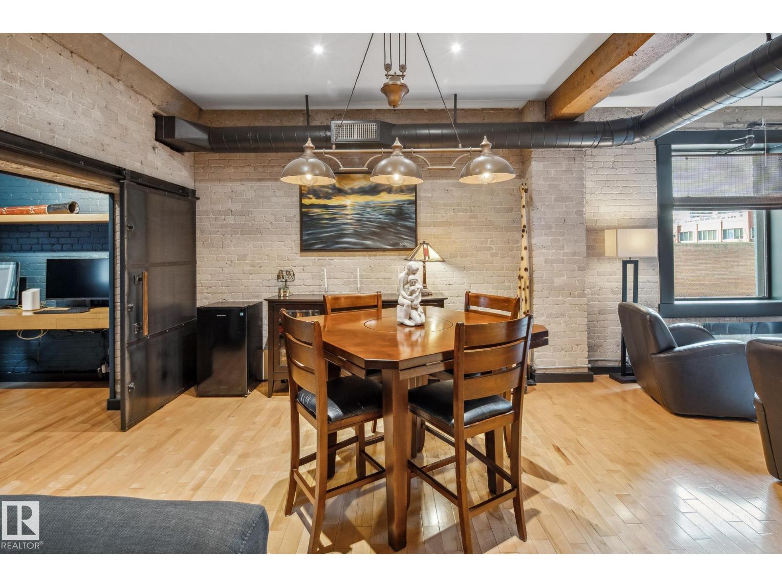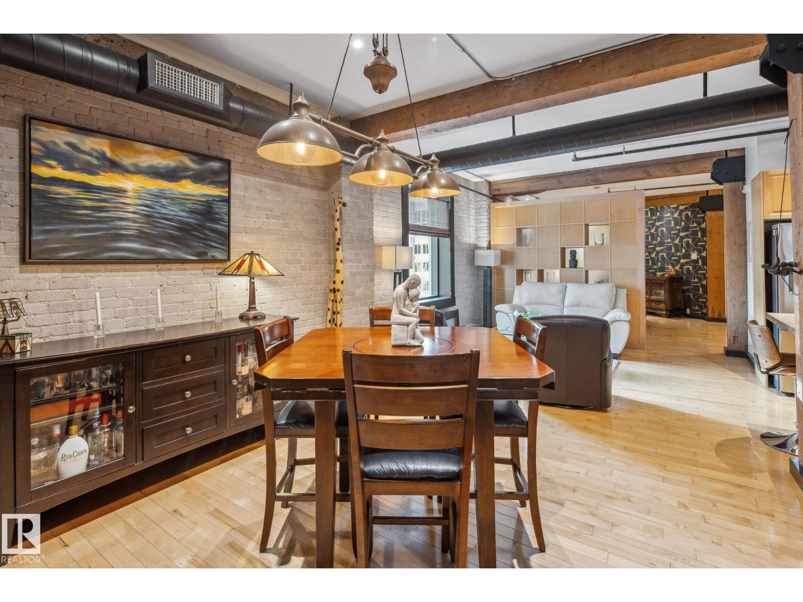 Quintessential Downtown Loft with Amazing Exposed Brick and Wood! This beautifully open concept and modernized one bedroom and den has been upgraded throughout boasting gleaming hardwood floors, custom built sliding steel doors, custom storage wall providing privacy and cupboard space to the master bedroom, 9’+ ceilings, central air conditioning (only certain units in building have it), underground parking (only certain units in building have it as well) and a storage cage that can be rented from the complex. Phillips Lofts is a historic building that is completely non-smoking, is pet friendly, and features a roof top patio as well. At over 1,500 sq/ft and situated in the absolute heart of Downtown’s 104 Street next to amazing restaurants, pubs, wine bars, coffee shops, the summertime outdoor market, and Rogers Place, this transcendent home is truly a must see! (id:63190)