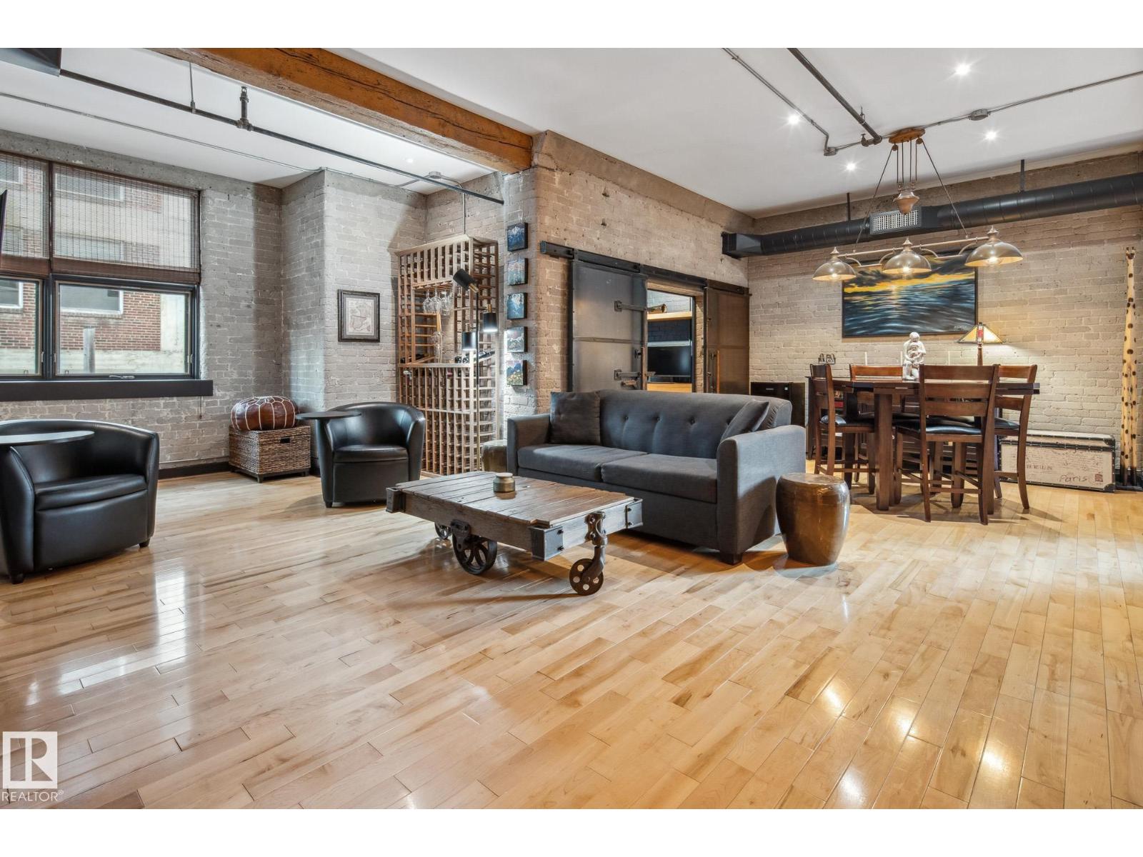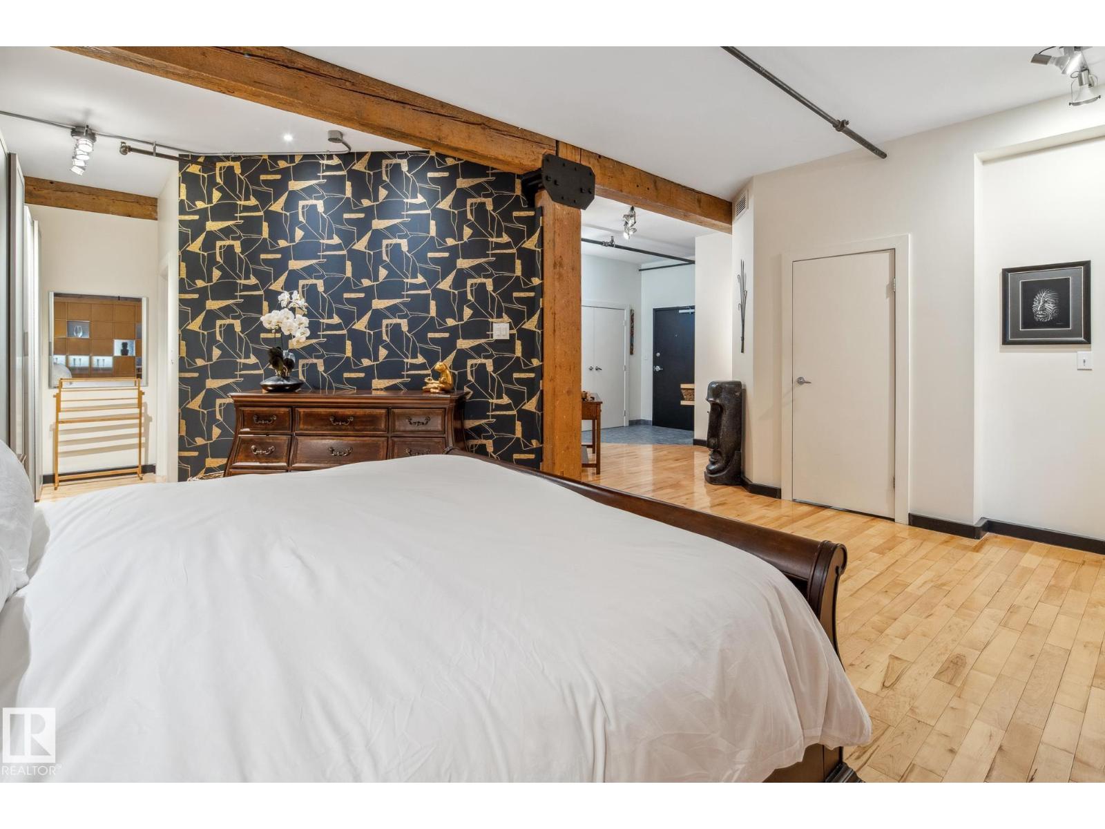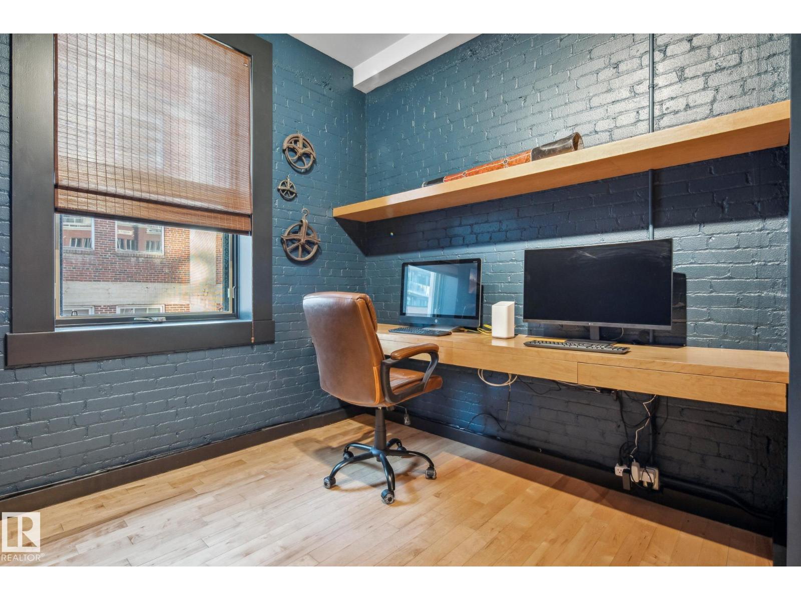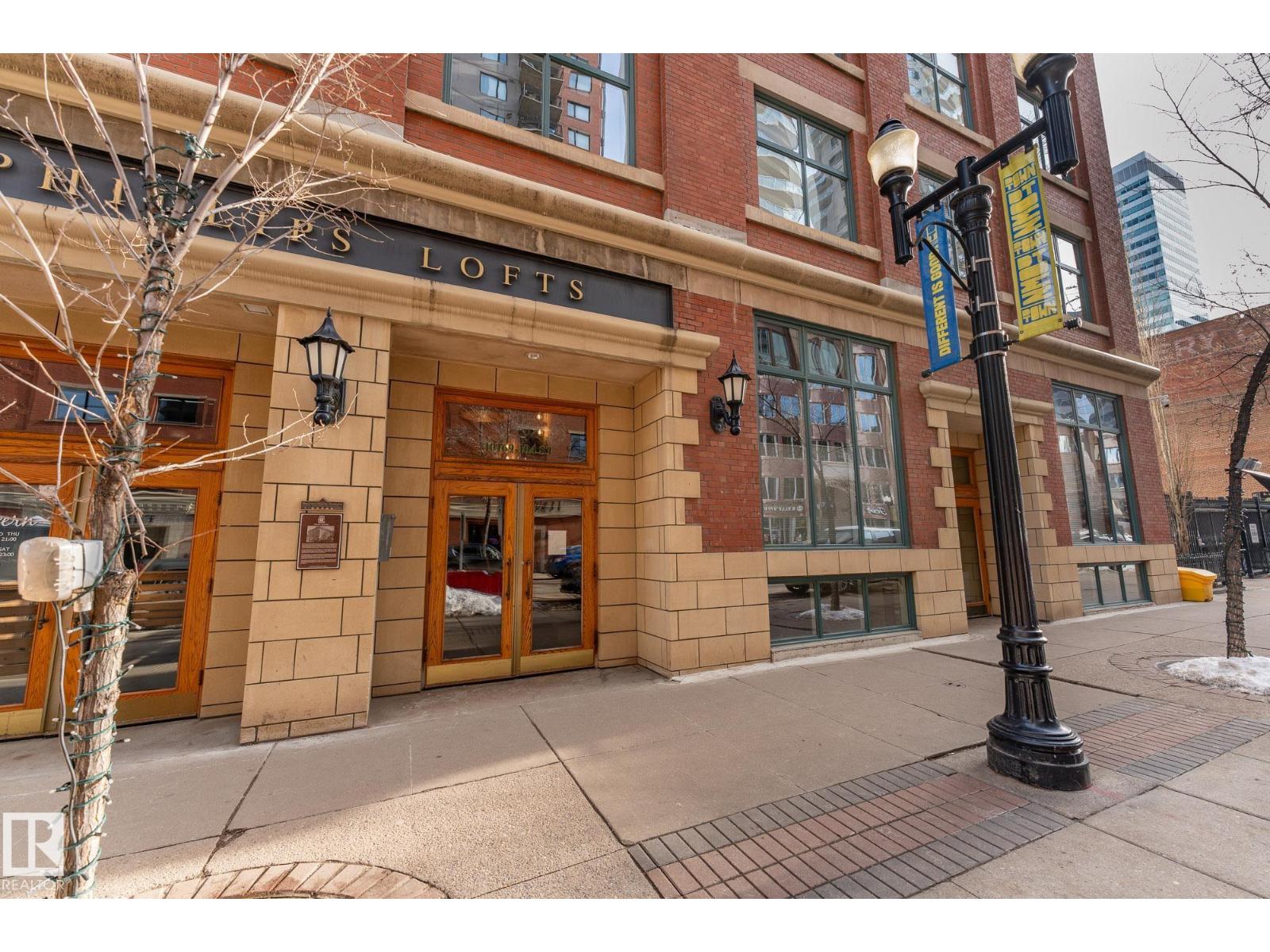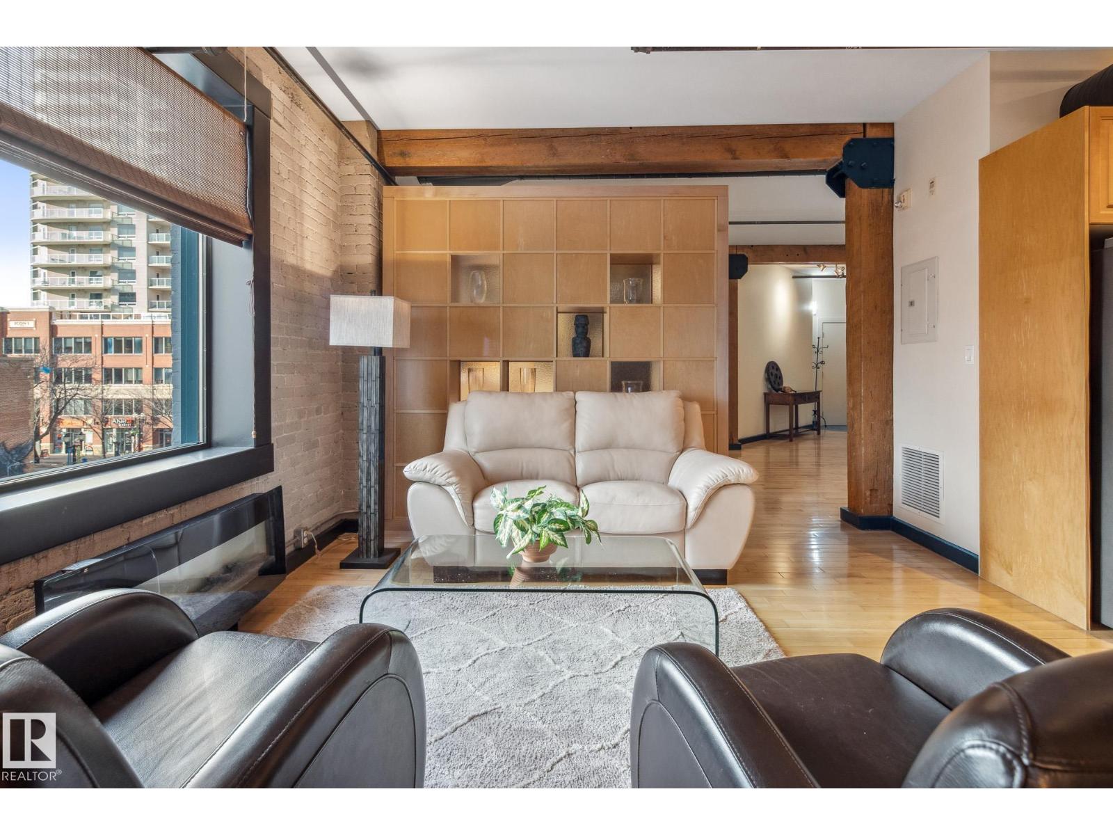 Quintessential Downtown Loft with Amazing Exposed Brick and Wood! This beautifully open concept and modernized one bedroom and den has been upgraded throughout boasting gleaming hardwood floors, custom built sliding steel doors, custom storage wall providing privacy and cupboard space to the master bedroom, 9’+ ceilings, central air conditioning (only certain units in building have it), underground parking (only certain units in building have it as well) and a storage cage that can be rented from the complex. Phillips Lofts is a historic building that is completely non-smoking, is pet friendly, and features a roof top patio as well. At over 1,500 sq/ft and situated in the absolute heart of Downtown’s 104 Street next to amazing restaurants, pubs, wine bars, coffee shops, the summertime outdoor market, and Rogers Place, this transcendent home is truly a must see! (id:63190)