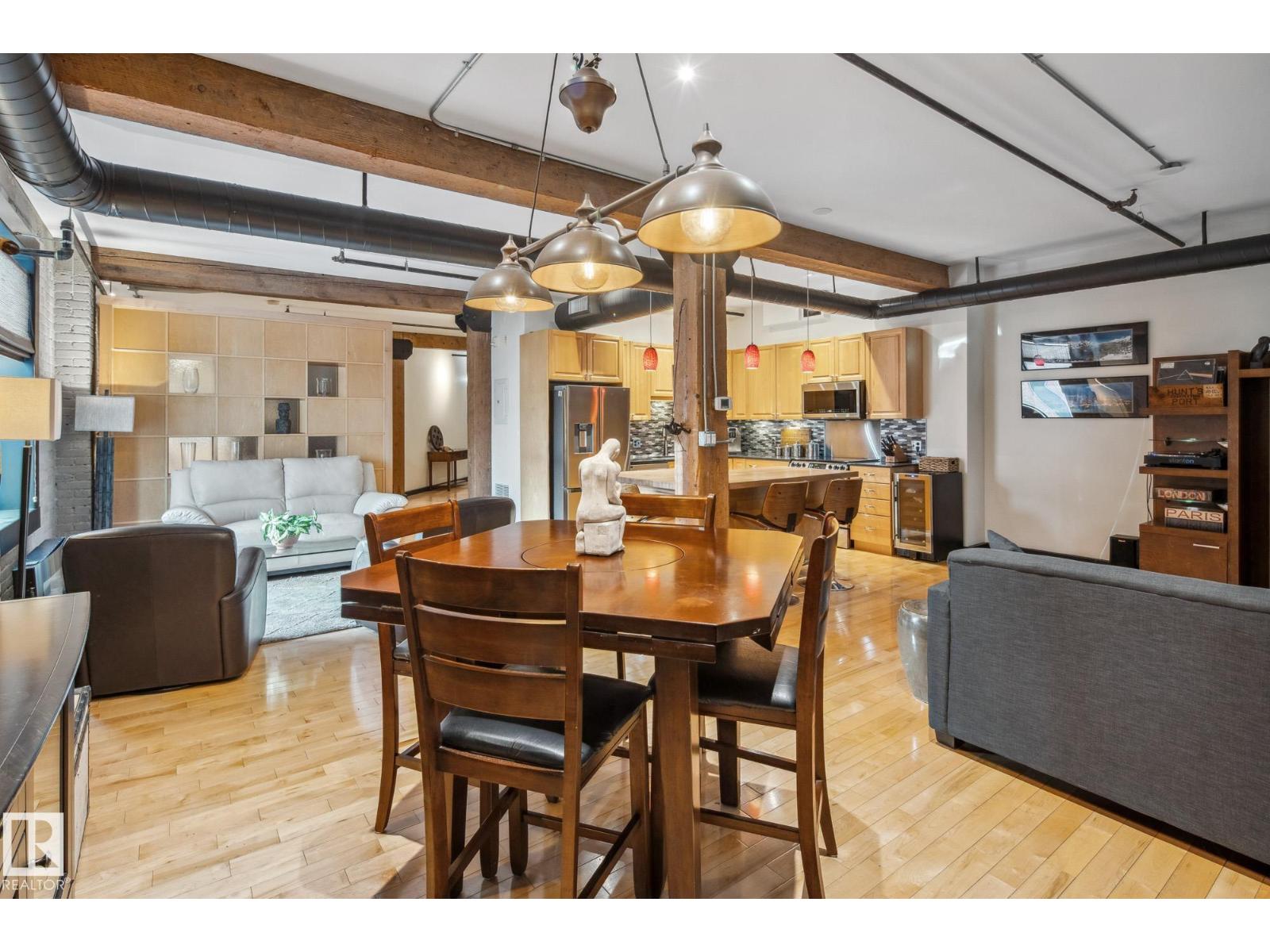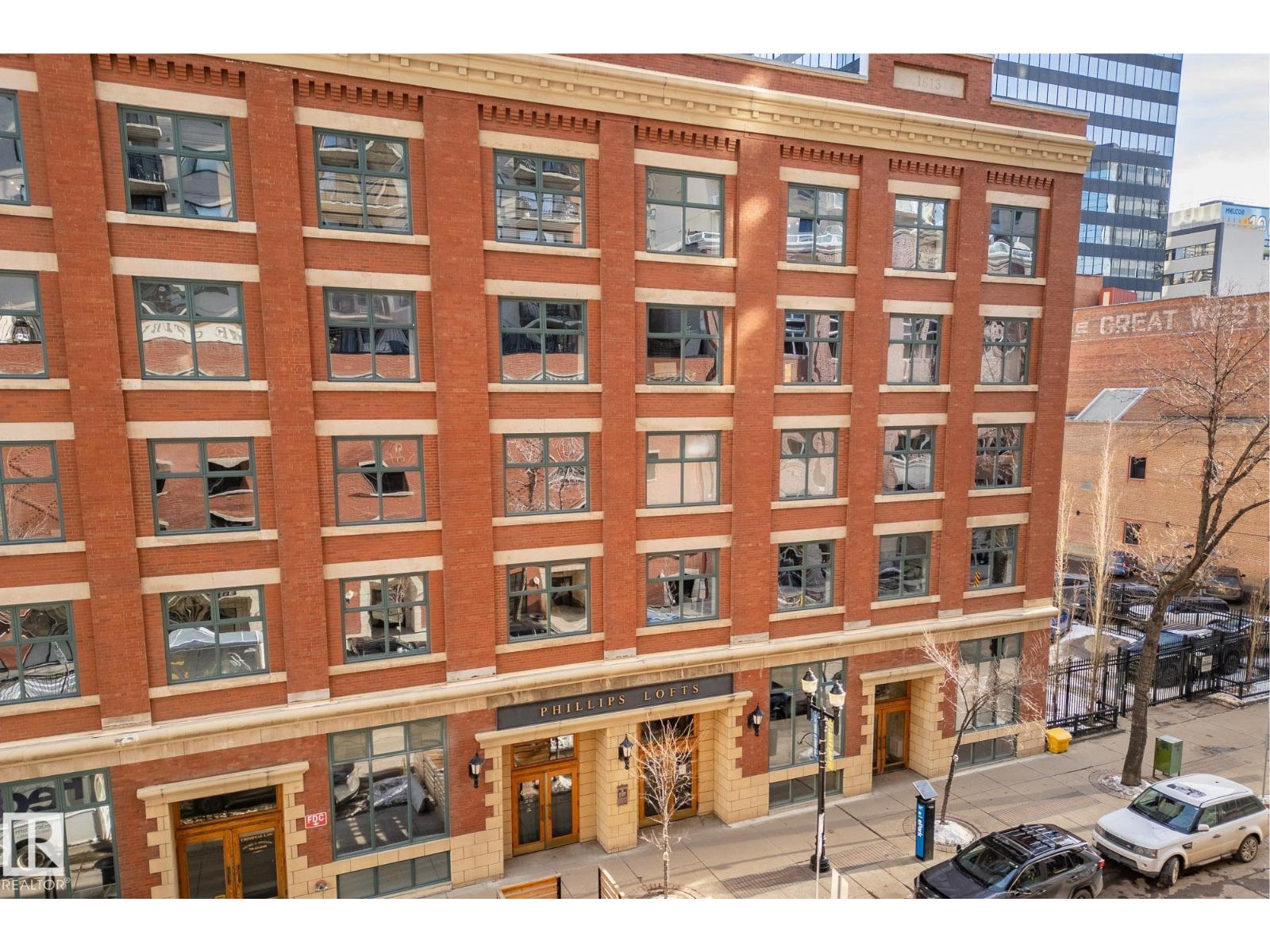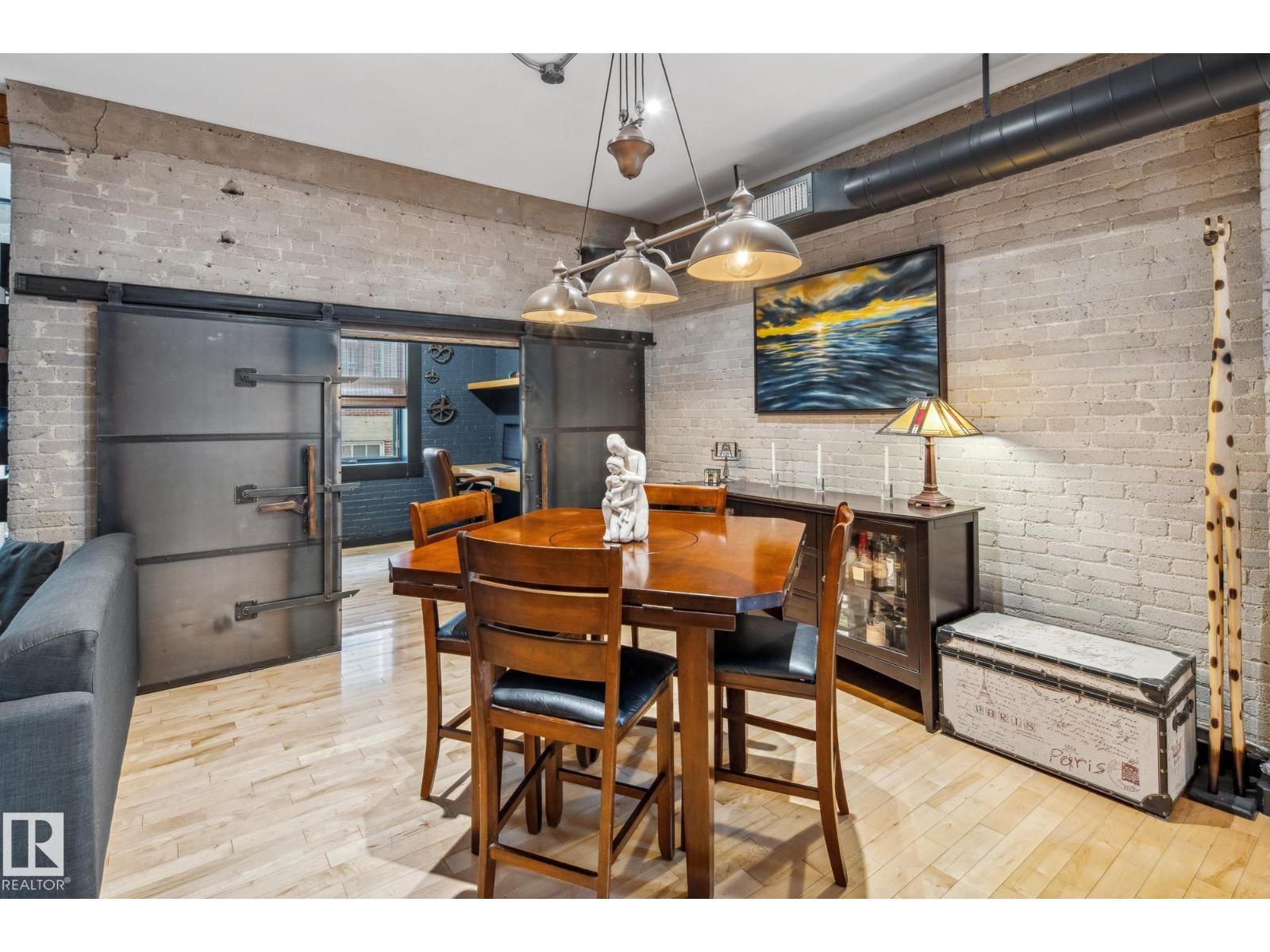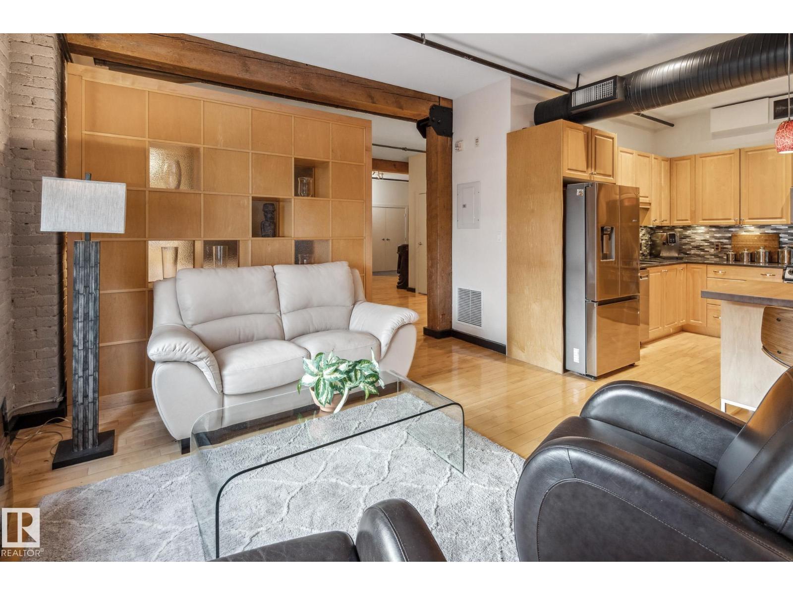 Quintessential Downtown Loft with Amazing Exposed Brick and Wood! This beautifully open concept and modernized one bedroom and den has been upgraded throughout boasting gleaming hardwood floors, custom built sliding steel doors, custom storage wall providing privacy and cupboard space to the master bedroom, 9’+ ceilings, central air conditioning (only certain units in building have it), underground parking (only certain units in building have it as well) and a storage cage that can be rented from the complex. Phillips Lofts is a historic building that is completely non-smoking, is pet friendly, and features a roof top patio as well. At over 1,500 sq/ft and situated in the absolute heart of Downtown’s 104 Street next to amazing restaurants, pubs, wine bars, coffee shops, the summertime outdoor market, and Rogers Place, this transcendent home is truly a must see! (id:63190)