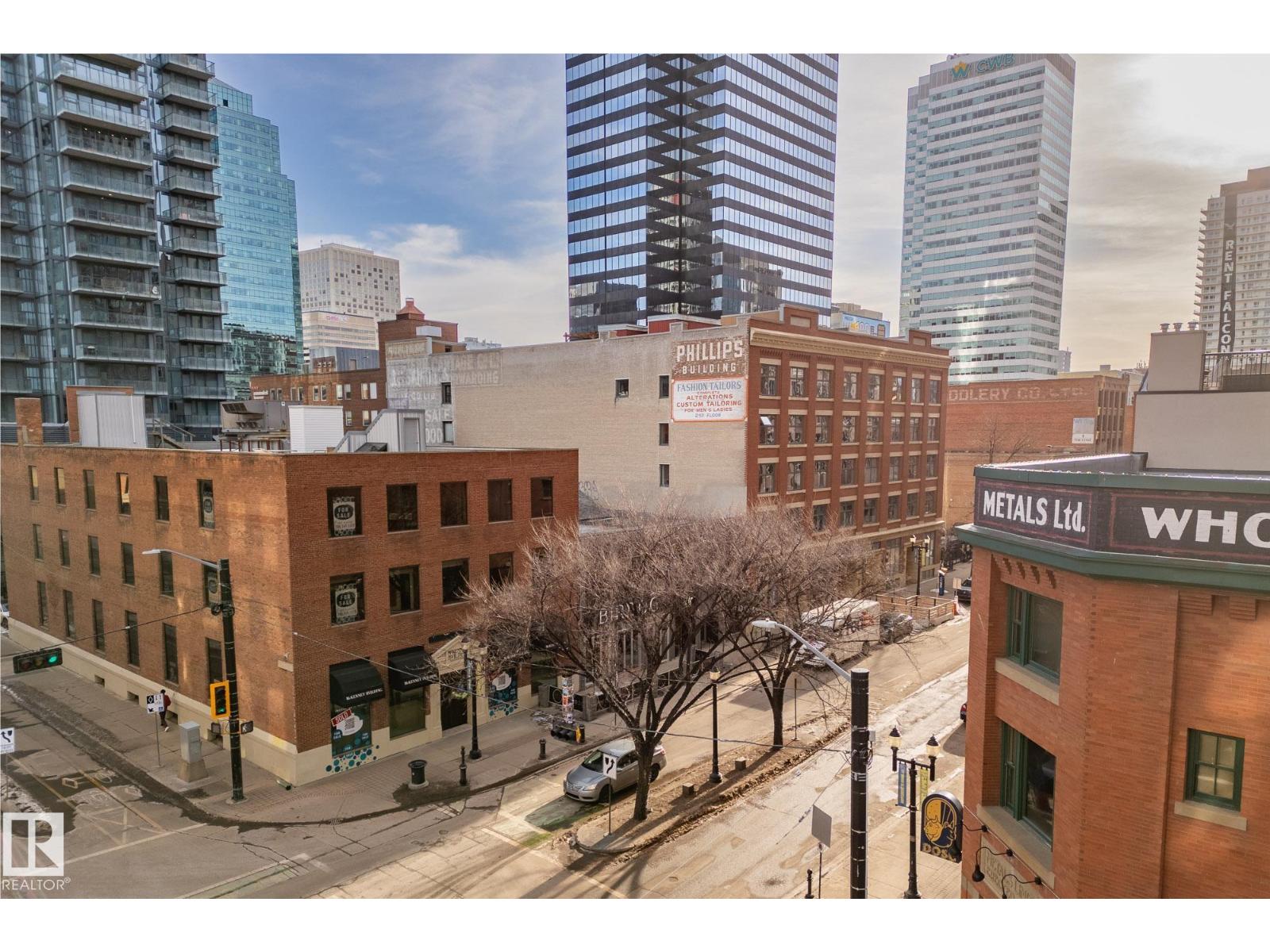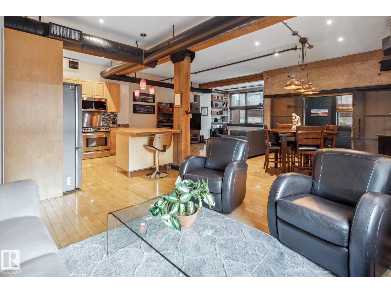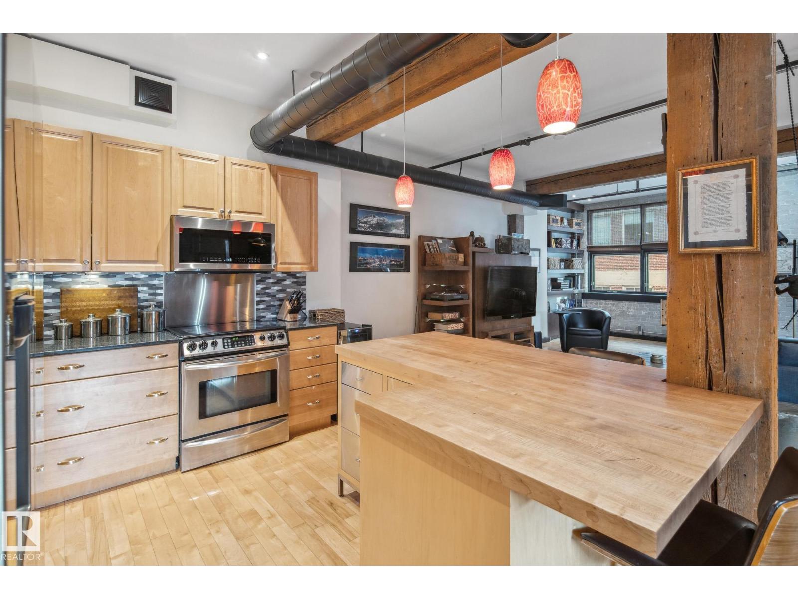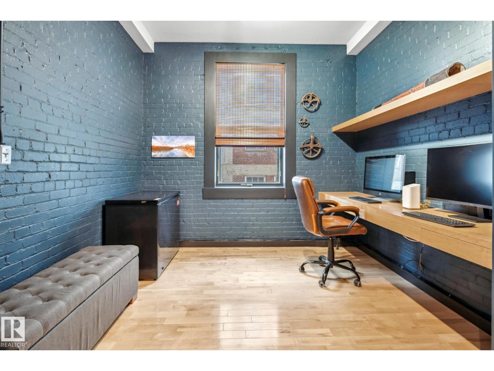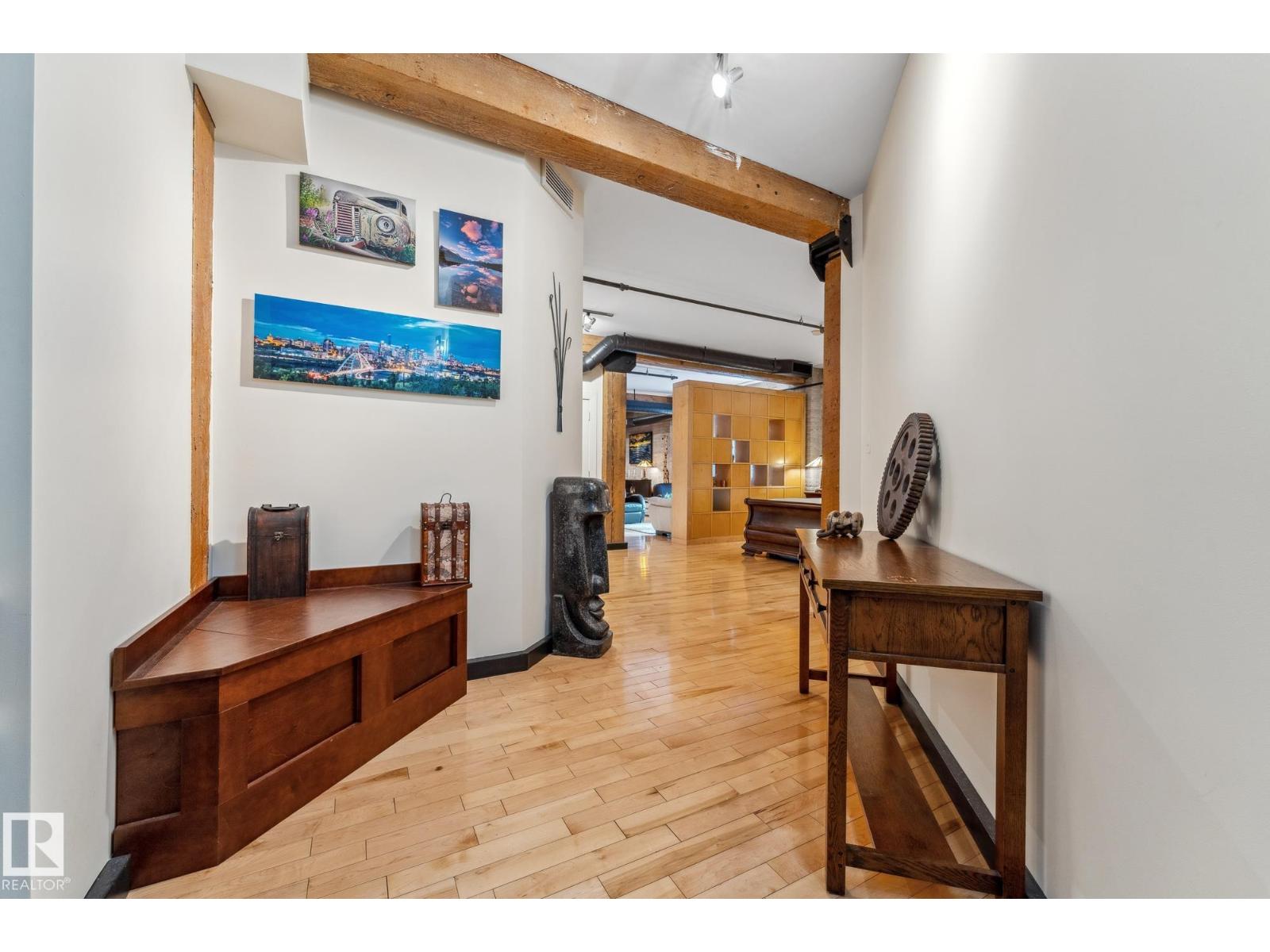 Quintessential Downtown Loft with Amazing Exposed Brick and Wood! This beautifully open concept and modernized one bedroom and den has been upgraded throughout boasting gleaming hardwood floors, custom built sliding steel doors, custom storage wall providing privacy and cupboard space to the master bedroom, 9’+ ceilings, central air conditioning (only certain units in building have it), underground parking (only certain units in building have it as well) and a storage cage that can be rented from the complex. Phillips Lofts is a historic building that is completely non-smoking, is pet friendly, and features a roof top patio as well. At over 1,500 sq/ft and situated in the absolute heart of Downtown’s 104 Street next to amazing restaurants, pubs, wine bars, coffee shops, the summertime outdoor market, and Rogers Place, this transcendent home is truly a must see! (id:63190)