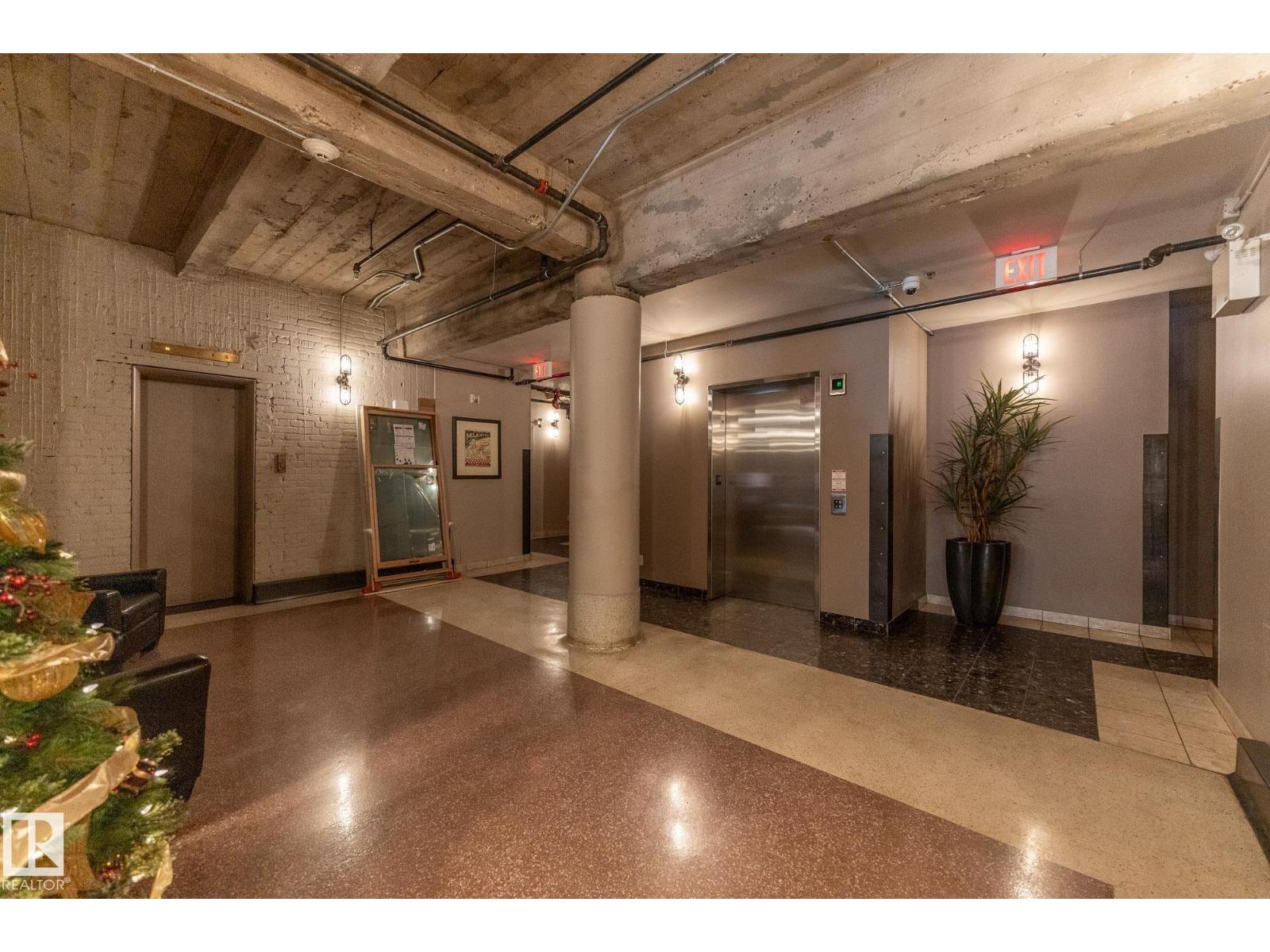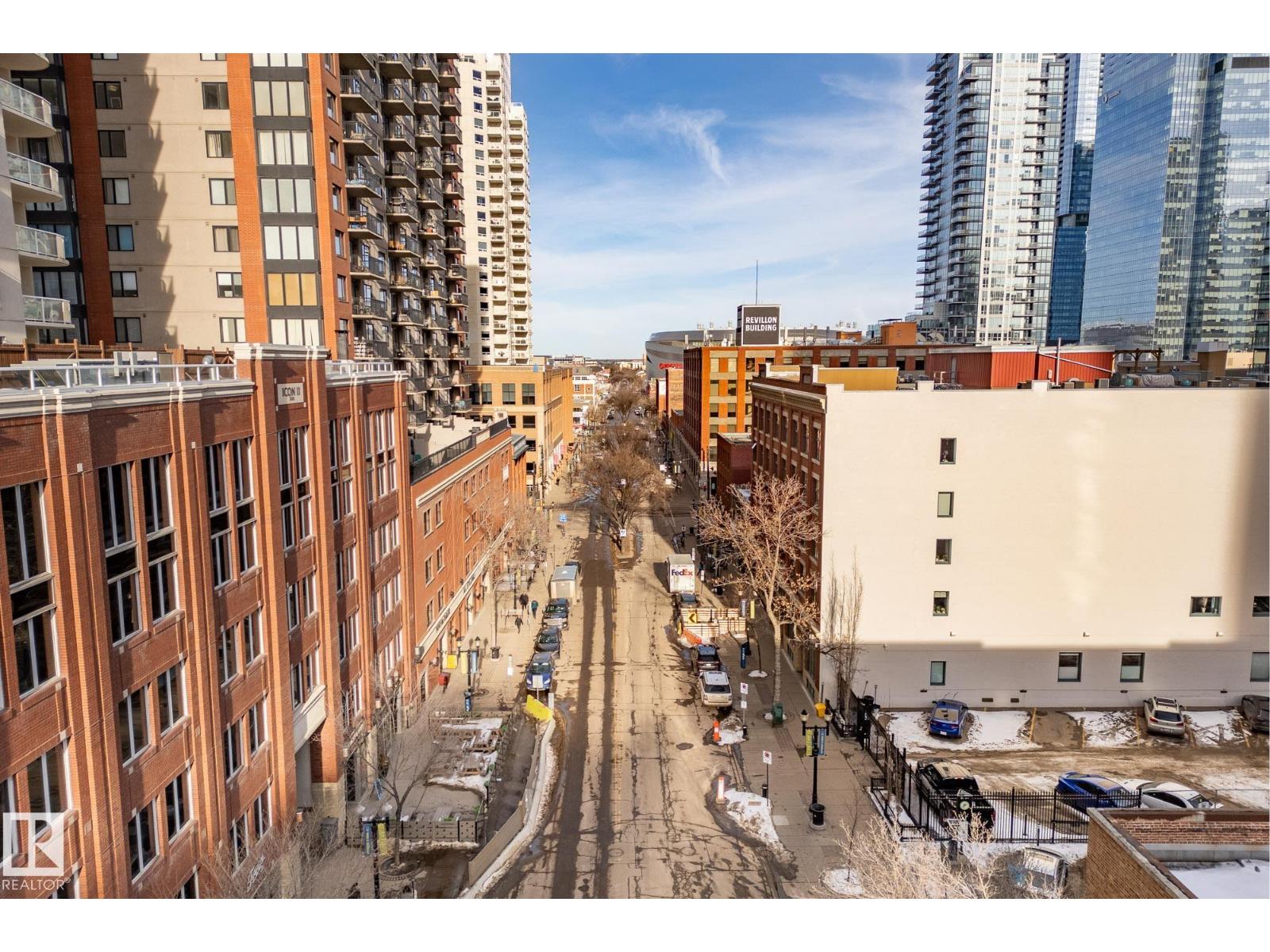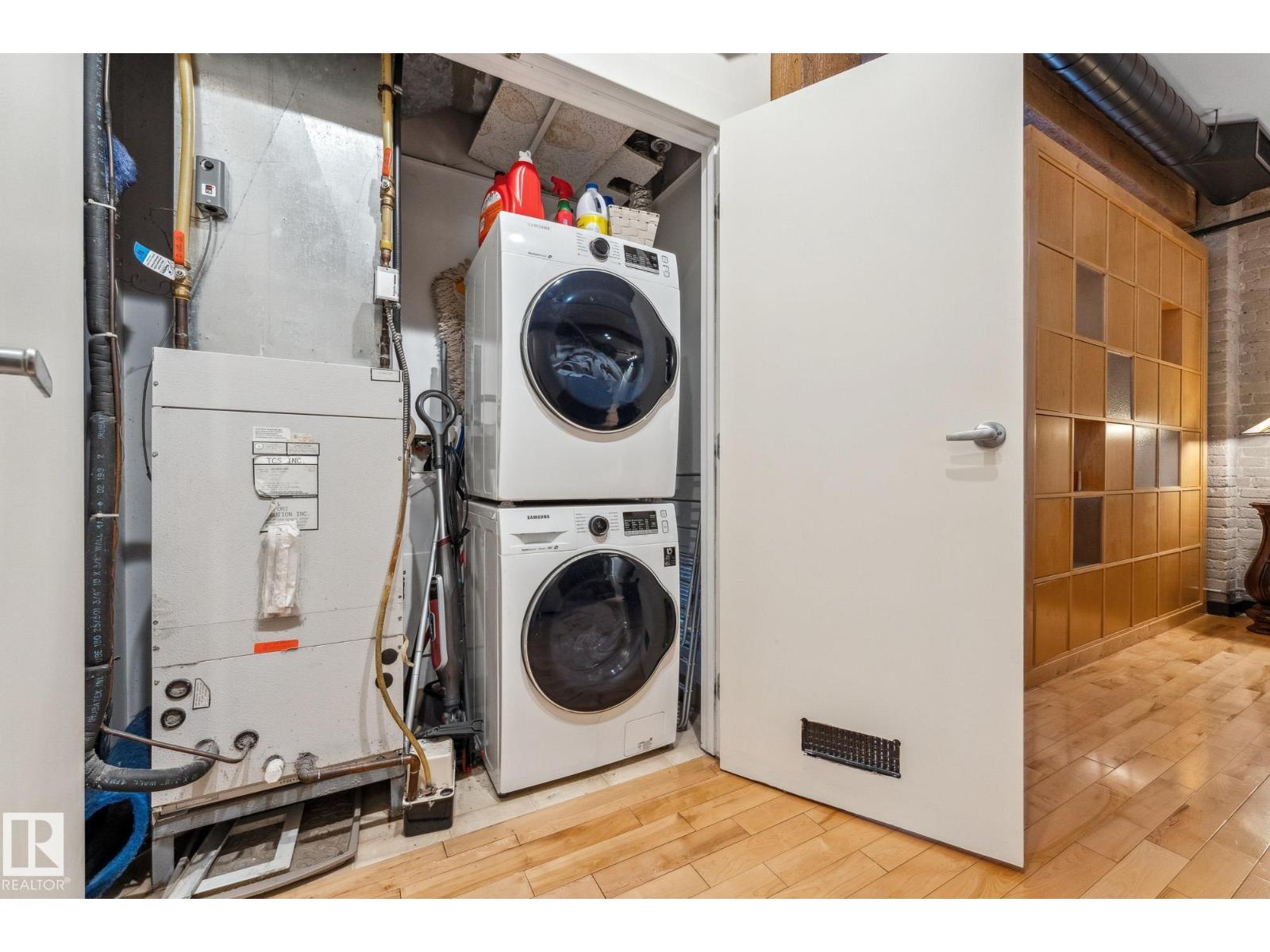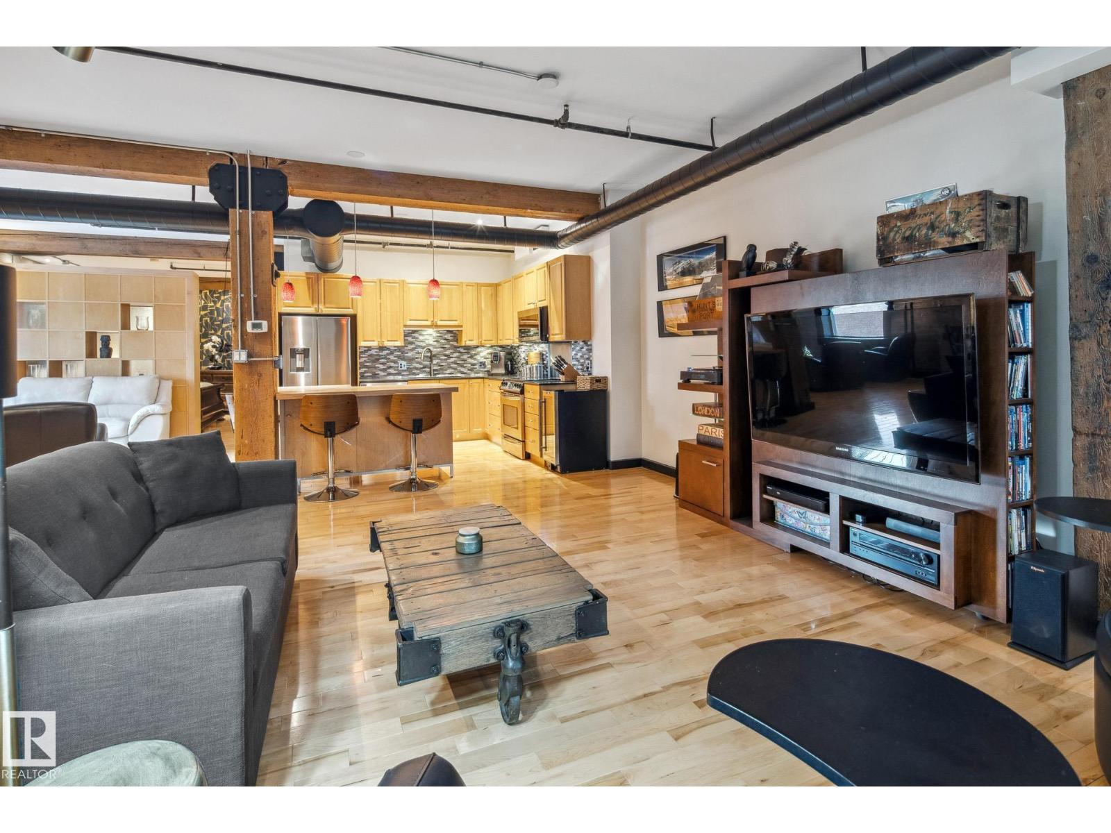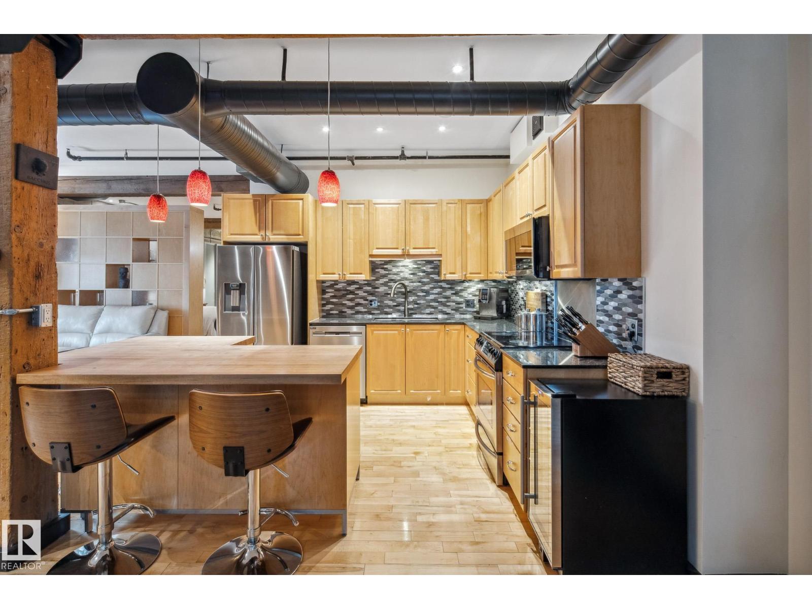 Quintessential Downtown Loft with Amazing Exposed Brick and Wood! This beautifully open concept and modernized one bedroom and den has been upgraded throughout boasting gleaming hardwood floors, custom built sliding steel doors, custom storage wall providing privacy and cupboard space to the master bedroom, 9’+ ceilings, central air conditioning (only certain units in building have it), underground parking (only certain units in building have it as well) and a storage cage that can be rented from the complex. Phillips Lofts is a historic building that is completely non-smoking, is pet friendly, and features a roof top patio as well. At over 1,500 sq/ft and situated in the absolute heart of Downtown’s 104 Street next to amazing restaurants, pubs, wine bars, coffee shops, the summertime outdoor market, and Rogers Place, this transcendent home is truly a must see! (id:63190)