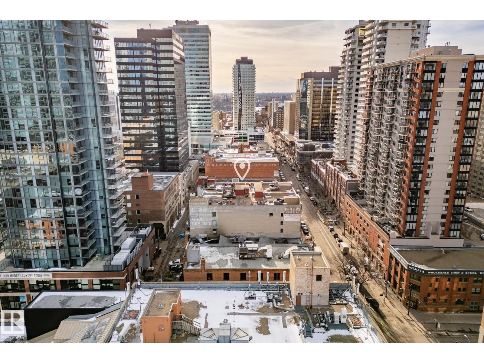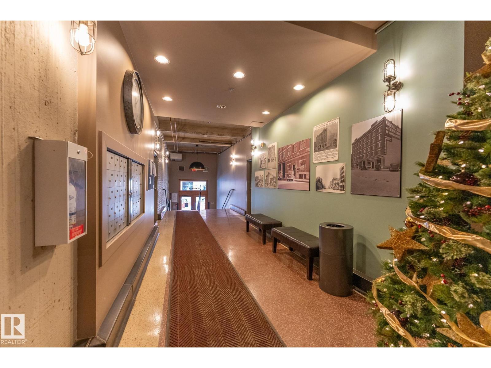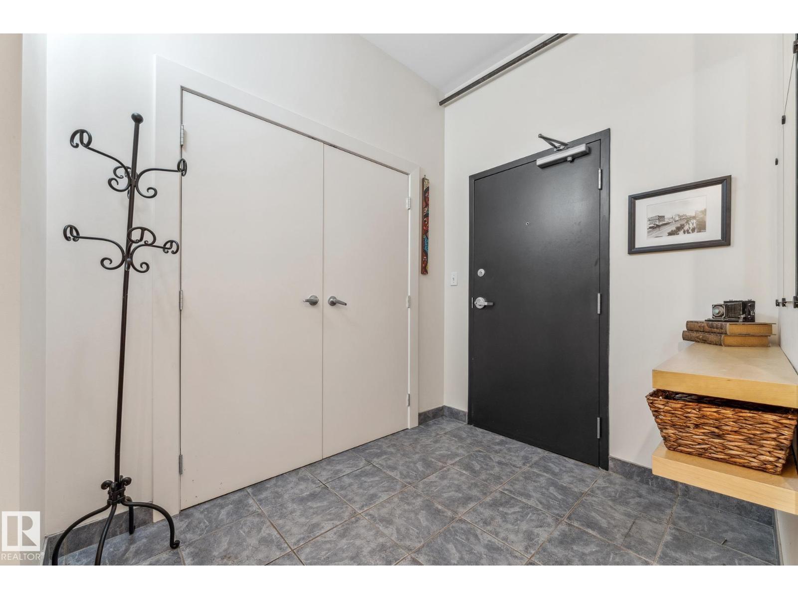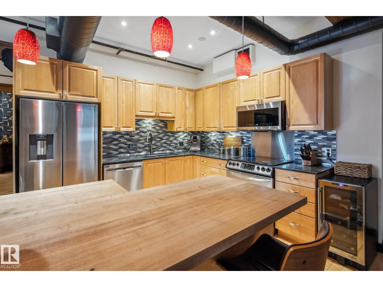 Quintessential Downtown Loft with Amazing Exposed Brick and Wood! This beautifully open concept and modernized one bedroom and den has been upgraded throughout boasting gleaming hardwood floors, custom built sliding steel doors, custom storage wall providing privacy and cupboard space to the master bedroom, 9’+ ceilings, central air conditioning (only certain units in building have it), underground parking (only certain units in building have it as well) and a storage cage that can be rented from the complex. Phillips Lofts is a historic building that is completely non-smoking, is pet friendly, and features a roof top patio as well. At over 1,500 sq/ft and situated in the absolute heart of Downtown’s 104 Street next to amazing restaurants, pubs, wine bars, coffee shops, the summertime outdoor market, and Rogers Place, this transcendent home is truly a must see! (id:63190)