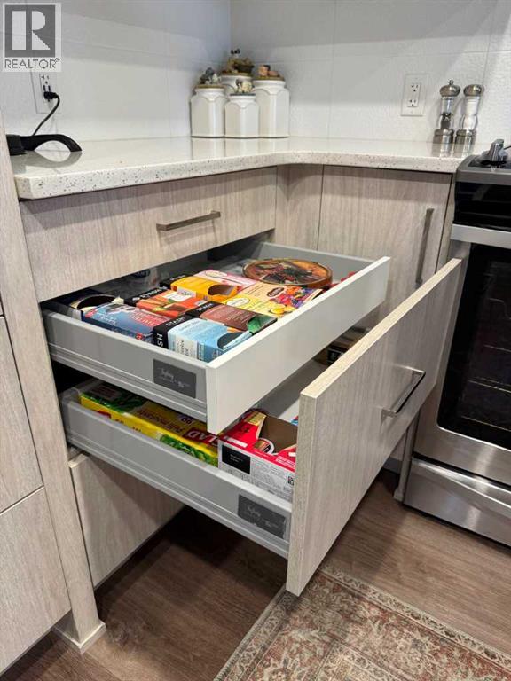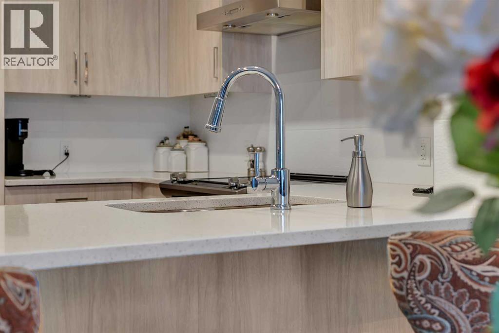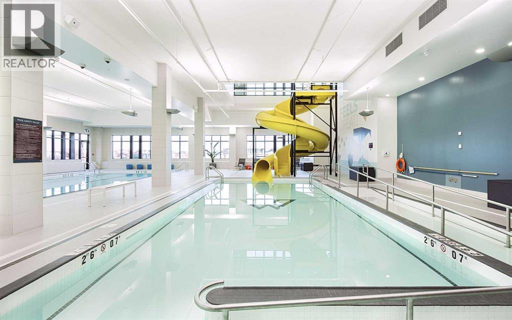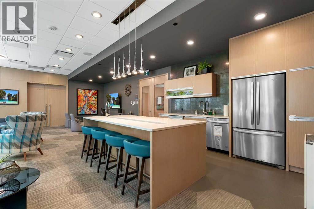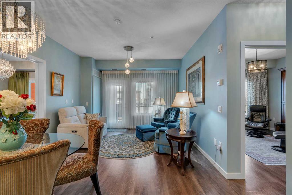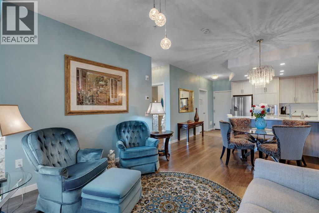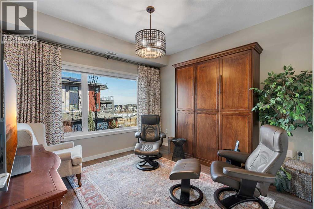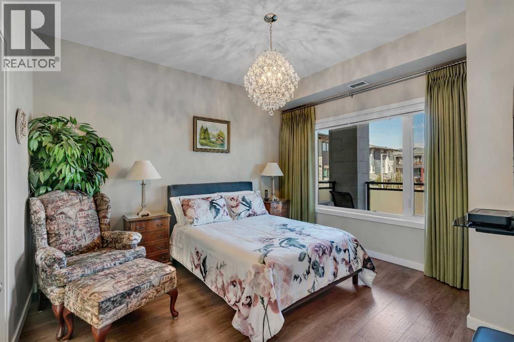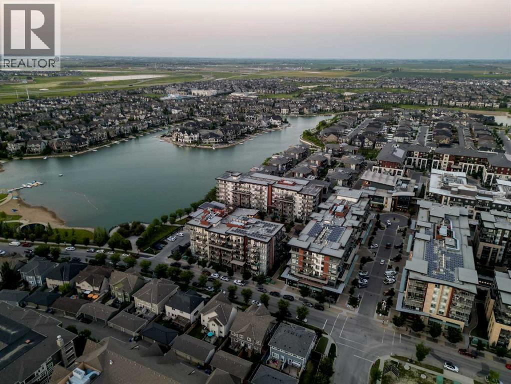 **ADULT LIVING** Welcome to resort-style living in Westman Village, located in Calgary’s sought-after lakeside community of Mahogany. This pristine, nearly 1,000 sq. ft. 2-bedroom, 2-bathroom condo in the exclusive 55+ building offers a bright, open-concept layout with full wheelchair accessibility, including wide hallways and mobility-friendly bathrooms.The modern kitchen features quartz countertops, multiple deep drawers, an appliance garage, high-end stainless steel appliances, and an eat-up island, flowing seamlessly into the living and dining areas. The spacious primary bedroom includes a walk-in closet and a 3-piece ensuite, while the second bedroom—complete with a Murphy bed—is ideal for guests, a TV room, or a home office. Elegantly appointed with custom light fixtures and draperies, this immaculate home is waiting for you. Additional highlights include air conditioning, a large laundry room, ample in-unit storage, titled secure, underground parking (additional stalls are available for purchase), and a storage locker. Enjoy the beautiful sunrise and views of Mahogany Lake. A perfect place to “people watch” as they walk along the pathways, enjoying nature. The large balcony provides plenty of private outdoor living space. The orientation of this unit means you aren’t baking in the sun, but still enjoy an abundance of natural light.You can access the Westman Village Centre without going outside (this home is on the same floor as the +15 walkway to the amenities building), where you can purchase pre-made dinners if you don’t want to cook, your morning coffee, and other snacks, while enjoying the vast amenities that come with living here. Residents have access to the 40,000 sq. ft. Village Centre via +15, offering an indoor pool, fitness centre, walking track, theatre, golf simulator, and more. Concierge service and 24/7 security provide added peace of mind. You are only steps to Mahogany Lake, Beach Club, walking paths along the Lake, shops, and nearby ame nities. There is no other complex in the city that compares to Westman Village! (id:63190)