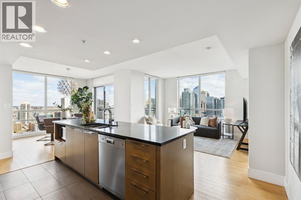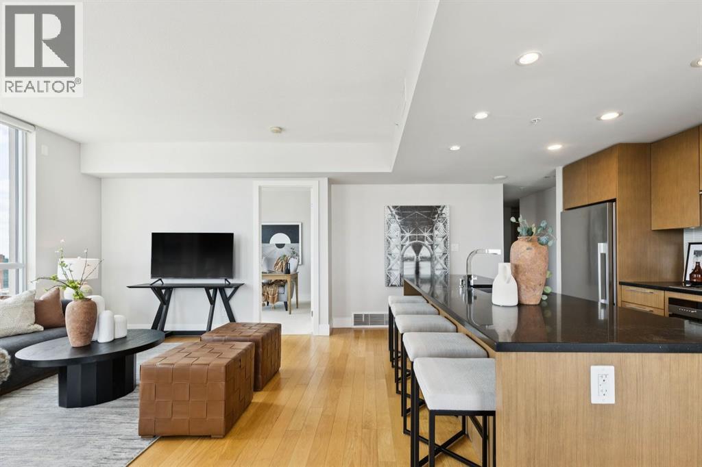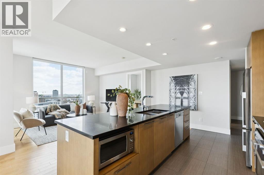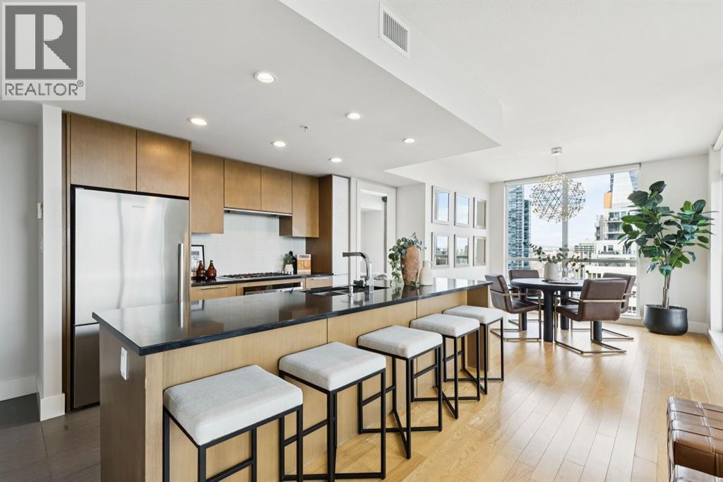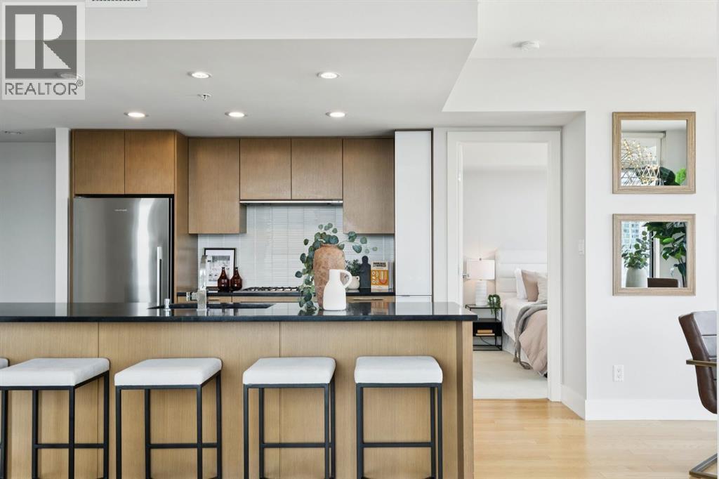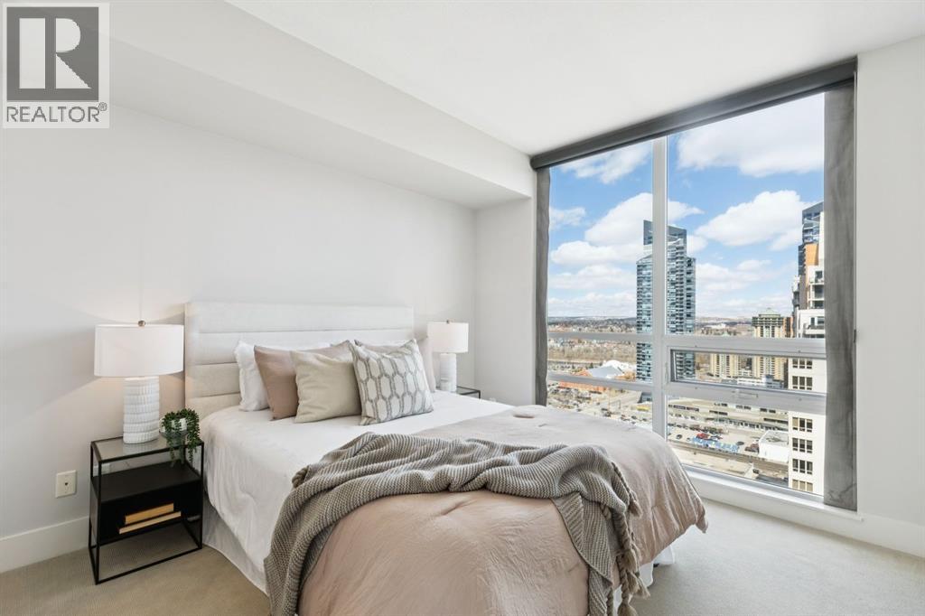 Experience elevated urban living in this stylish LUNA residence, where panoramic views stretch from the dazzling downtown skyline across North Hill, the Bow River valley, C.O.P., and out to the Rocky Mountains. Designed with one of the most sought after layouts, this bright and modern 2 bed/2 bath suite places the bedrooms on opposite sides for optimal privacy, with an open concept kitchen, living, and dining area at its heart. Flooded with natural light from floor-to-ceiling windows, the home exudes warmth while maintaining a sleek, contemporary aesthetic. The well equipped kitchen showcases warm wood cabinetry, black quartz counters, a glass backsplash, and premium stainless steel appliances including Fisher & Paykel refrigerator, gas cooktop, and oven, and a Blomberg dishwasher. A spacious island with seating flows seamlessly into the dining area, which opens onto a glass-railed balcony that's perfect for soaking in breathtaking panoramic views. The primary retreat offers a custom walk-through closet leading to a luxurious 5pc ensuite featuring in-floor heating, a deep soaker tub, and a separate shower. The second bedroom is equally well appointed with dual closets and convenient access to a 3pc cheater ensuite. Thoughtful touches like custom blackout blinds, air conditioning, in-suite laundry, and additional in-suite storage ensure everyday comfort and convenience. Residents of LUNA enjoy an exceptional array of amenities including a fully equipped gym, yoga studio, steam spa, party room, guest suites, concierge service, visitor parking, and a serene outdoor zen garden with fireplace. Located in the heart of the vibrant Beltline, you’re just steps from shopping, dining, the Bow River pathways, and everyday essentials. Complete with a storage locker (Level 3 #316) and underground parking (P1 #L28) this home offers the perfect blend of luxury, functionality, and unbeatable inner-city lifestyle. (id:63190)