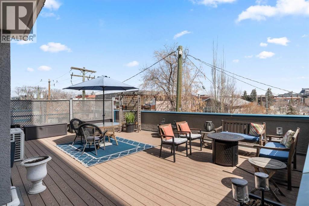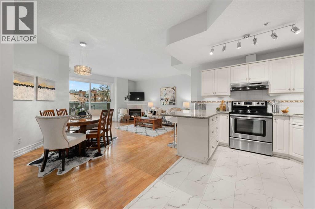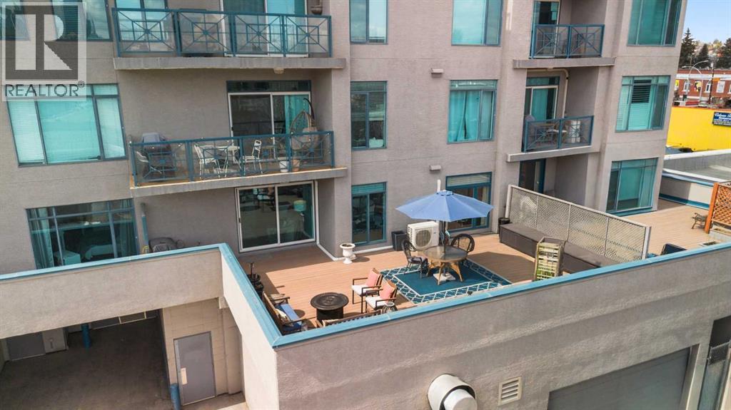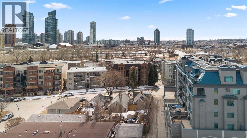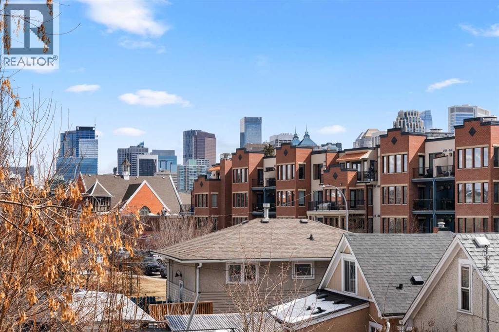 Rare opportunity to live in privacy on the quiet east side of Kensington Mews!! DOWNTOWN VIEWS, and over 700 sf. of patio space....one of the largest in the area! Exceptional unit has been meticulously maintained by longtime owners. Updated features include new paint throughout, granite counters, custom window coverings, AC units in living room and master bedroom, new composite decking on patio. Floorplan is excellent with room for dining, casual eating on the breakfast bar, tons of seating in living room, corner fireplace, laundry/ pantry.....massive primary bedroom with east facing reading nook and large closets, second bedroom includes murphy bed and converts handily to office.....4 piece bath with cheater door into master. Living room opens to gorgeous patio with gas BBQ hookup. Host your entire family and friends!! This CONCRETE building is quiet and cool! Building also includes titled parking stall, lots of visitor parking, secure storage room, locked bike room and well-equipped gym. Well managed condo corporation with low monthly fees....pet friendly with no weight restriction with approval. Stroll outside your door along the river pathways, down the street in Kensington to all restaurants, pubs, cafes, hop on the LRT or walk 10 minutes downtown to work, get groceries, walk over to The Plaza Theatre.....location of this building is stellar at 96 walk score and 99 bike score. Calgary's coveted inner NW communities offer a lifestyle like no other!! It's a 10!!! (id:63190)