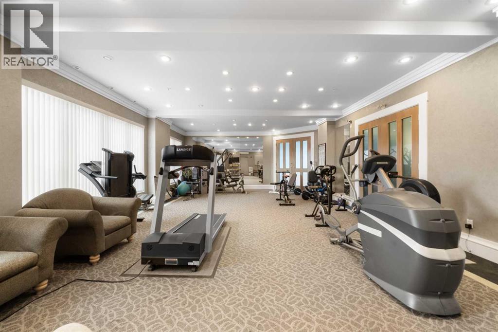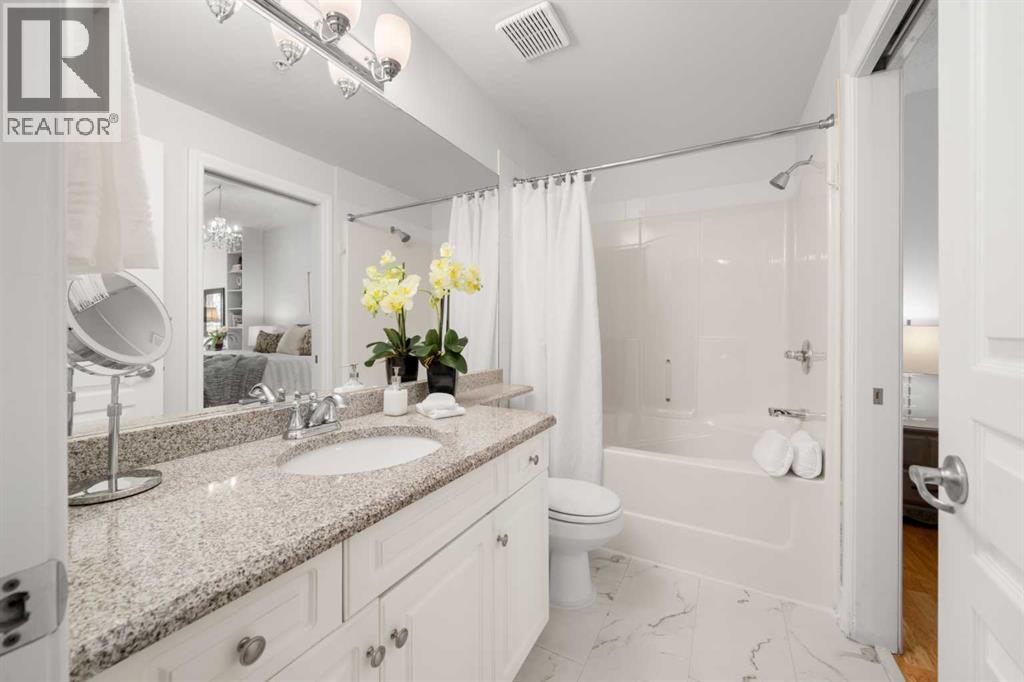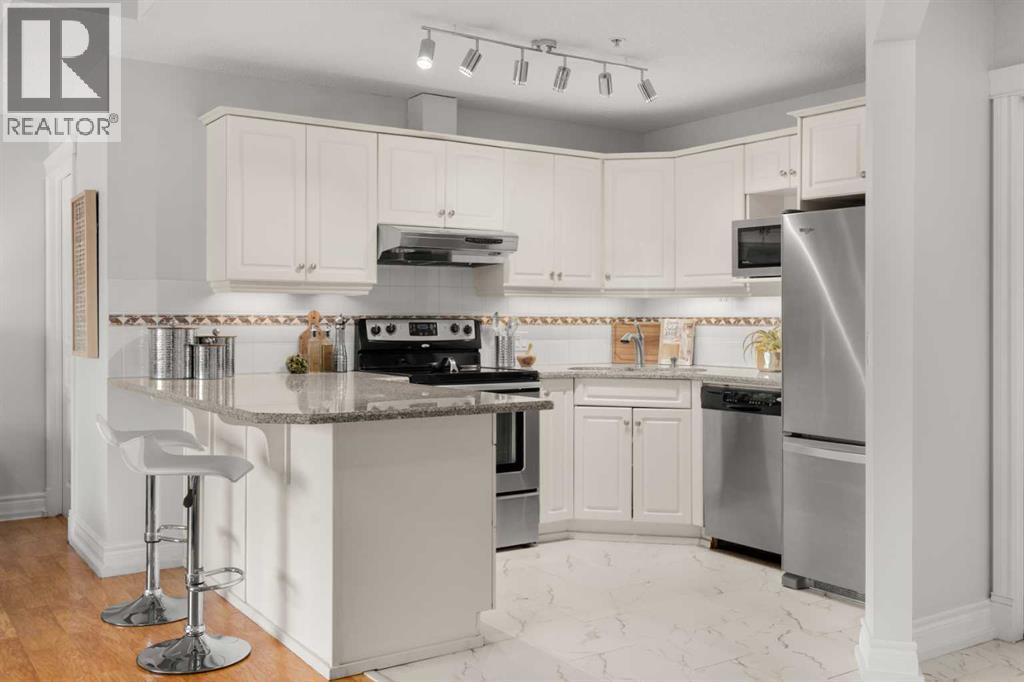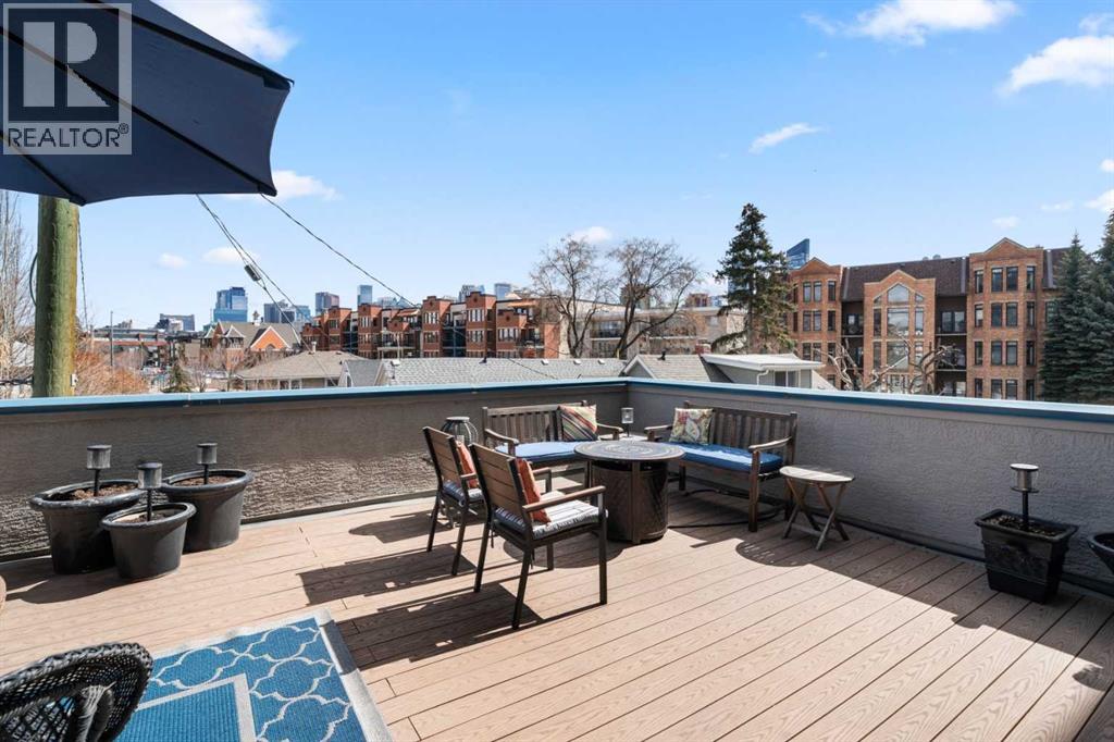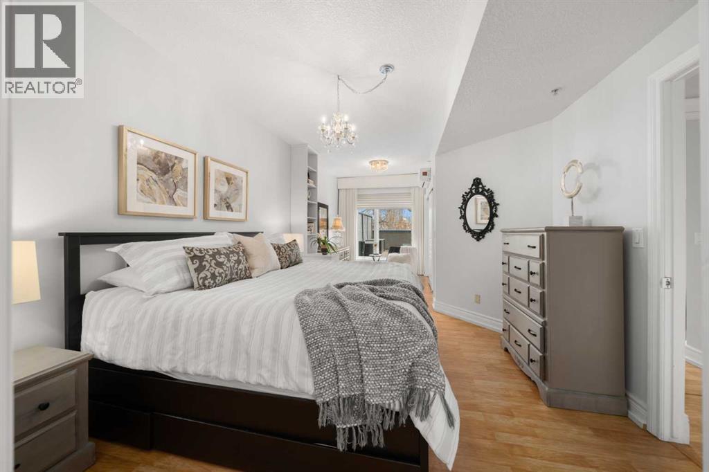 Rare opportunity to live in privacy on the quiet east side of Kensington Mews!! DOWNTOWN VIEWS, and over 700 sf. of patio space....one of the largest in the area! Exceptional unit has been meticulously maintained by longtime owners. Updated features include new paint throughout, granite counters, custom window coverings, AC units in living room and master bedroom, new composite decking on patio. Floorplan is excellent with room for dining, casual eating on the breakfast bar, tons of seating in living room, corner fireplace, laundry/ pantry.....massive primary bedroom with east facing reading nook and large closets, second bedroom includes murphy bed and converts handily to office.....4 piece bath with cheater door into master. Living room opens to gorgeous patio with gas BBQ hookup. Host your entire family and friends!! This CONCRETE building is quiet and cool! Building also includes titled parking stall, lots of visitor parking, secure storage room, locked bike room and well-equipped gym. Well managed condo corporation with low monthly fees....pet friendly with no weight restriction with approval. Stroll outside your door along the river pathways, down the street in Kensington to all restaurants, pubs, cafes, hop on the LRT or walk 10 minutes downtown to work, get groceries, walk over to The Plaza Theatre.....location of this building is stellar at 96 walk score and 99 bike score. Calgary's coveted inner NW communities offer a lifestyle like no other!! It's a 10!!! (id:63190)