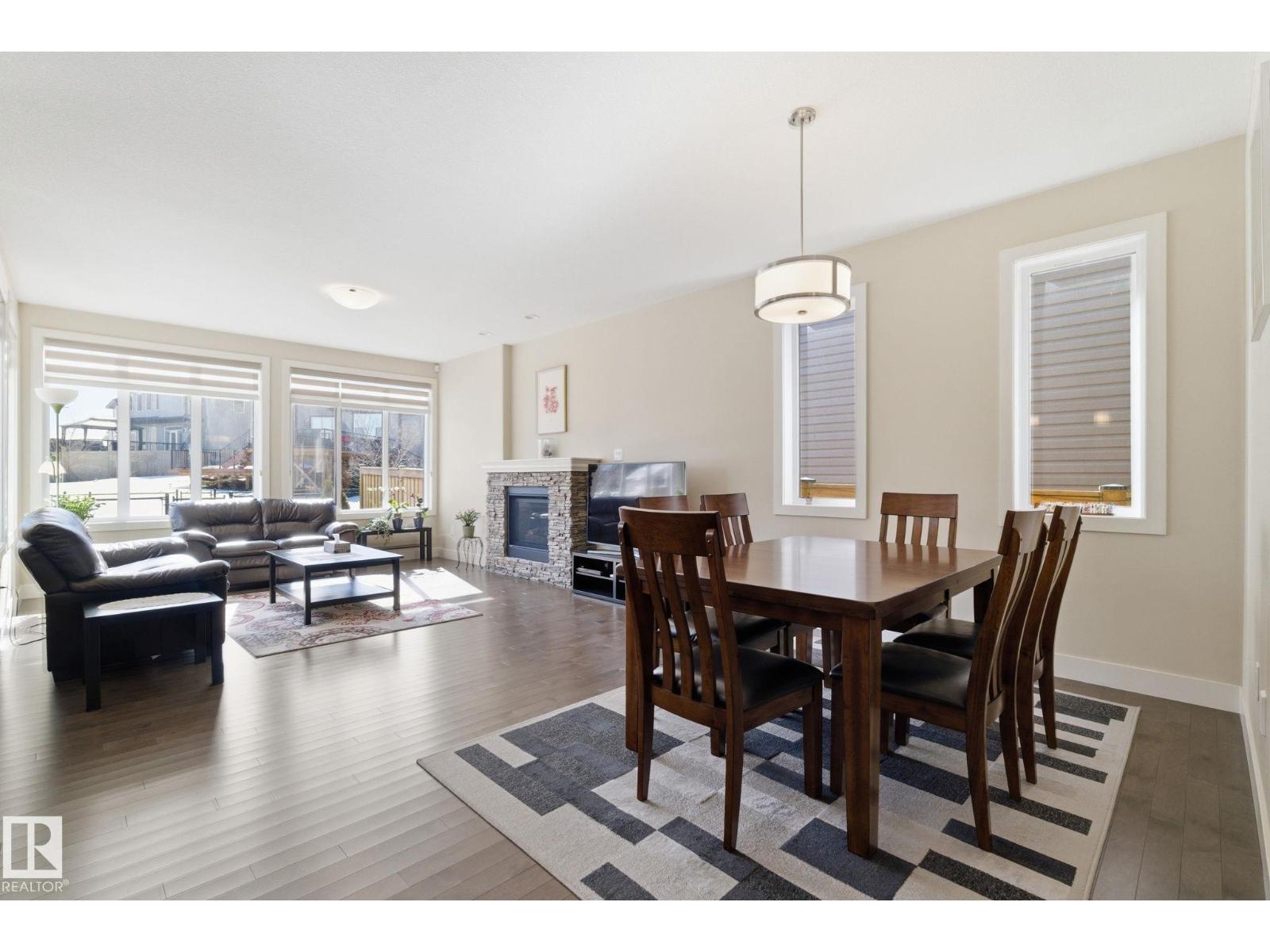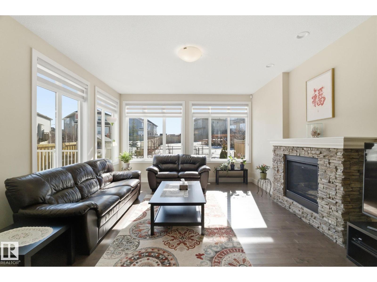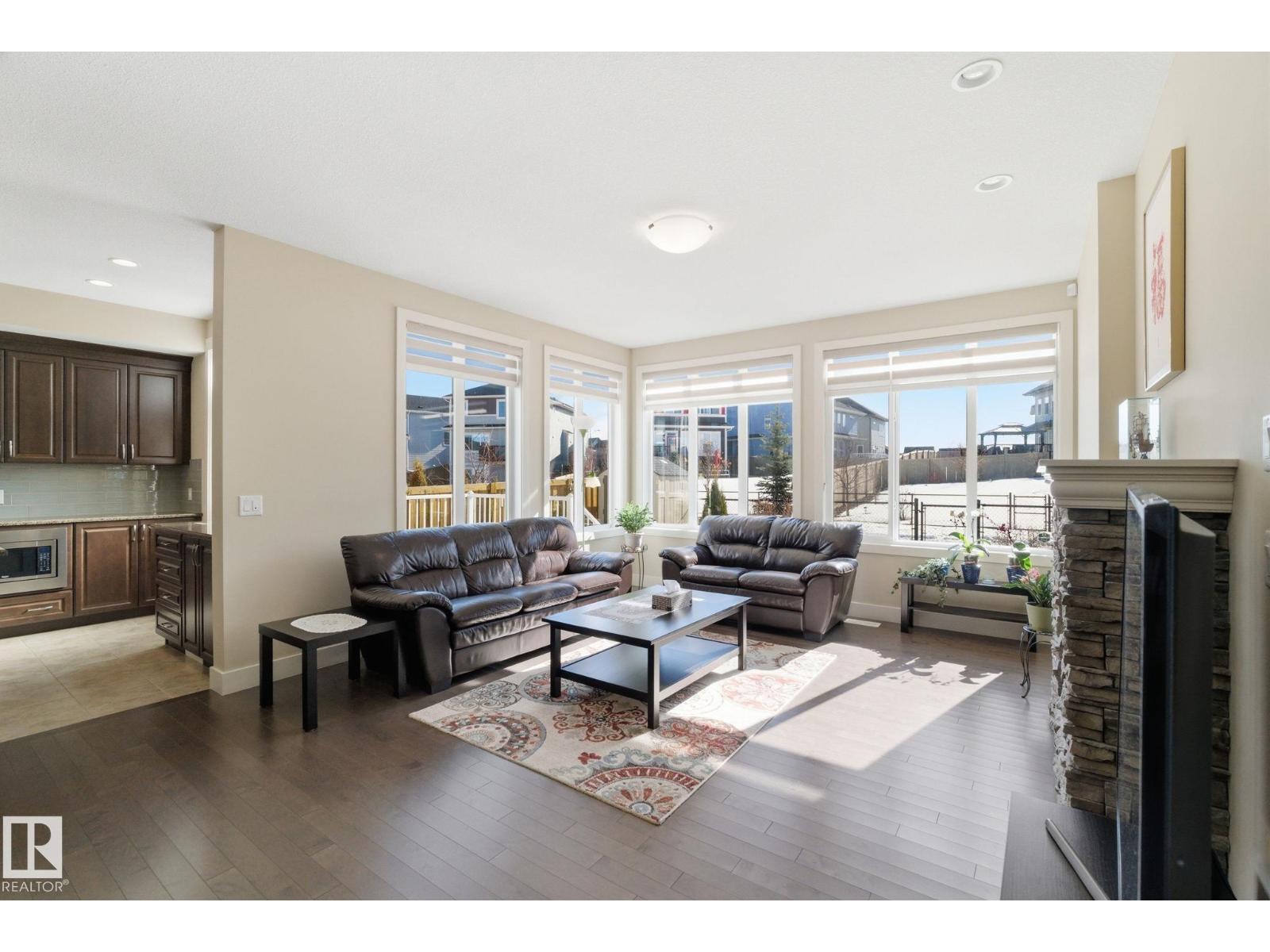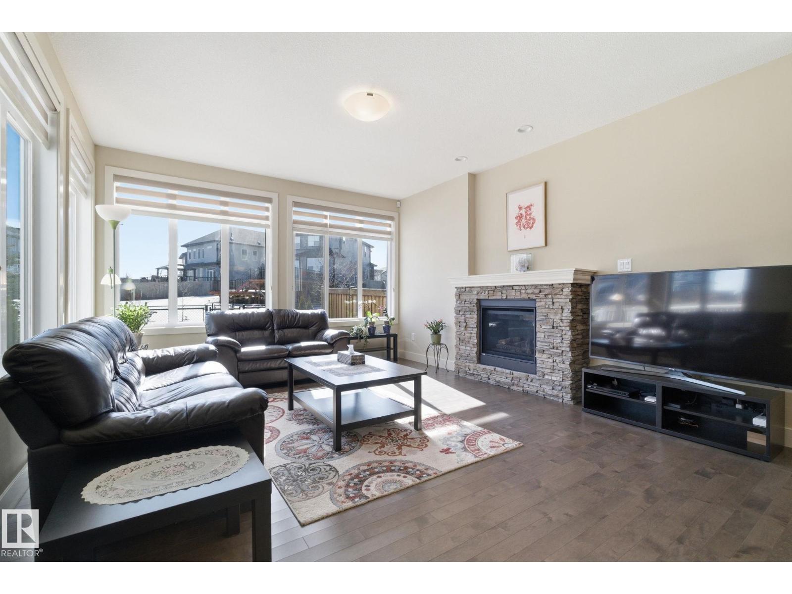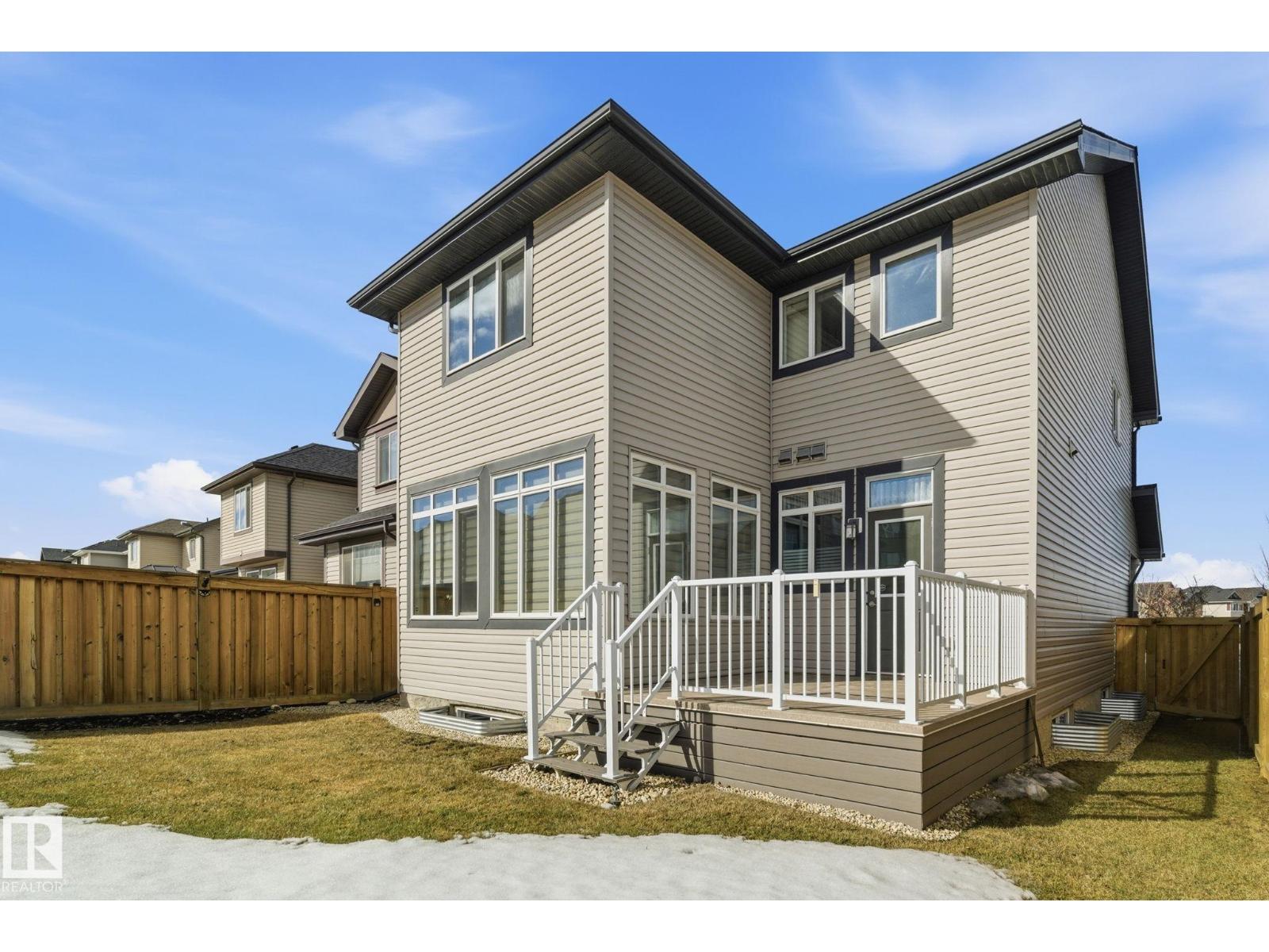 Welcome to this beautiful 2-storey home in Allard offering 2,389 sq ft of well-designed living space. The main floor features an open layout with a spacious kitchen complete with a large island, walk-in pantry, upgraded cabinetry, and granite countertops throughout. The living room includes a modern gas fireplace with a stylish stone surround, along with custom privacy blinds. A main floor bedroom and convenient half bath add flexibility. Upstairs offers a bonus room, two additional bedrooms, and a primary retreat with large windows and a spa-inspired ensuite featuring a corner soaker tub, glass shower, dual sinks, and a walk-in closet. Upper-level laundry with sink adds convenience. The south-facing backyard backs onto a walking path leading to a park & pond, and includes a deck, shed, and full landscaping. Additional highlights include a fully finished garage with epoxy flooring, gate in the backyard to the walking path, with easy access to Anthony Henday, airport, schools, shopping & amenities. (id:63190)