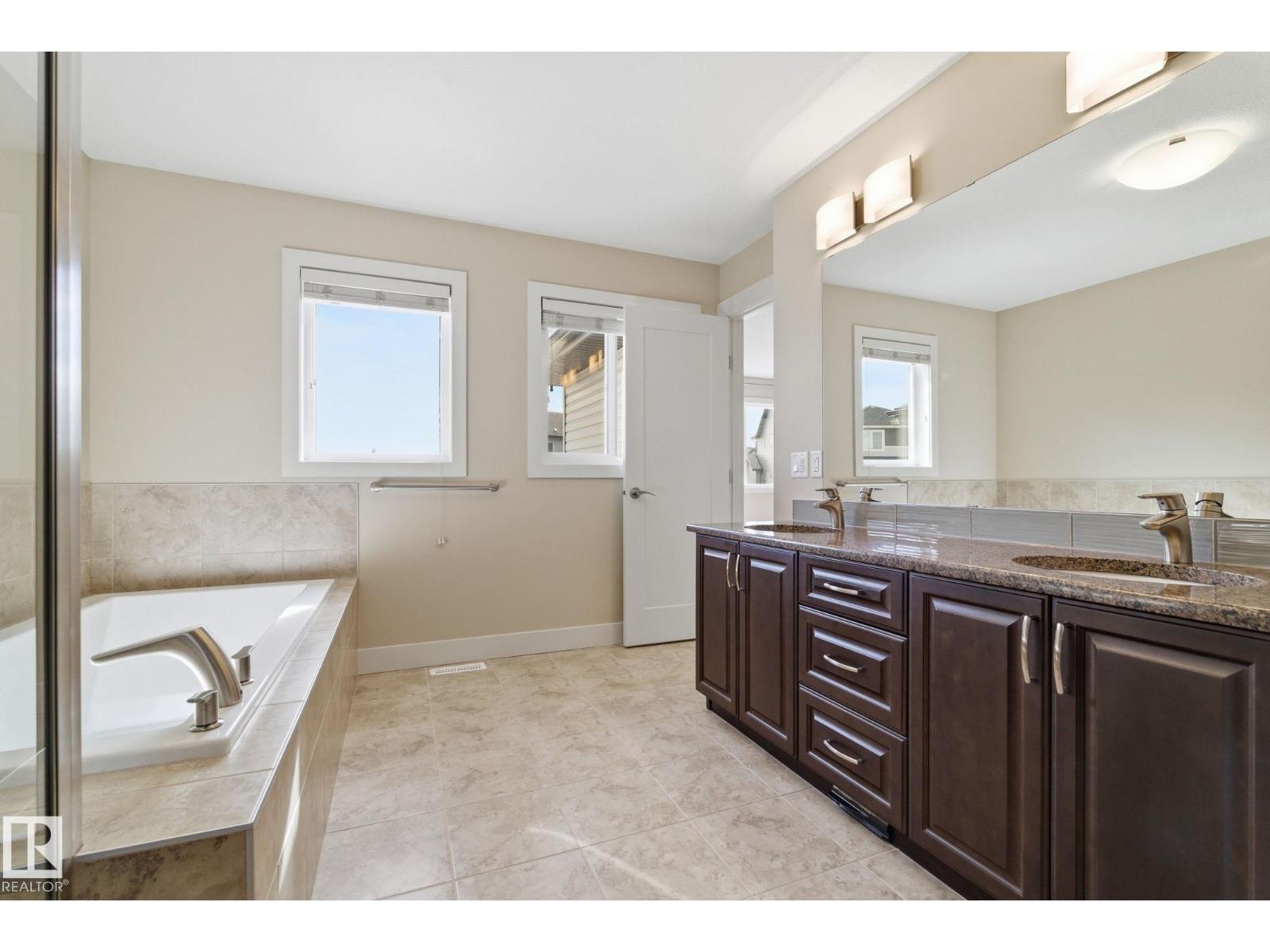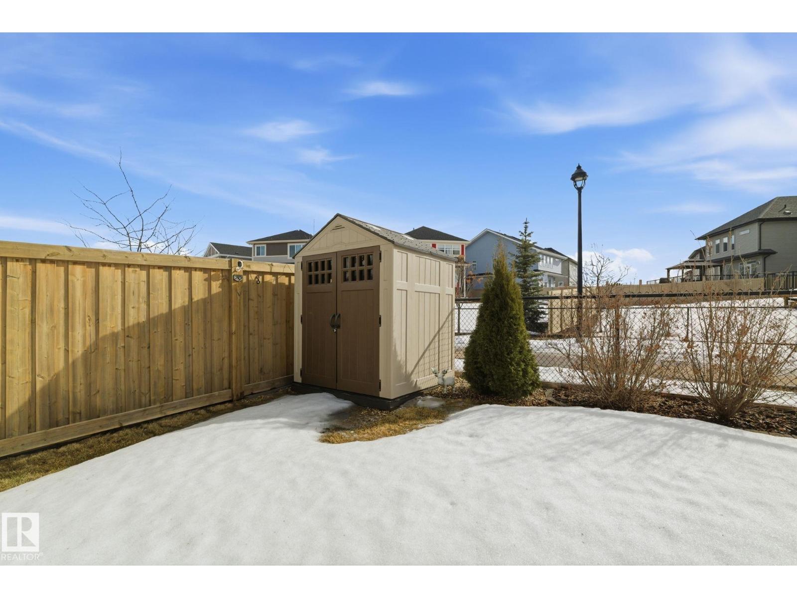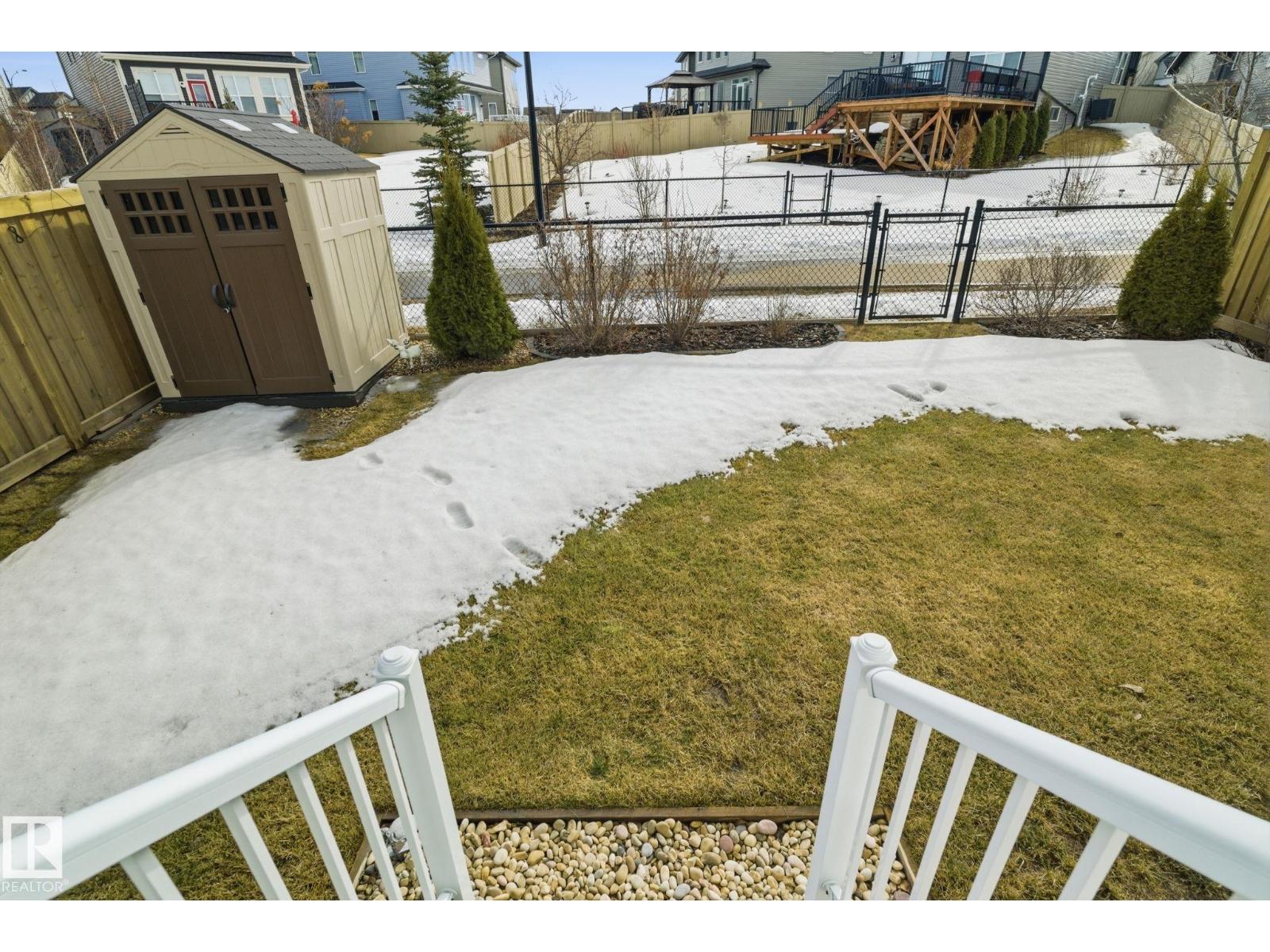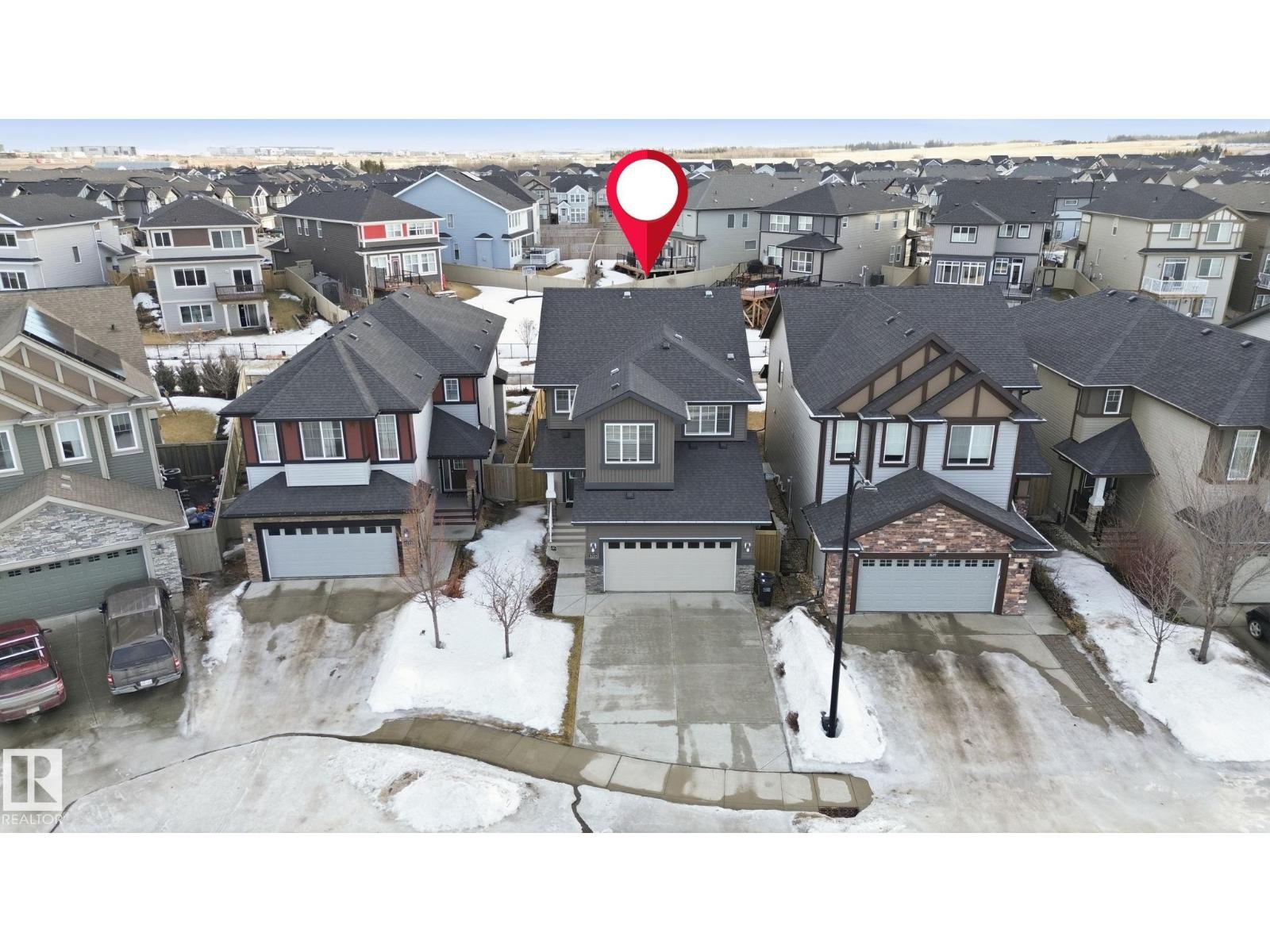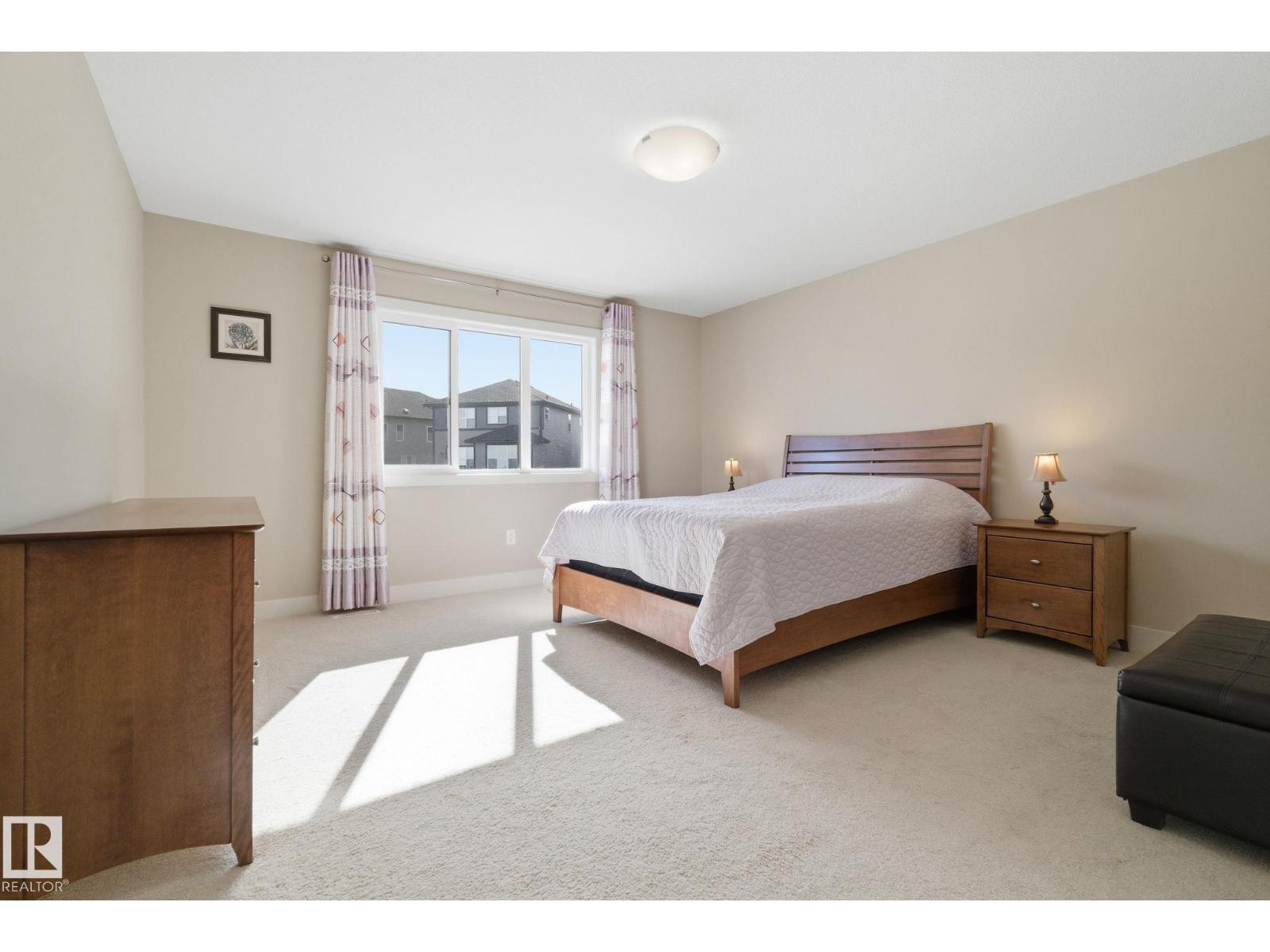 Welcome to this beautiful 2-storey home in Allard offering 2,389 sq ft of well-designed living space. The main floor features an open layout with a spacious kitchen complete with a large island, walk-in pantry, upgraded cabinetry, and granite countertops throughout. The living room includes a modern gas fireplace with a stylish stone surround, along with custom privacy blinds. A main floor bedroom and convenient half bath add flexibility. Upstairs offers a bonus room, two additional bedrooms, and a primary retreat with large windows and a spa-inspired ensuite featuring a corner soaker tub, glass shower, dual sinks, and a walk-in closet. Upper-level laundry with sink adds convenience. The south-facing backyard backs onto a walking path leading to a park & pond, and includes a deck, shed, and full landscaping. Additional highlights include a fully finished garage with epoxy flooring, gate in the backyard to the walking path, with easy access to Anthony Henday, airport, schools, shopping & amenities. (id:63190)