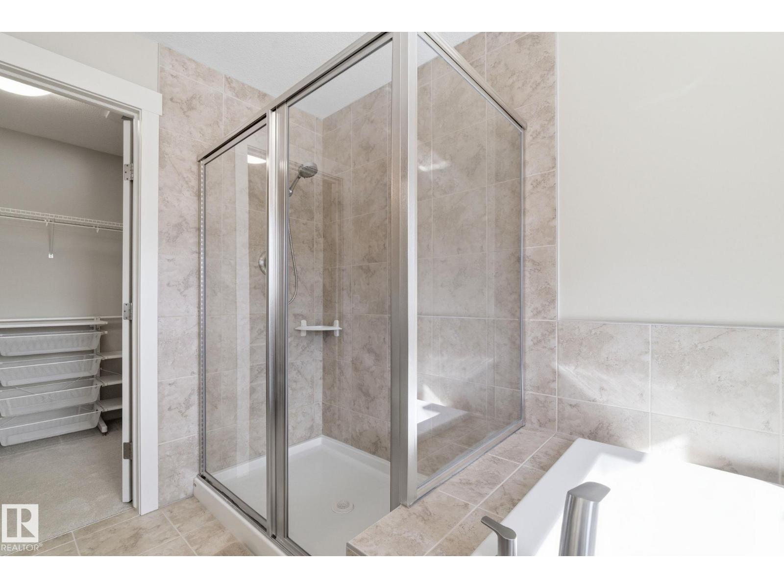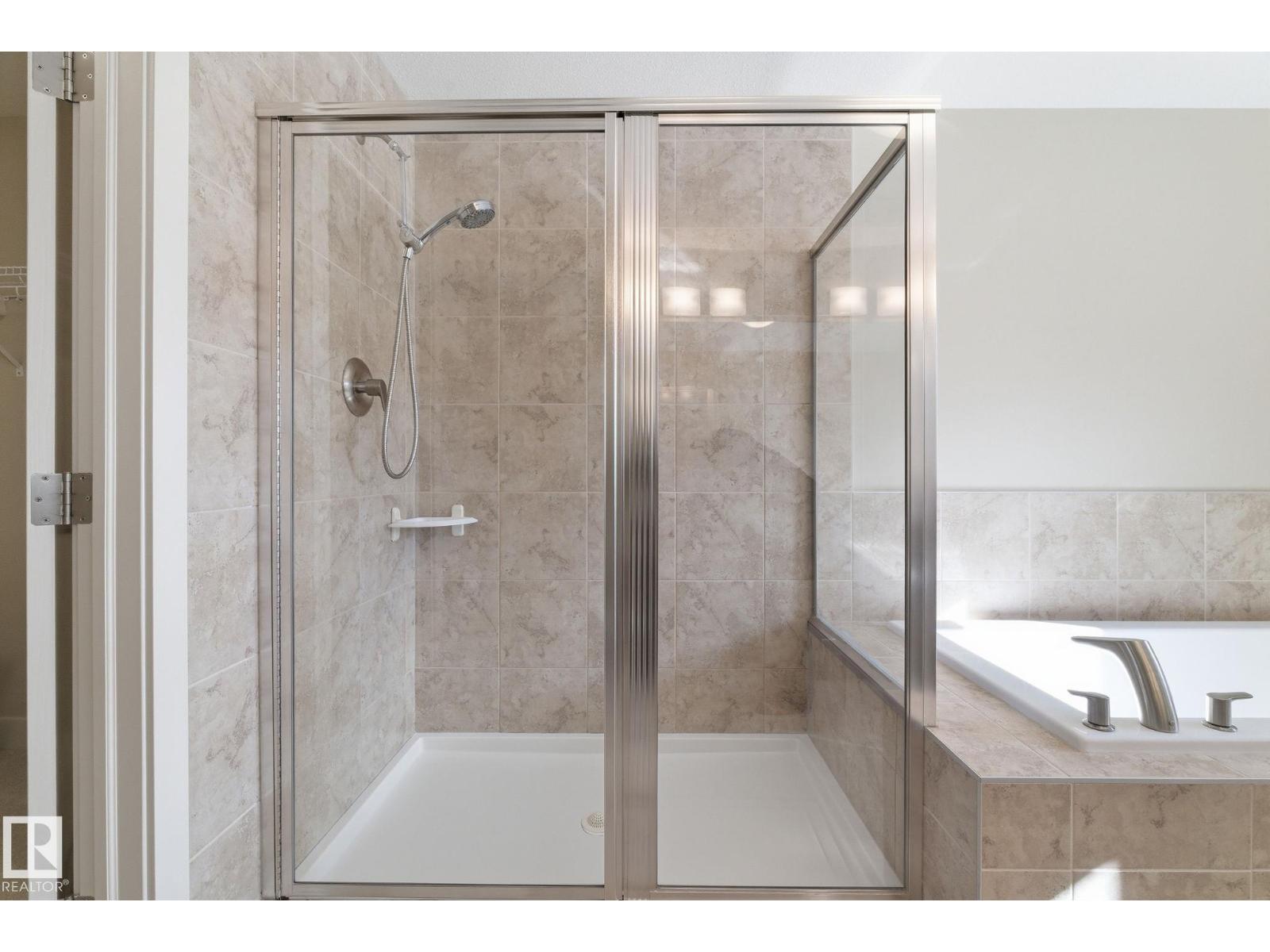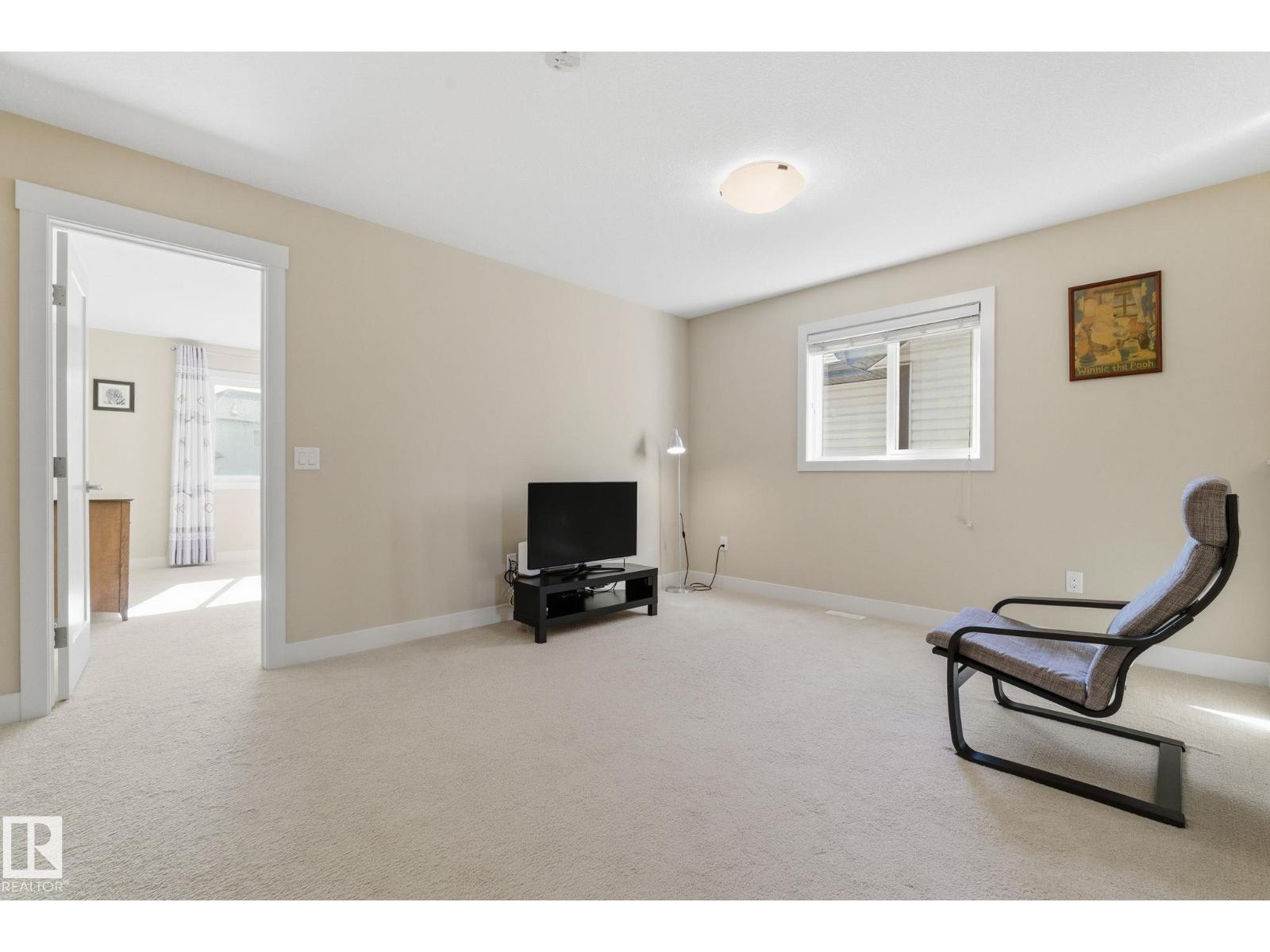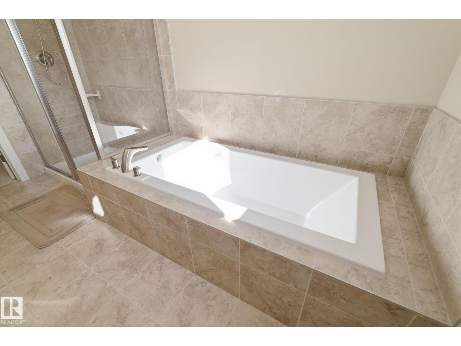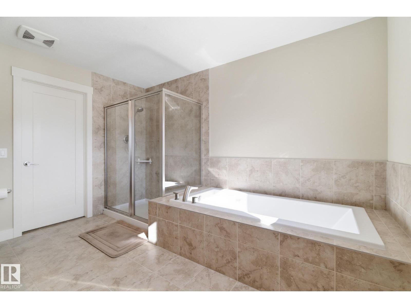 Welcome to this beautiful 2-storey home in Allard offering 2,389 sq ft of well-designed living space. The main floor features an open layout with a spacious kitchen complete with a large island, walk-in pantry, upgraded cabinetry, and granite countertops throughout. The living room includes a modern gas fireplace with a stylish stone surround, along with custom privacy blinds. A main floor bedroom and convenient half bath add flexibility. Upstairs offers a bonus room, two additional bedrooms, and a primary retreat with large windows and a spa-inspired ensuite featuring a corner soaker tub, glass shower, dual sinks, and a walk-in closet. Upper-level laundry with sink adds convenience. The south-facing backyard backs onto a walking path leading to a park & pond, and includes a deck, shed, and full landscaping. Additional highlights include a fully finished garage with epoxy flooring, gate in the backyard to the walking path, with easy access to Anthony Henday, airport, schools, shopping & amenities. (id:63190)
