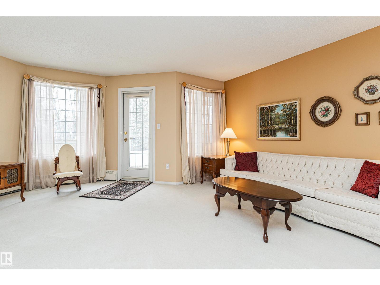 Amazing location for this 1,347 sq' 2 bedroom, 2 bathroom, ground floor, adult condo backing SW onto green space and Grandin Pond nature preserve, surrounded by natural forest. Easy access to the pond's paved trails and wildlife viewing platforms. This spacious age 55+ unit includes 2 titled U/G heated parking stalls, a storage locker & carwash bay. Large storage room and insuite laundry too. A bright kitchen features white cabinetry, pantry, tile backsplash, tile flooring & st/st appliances. The kitchen is open to the family room w skylight. Double french doors to dining & living room with garden door to a covered SW patio. Plant your own tomatoes & flowers in pots. The spacious Primary bedroom fits a king bed and has a walk in closet & 4 pc ensuite with tub + a separate enclosed shower stall. The 2nd bedroom accesses the main 4 pc bath. This well maintained complex features a huge central social hall with FP, abundant seating, tables, games areas & social gatherings. Elevators to parkade. Move in ready! (id:63190)