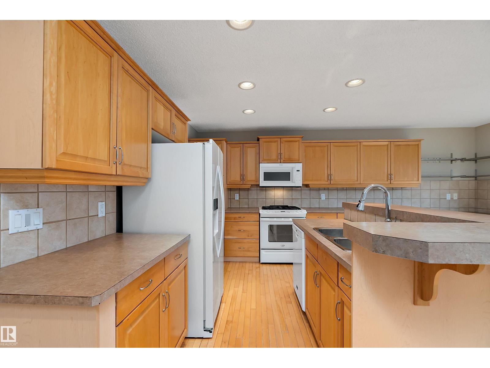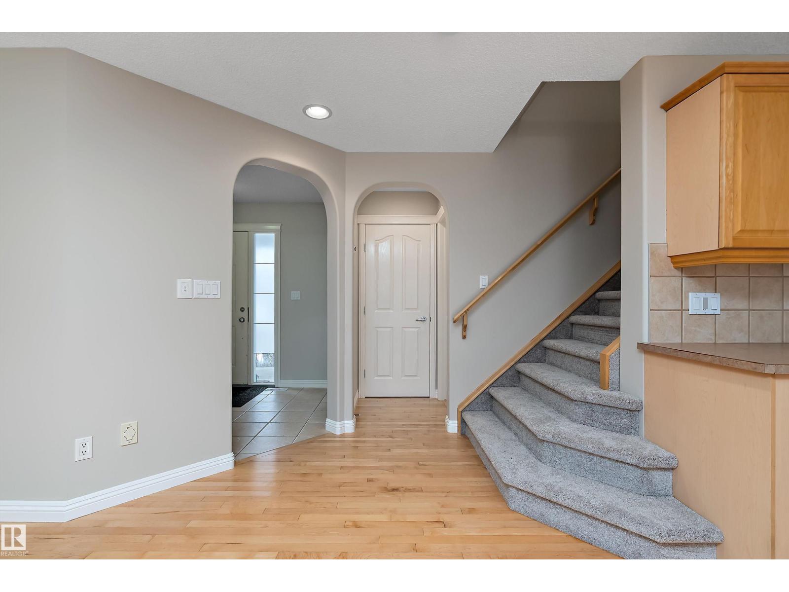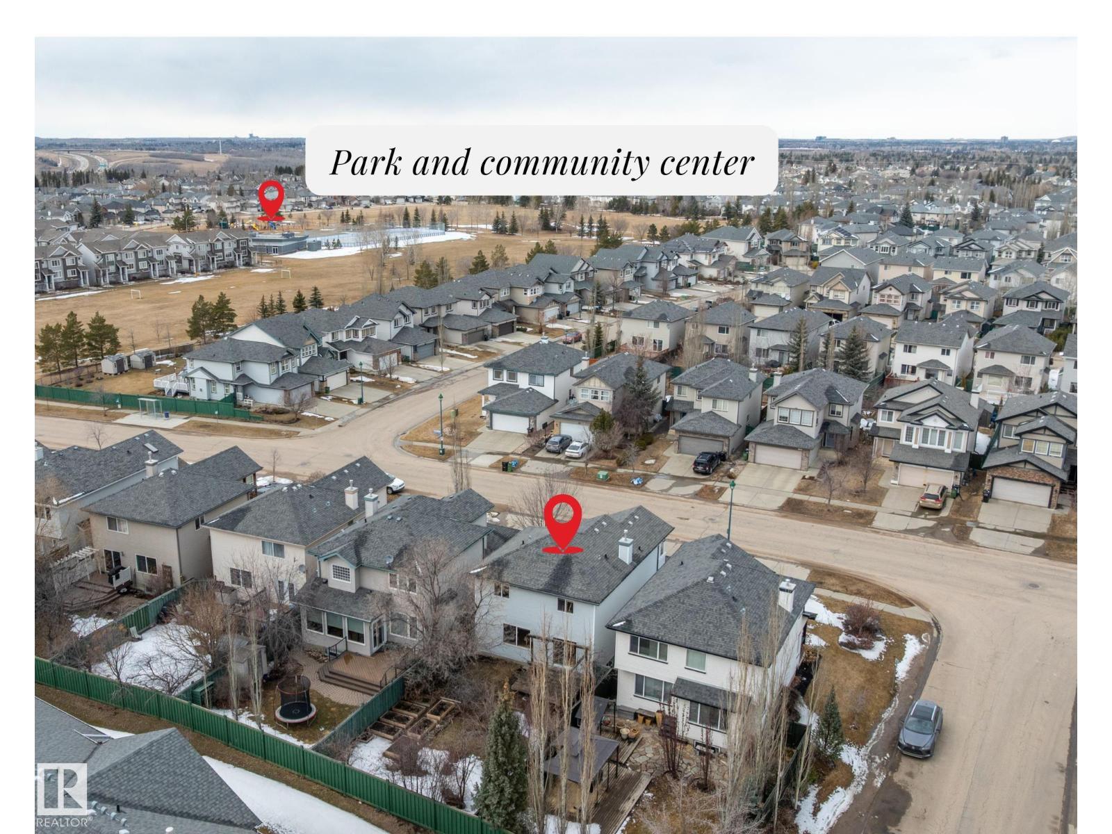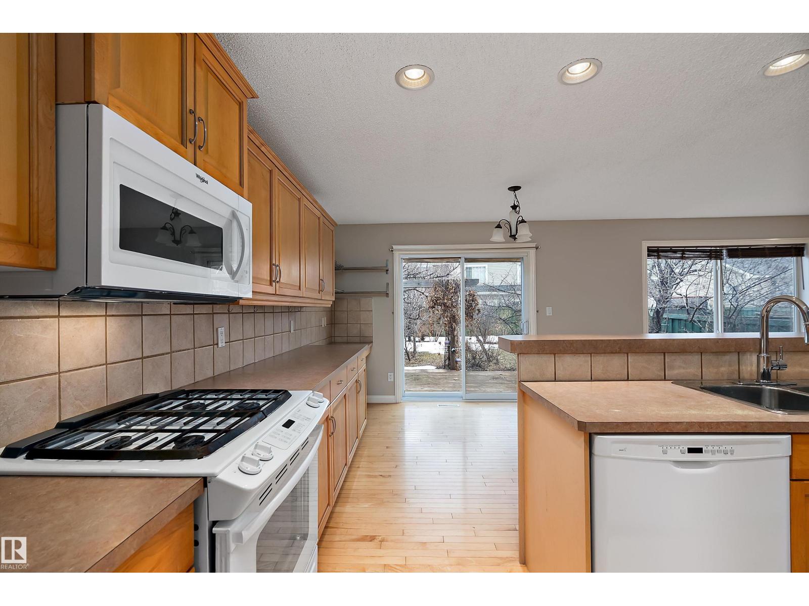 Welcome to Haddow one of Southwest Edmonton’s most sought-after communities. Just steps from Haddow Park, walking trails, & the community centre, this location’s hard to beat. This beautifully maintained two-storey with 1,800+ sq ft of upgraded, functional living space and has been freshly painted. From the moment you walk in, you’ll notice the warm maple hardwood, abundance of natural light, & a layout that just makes sense. The kitchen is a standout, featuring rich maple cabinetry, crown moulding, a large island with breakfast bar, & plenty of prep space. It flows seamlessly into the great room—perfect for everyday living or entertaining. Upstairs offers new carpet with premium underlay, a versatile bonus room, & a spacious primary with ensuite including soaker tub and separate shower. Two additional bedrooms & a full bath complete the level. Enjoy the private south-facing backyard with mature trees, gardens, & fruit. Central A/C included. Minutes to Windermere, trails, and Henday access. Move-in ready! (id:63190)
