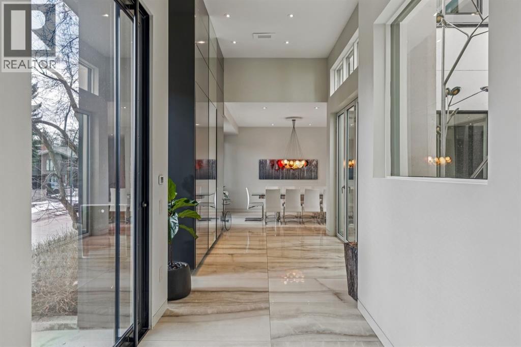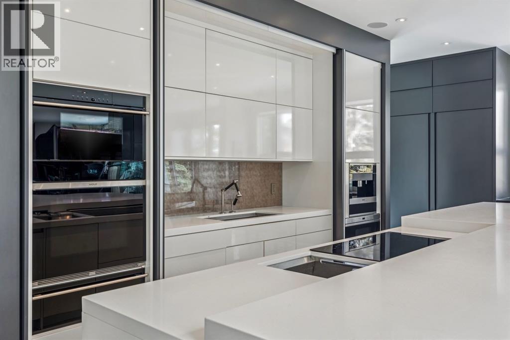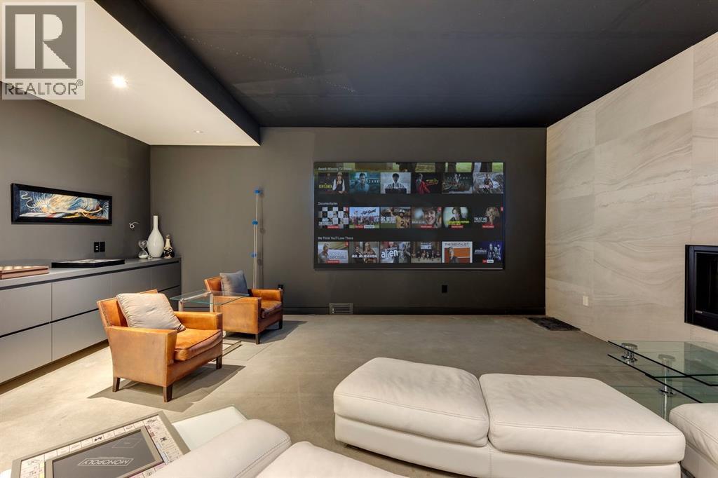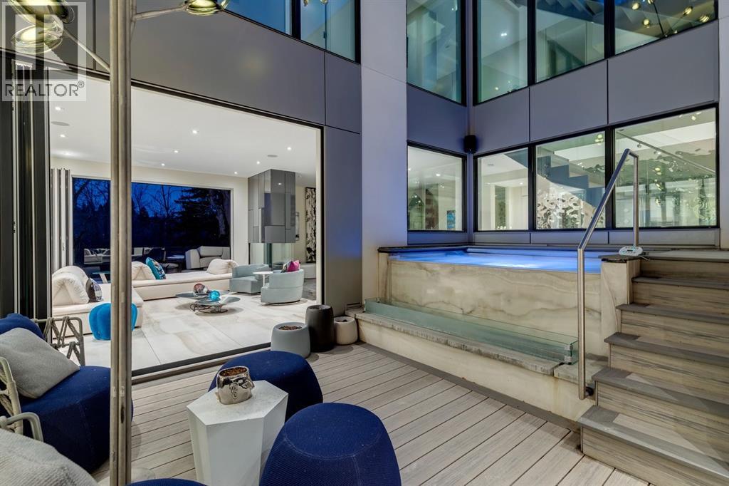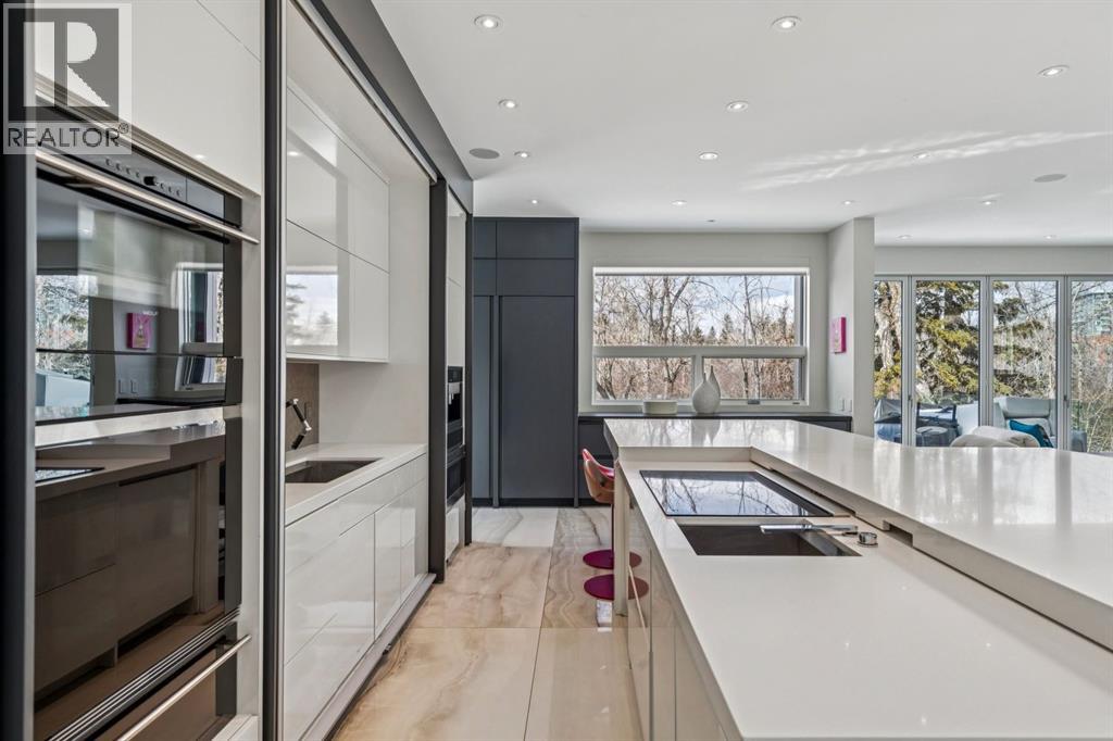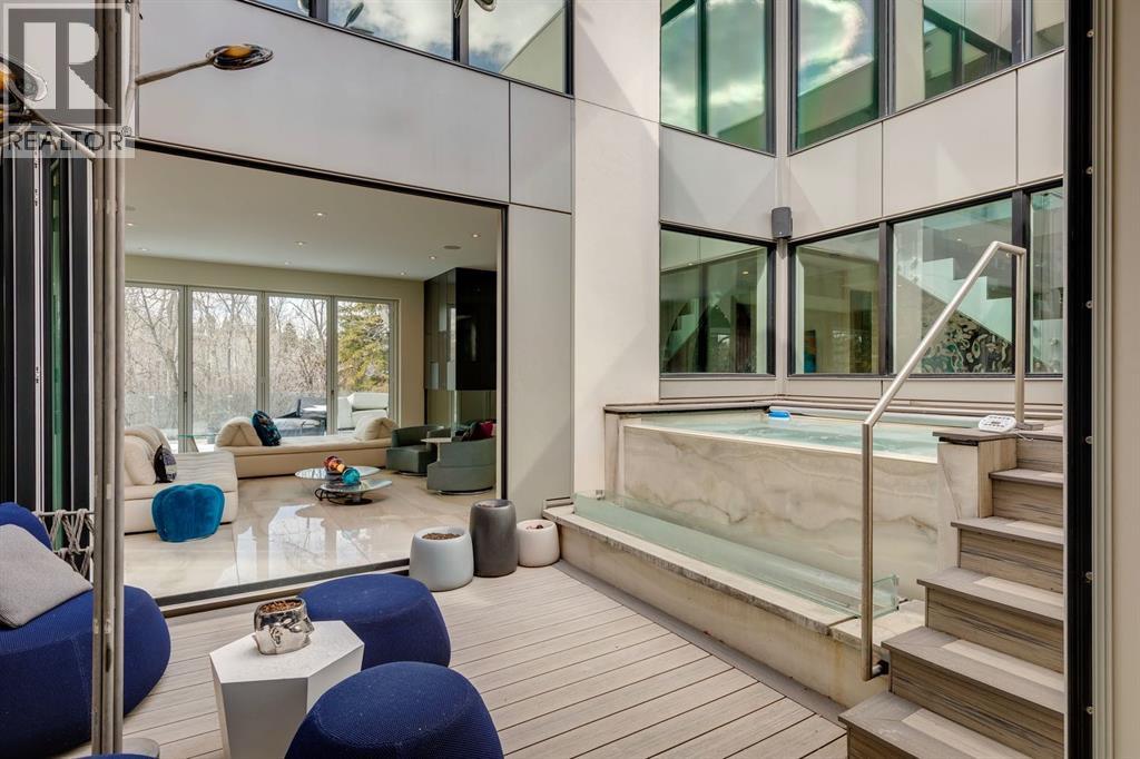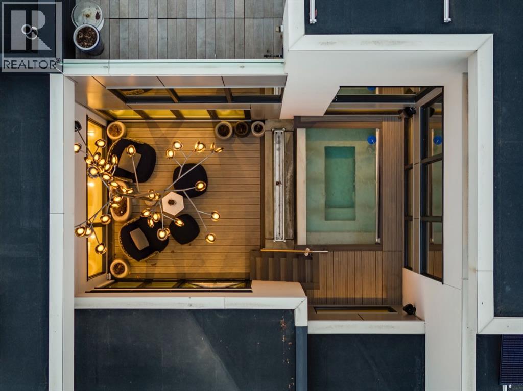 Experience unparalleled modern luxury on one of Elbow Park’s most coveted stretches of Rideau Road. This architecturally striking residence blends cutting edge design with a serene, nature inspired setting, backing onto the Elbow River and separated by a treed island creating a private oasis that feels worlds away from the city. A stunning facade of stucco and marble, paired with sleek glass railings, sets the tone for the refined elegance within. Inside, soaring ceilings and expansive windows flood the home with natural light, while marble tile flows seamlessly throughout the main and upper levels. The grand foyer offers a breathtaking introduction, framing views of the home’s central courtyard retreat. Designed with entertaining in mind, the open concept dining space connects effortlessly to a show stopping kitchen. A custom movable island reveals an integrated cooktop and prep sink, while premium appliances, including built-in oven, microwave, coffee station, Subzero panelled refrigerator, and beverage drawers ensure both function and style. Sleek cabinetry can be closed off entirely for a clean, minimalist aesthetic, complemented by a fully equipped butler’s pantry. The living room is a masterpiece of indoor/outdoor flow, with patio doors opening to an expansive rear deck. A sophisticated gas fireplace with concealed television anchors the space, while a raised platform adds versatility for lounging or entertaining. A custom wine cellar provides the perfect showcase for your collection. Guests will love the main floor bedroom complete with walk-in closet and private ensuite. At the heart of the home lies a spectacular private courtyard. Nano doors on both sides create seamless integration, while an infinity hot tub and statement lighting evoke a true spa-like retreat. Upstairs, a thoughtfully designed laundry room features double washers and dryers, ample storage, and utility sink. Five spacious bedrooms include a remarkable primary retreat, complete with a bout ique style dressing room and tranquil sleeping quarters wrapped in windows. The luxurious ensuite offers a steam shower, sculptural concrete soaker tub, dual vanities, and dedicated vanity station. The third level elevates the lifestyle further with a loft lounge, wet bar, wine room, home gym, and a rooftop patio showcasing breathtaking downtown skyline views and an outdoor fireplace. The fully developed lower level features in-floor heated concrete floors, a theatre room with custom LED ceiling and projector, and a large mudroom leading to an extraordinary six car heated garage with a heated driveway. Smart home integration via Control4, carbon fibre fixtures, and extensive built-ins highlight modern innovation. Outdoors, multiple patios with glass railings provide ideal entertaining spaces, while a tranquil lower patio offers peaceful riverfront relaxation where you can hear birds sing while ducks float by. This exceptional residence delivers a rare blend of luxury, design, and natural beauty. (id:63190)