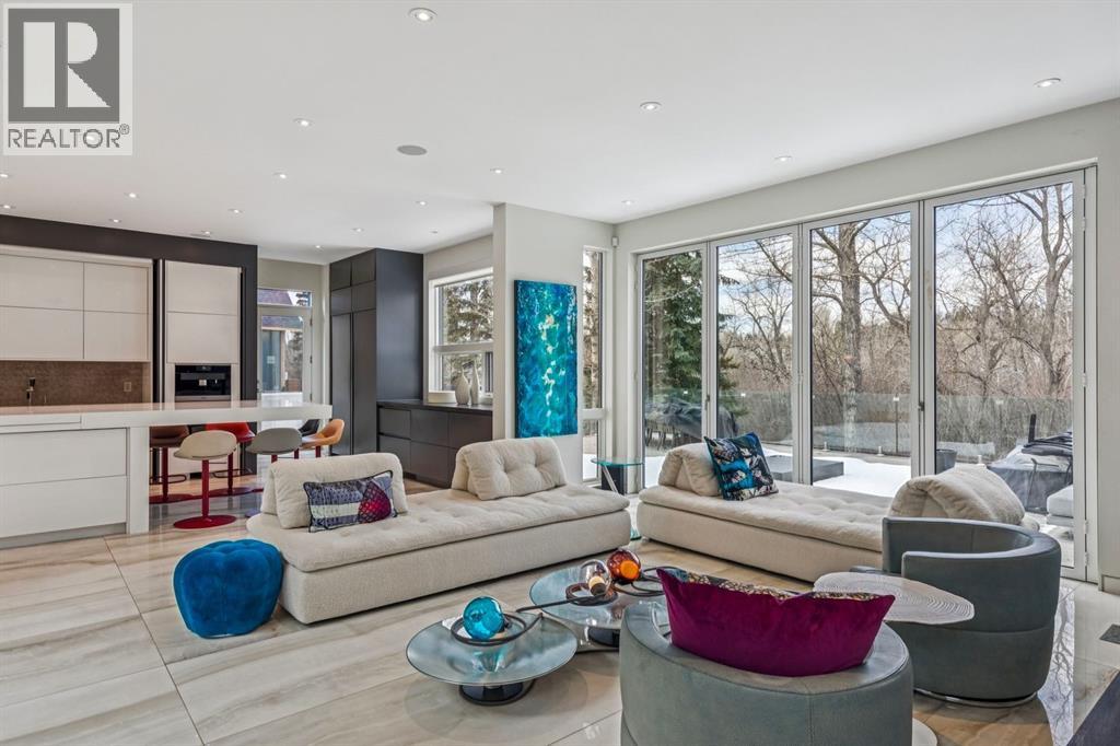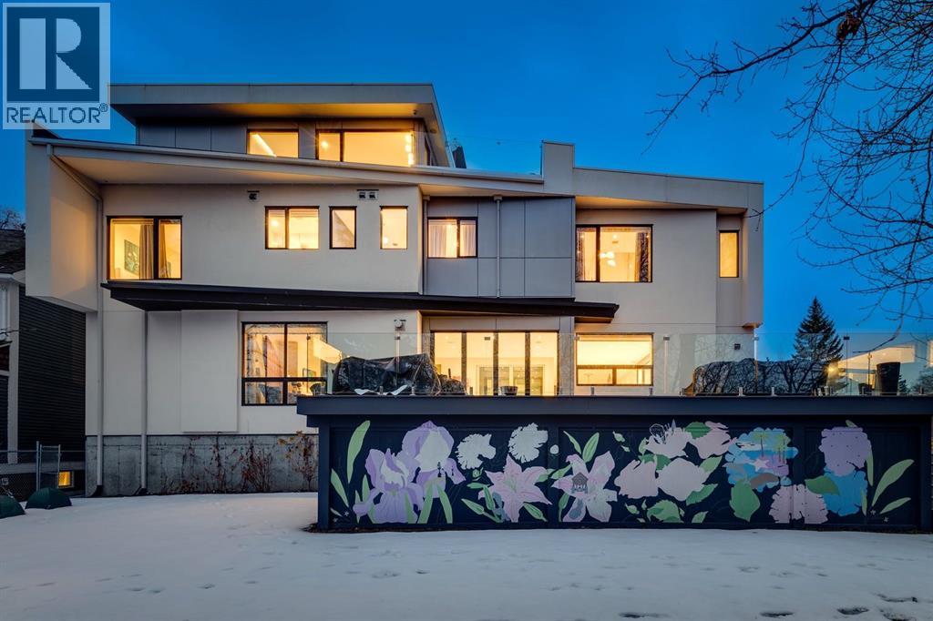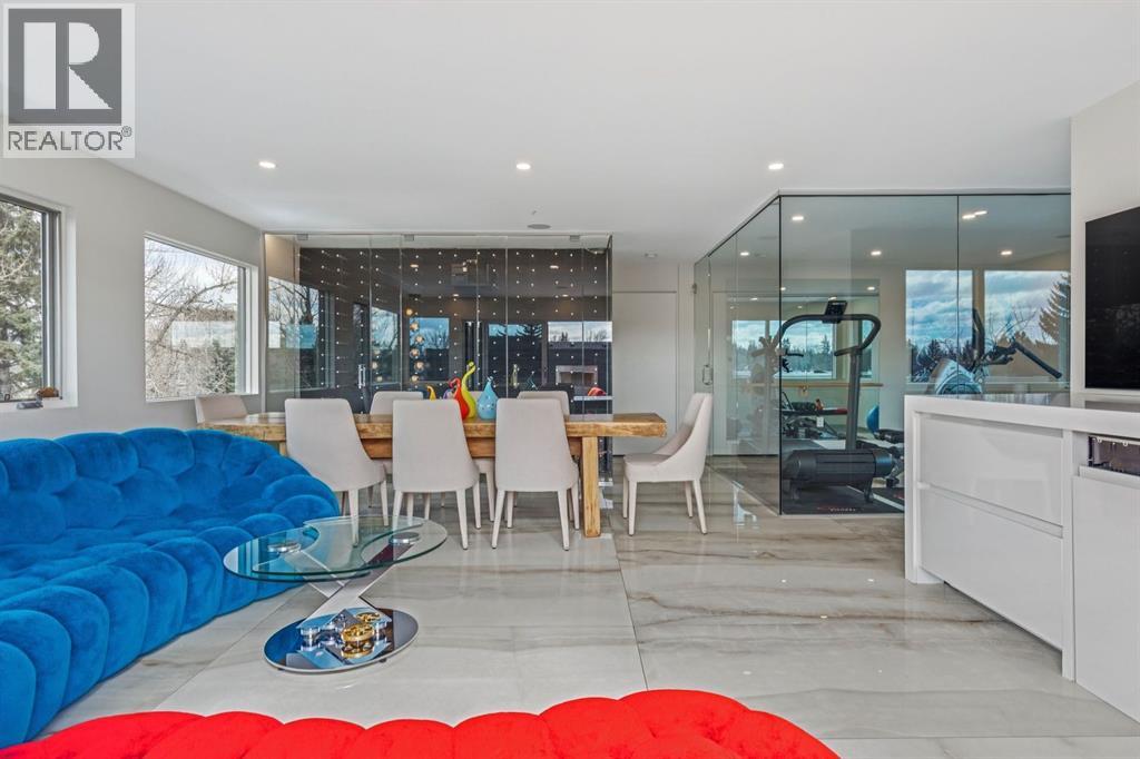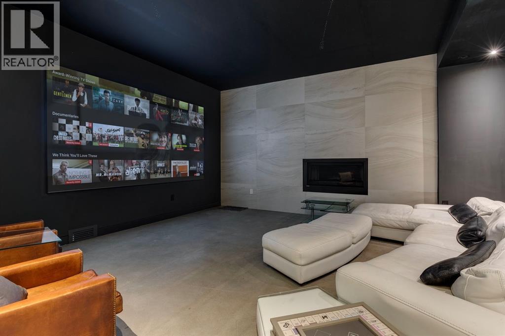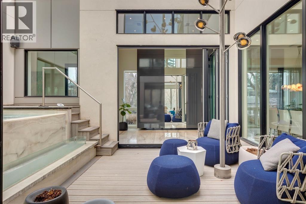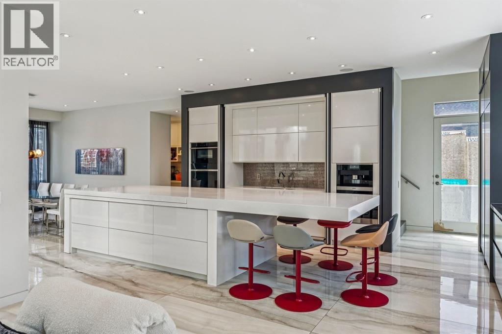 Experience unparalleled modern luxury on one of Elbow Park’s most coveted stretches of Rideau Road. This architecturally striking residence blends cutting edge design with a serene, nature inspired setting, backing onto the Elbow River and separated by a treed island creating a private oasis that feels worlds away from the city. A stunning facade of stucco and marble, paired with sleek glass railings, sets the tone for the refined elegance within. Inside, soaring ceilings and expansive windows flood the home with natural light, while marble tile flows seamlessly throughout the main and upper levels. The grand foyer offers a breathtaking introduction, framing views of the home’s central courtyard retreat. Designed with entertaining in mind, the open concept dining space connects effortlessly to a show stopping kitchen. A custom movable island reveals an integrated cooktop and prep sink, while premium appliances, including built-in oven, microwave, coffee station, Subzero panelled refrigerator, and beverage drawers ensure both function and style. Sleek cabinetry can be closed off entirely for a clean, minimalist aesthetic, complemented by a fully equipped butler’s pantry. The living room is a masterpiece of indoor/outdoor flow, with patio doors opening to an expansive rear deck. A sophisticated gas fireplace with concealed television anchors the space, while a raised platform adds versatility for lounging or entertaining. A custom wine cellar provides the perfect showcase for your collection. Guests will love the main floor bedroom complete with walk-in closet and private ensuite. At the heart of the home lies a spectacular private courtyard. Nano doors on both sides create seamless integration, while an infinity hot tub and statement lighting evoke a true spa-like retreat. Upstairs, a thoughtfully designed laundry room features double washers and dryers, ample storage, and utility sink. Five spacious bedrooms include a remarkable primary retreat, complete with a bout ique style dressing room and tranquil sleeping quarters wrapped in windows. The luxurious ensuite offers a steam shower, sculptural concrete soaker tub, dual vanities, and dedicated vanity station. The third level elevates the lifestyle further with a loft lounge, wet bar, wine room, home gym, and a rooftop patio showcasing breathtaking downtown skyline views and an outdoor fireplace. The fully developed lower level features in-floor heated concrete floors, a theatre room with custom LED ceiling and projector, and a large mudroom leading to an extraordinary six car heated garage with a heated driveway. Smart home integration via Control4, carbon fibre fixtures, and extensive built-ins highlight modern innovation. Outdoors, multiple patios with glass railings provide ideal entertaining spaces, while a tranquil lower patio offers peaceful riverfront relaxation where you can hear birds sing while ducks float by. This exceptional residence delivers a rare blend of luxury, design, and natural beauty. (id:63190)