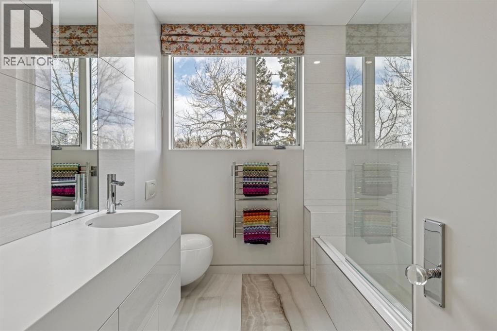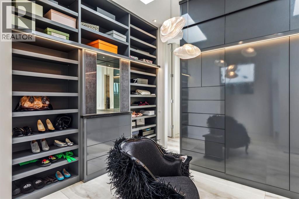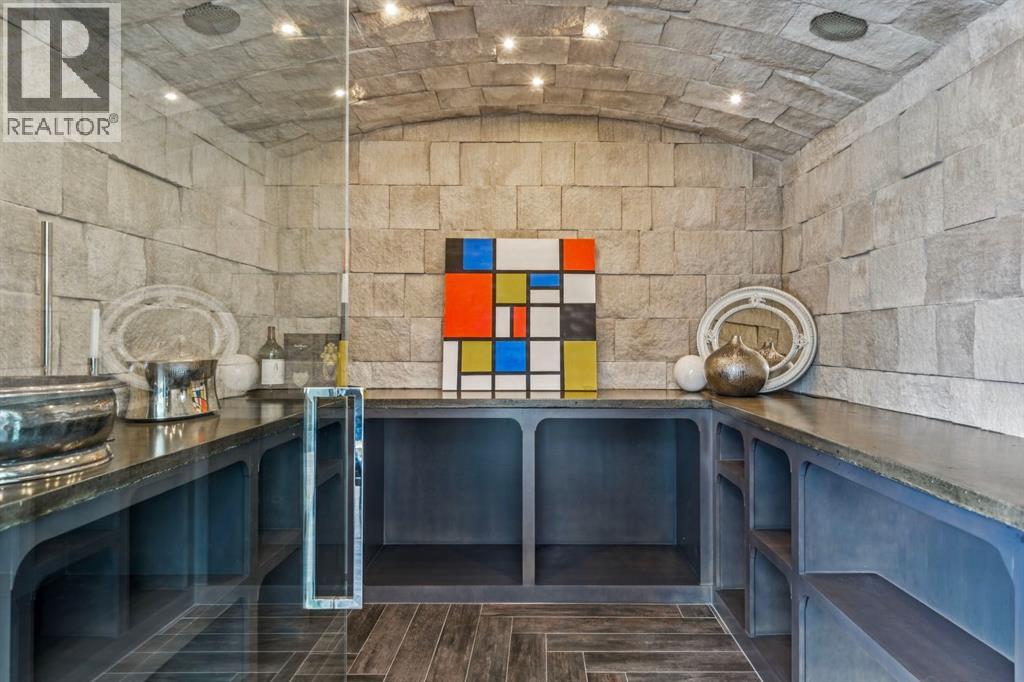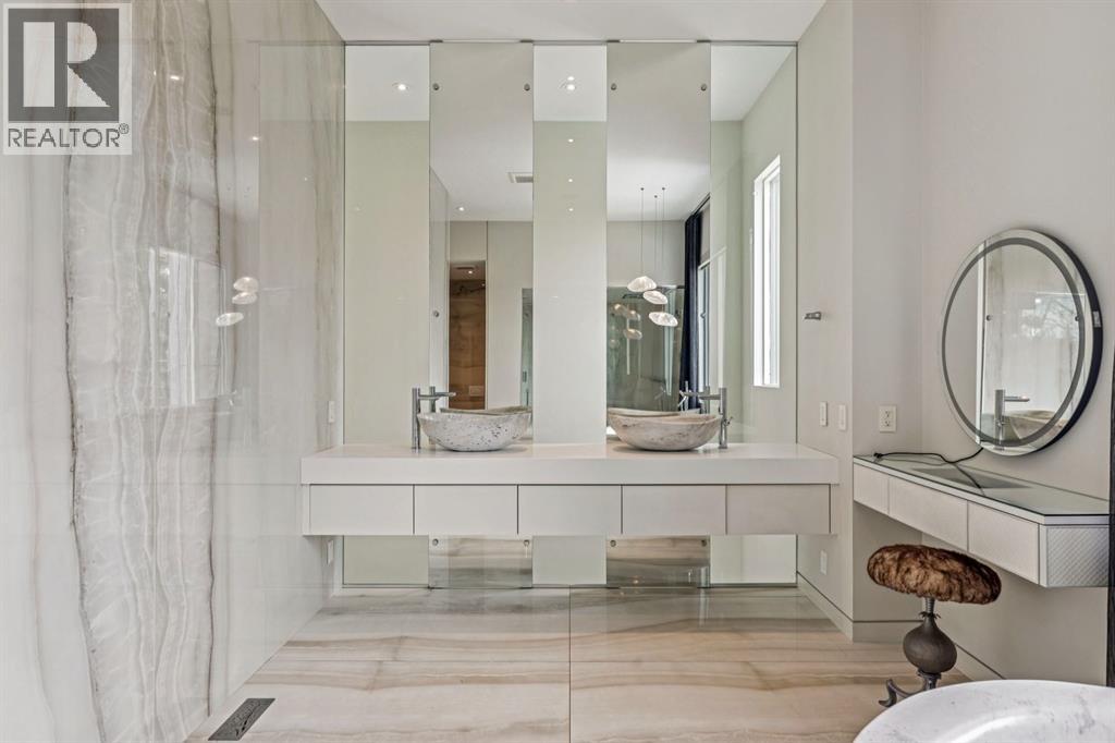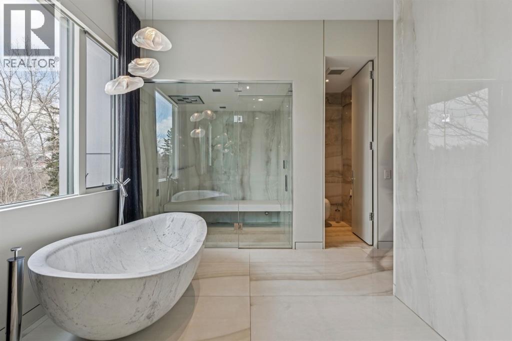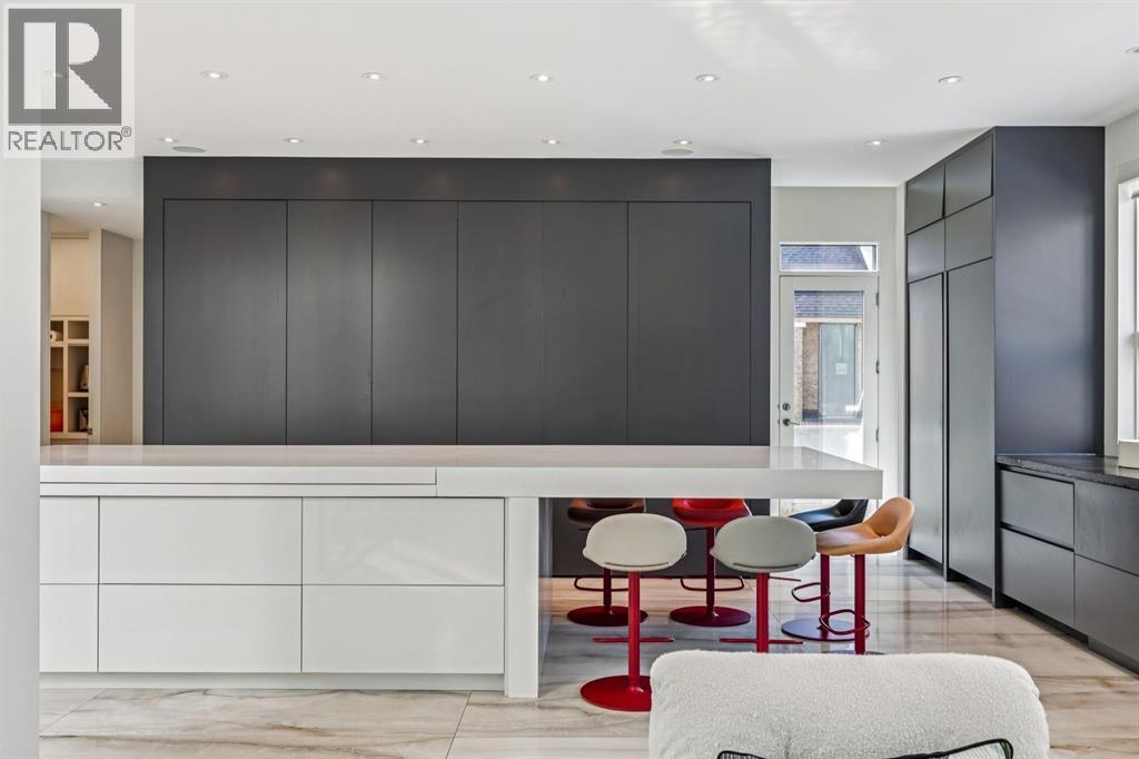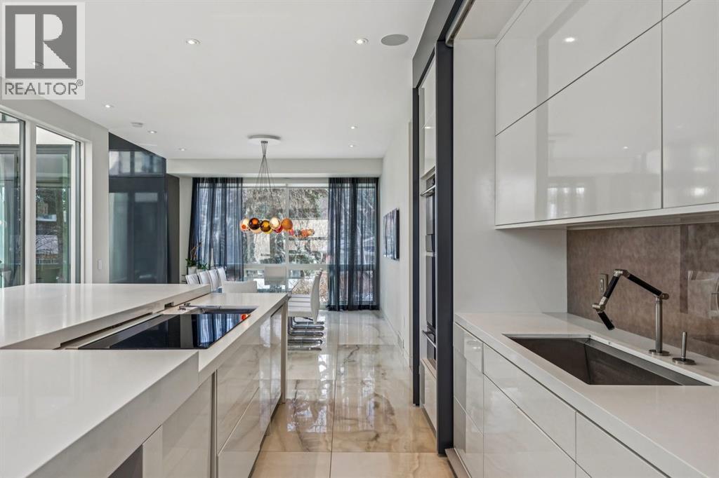 Experience unparalleled modern luxury on one of Elbow Park’s most coveted stretches of Rideau Road. This architecturally striking residence blends cutting edge design with a serene, nature inspired setting, backing onto the Elbow River and separated by a treed island creating a private oasis that feels worlds away from the city. A stunning facade of stucco and marble, paired with sleek glass railings, sets the tone for the refined elegance within. Inside, soaring ceilings and expansive windows flood the home with natural light, while marble tile flows seamlessly throughout the main and upper levels. The grand foyer offers a breathtaking introduction, framing views of the home’s central courtyard retreat. Designed with entertaining in mind, the open concept dining space connects effortlessly to a show stopping kitchen. A custom movable island reveals an integrated cooktop and prep sink, while premium appliances, including built-in oven, microwave, coffee station, Subzero panelled refrigerator, and beverage drawers ensure both function and style. Sleek cabinetry can be closed off entirely for a clean, minimalist aesthetic, complemented by a fully equipped butler’s pantry. The living room is a masterpiece of indoor/outdoor flow, with patio doors opening to an expansive rear deck. A sophisticated gas fireplace with concealed television anchors the space, while a raised platform adds versatility for lounging or entertaining. A custom wine cellar provides the perfect showcase for your collection. Guests will love the main floor bedroom complete with walk-in closet and private ensuite. At the heart of the home lies a spectacular private courtyard. Nano doors on both sides create seamless integration, while an infinity hot tub and statement lighting evoke a true spa-like retreat. Upstairs, a thoughtfully designed laundry room features double washers and dryers, ample storage, and utility sink. Five spacious bedrooms include a remarkable primary retreat, complete with a bout ique style dressing room and tranquil sleeping quarters wrapped in windows. The luxurious ensuite offers a steam shower, sculptural concrete soaker tub, dual vanities, and dedicated vanity station. The third level elevates the lifestyle further with a loft lounge, wet bar, wine room, home gym, and a rooftop patio showcasing breathtaking downtown skyline views and an outdoor fireplace. The fully developed lower level features in-floor heated concrete floors, a theatre room with custom LED ceiling and projector, and a large mudroom leading to an extraordinary six car heated garage with a heated driveway. Smart home integration via Control4, carbon fibre fixtures, and extensive built-ins highlight modern innovation. Outdoors, multiple patios with glass railings provide ideal entertaining spaces, while a tranquil lower patio offers peaceful riverfront relaxation where you can hear birds sing while ducks float by. This exceptional residence delivers a rare blend of luxury, design, and natural beauty. (id:63190)