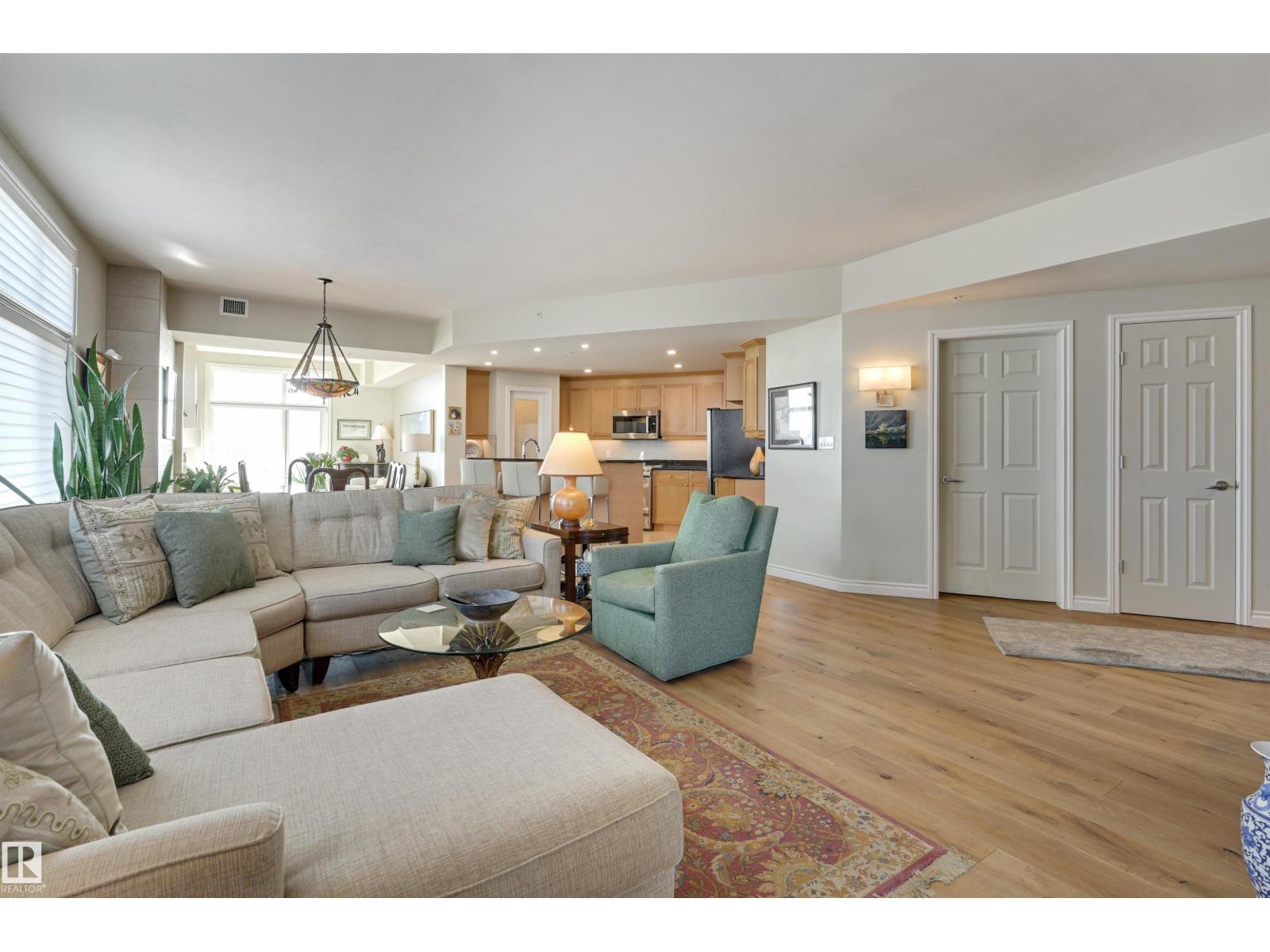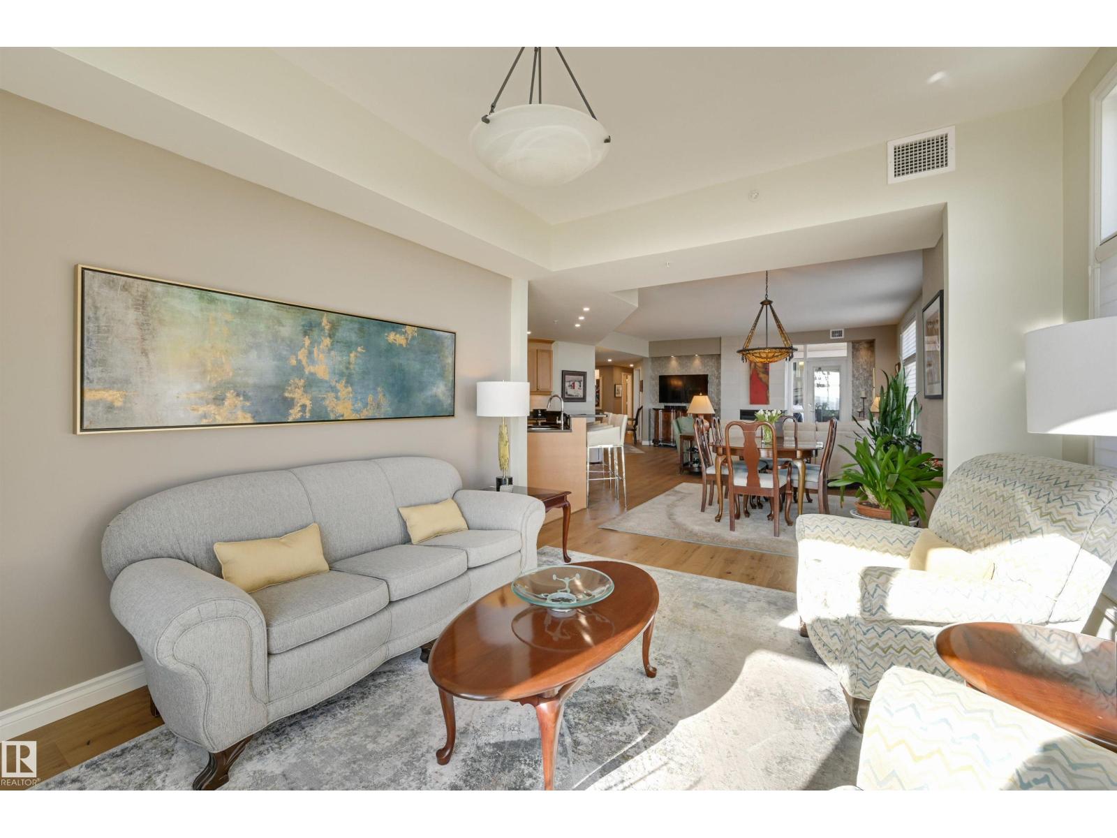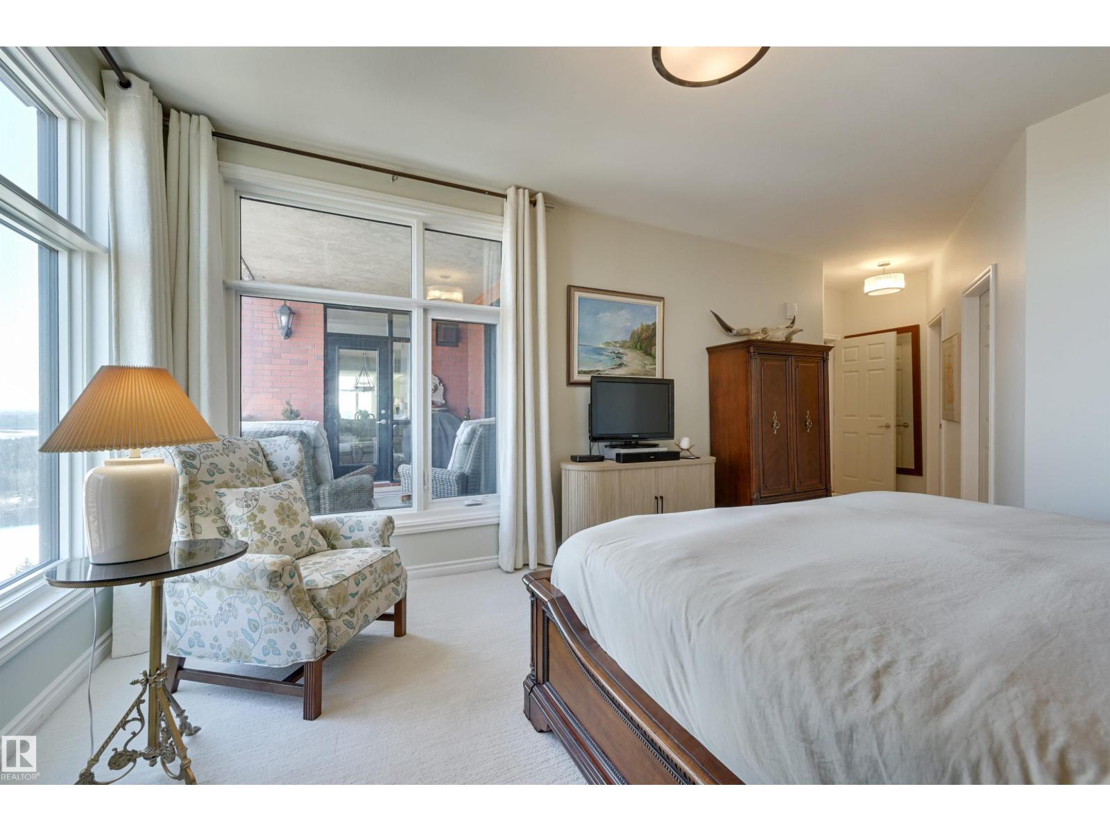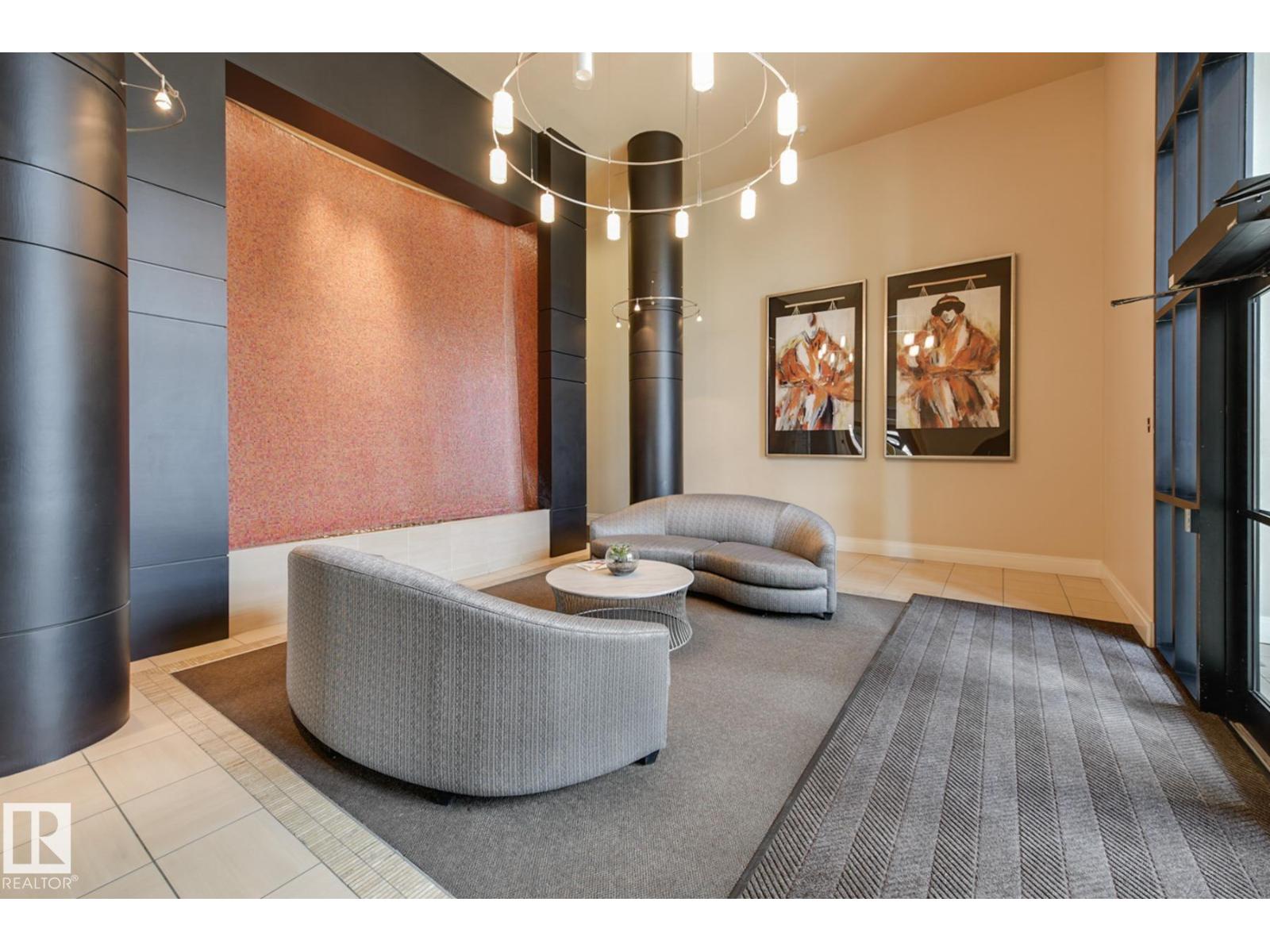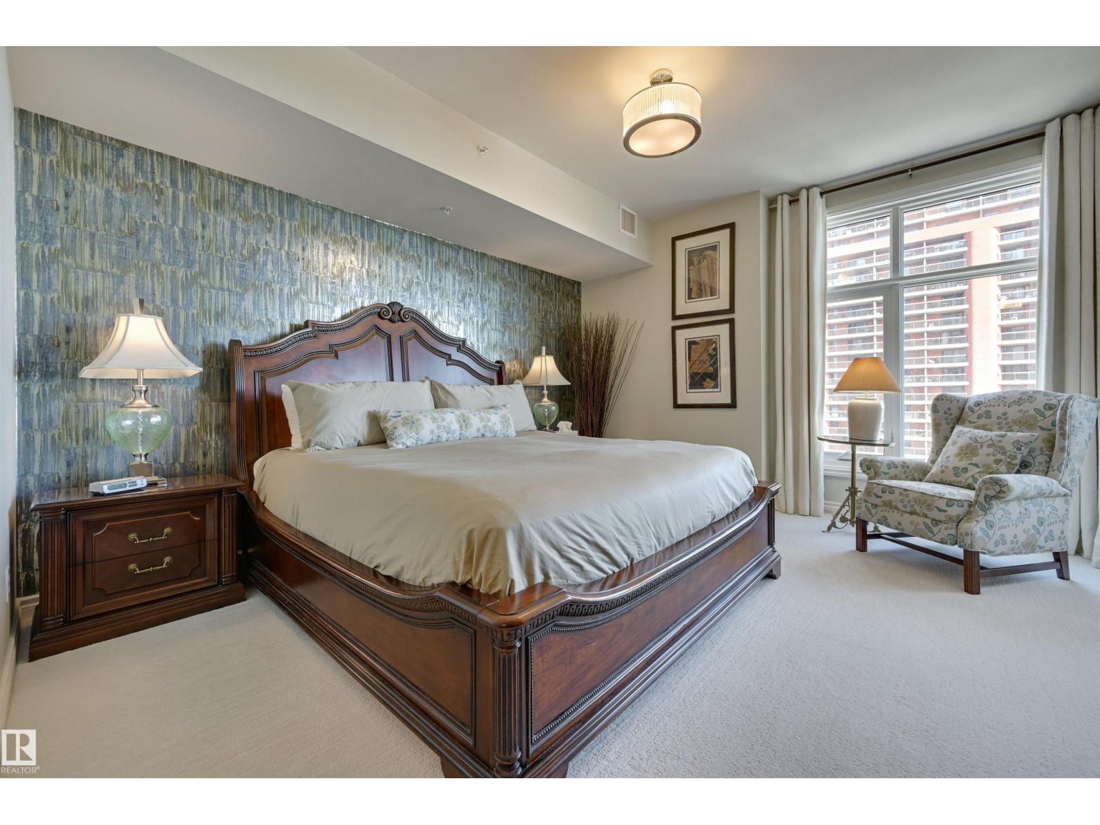 SPECTACULAR RIVER VALLEY VIEW from this UPGRADED 1520 sq.ft. 2 bedroom 2 bathroom condo in a SECURE GATED COMMUNITY conveniently located on Jasper Ave with the bus at your door, the river valley trails & quick access to the Ice District & U of A. Features OPEN FLOOR PLAN with 9' ceilings & floor to ceiling windows, scraped ceilings, distressed white oak hardwood flooring, luxurious carpeting in the primary bedroom & tile in the bathrooms, kitchen & laundry room. Chef's kitchen with ample cabinetry, granite countertops, pantry, raised eating bar, S/S appliances, subway tile backsplash & recessed lighting. Murphy bed in the 2nd bedroom. The primary suite has a walk-in closet & 4 piece ensuite. Heat pump & humidifier (2019). A/C, 2 U/G PARKING. Condo fees INCLUDE ALL UTILITIES! EXTENSIVE UPGRADES IN THE BUILDING: triple pane windows (2024), roof (2019), cooling tower (2023), exterior membrane (2025/2026), security upgrades, landscaping (2026). On-site manager, exercise room. Pet friendly. GORGEOUS! (id:63190)