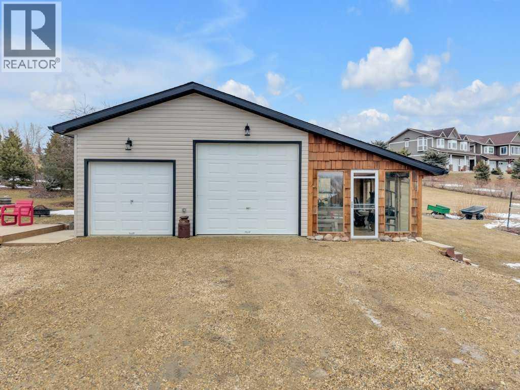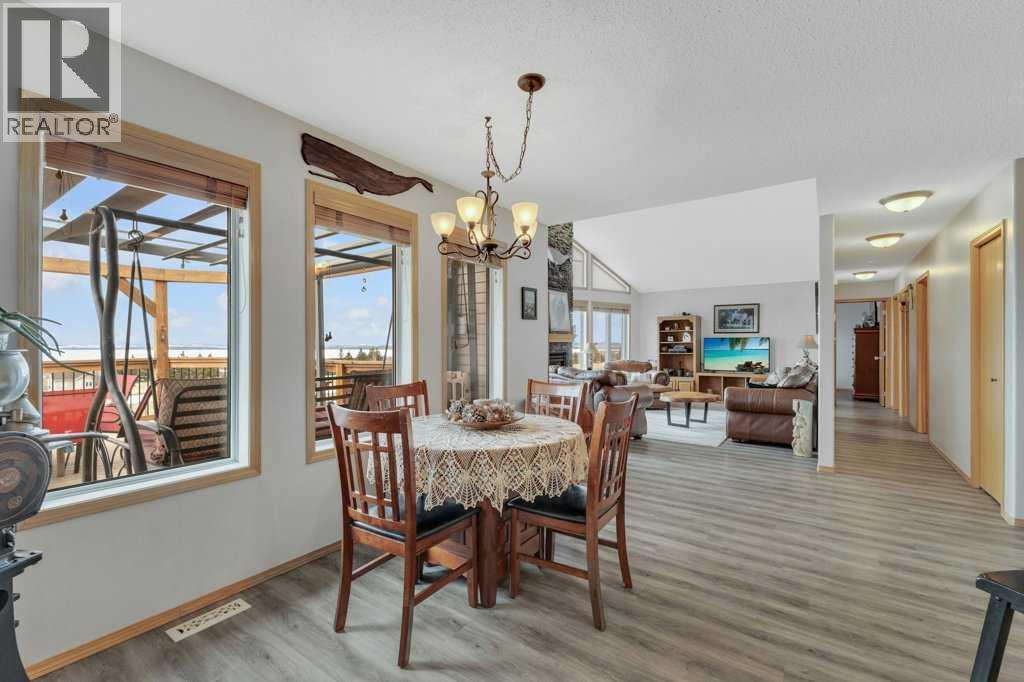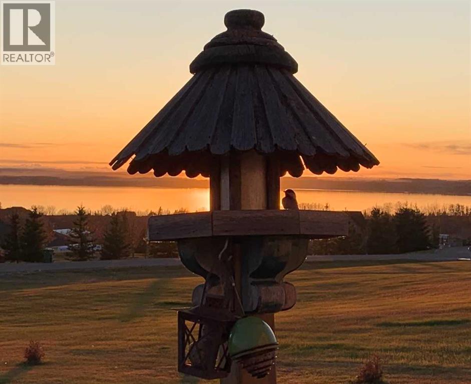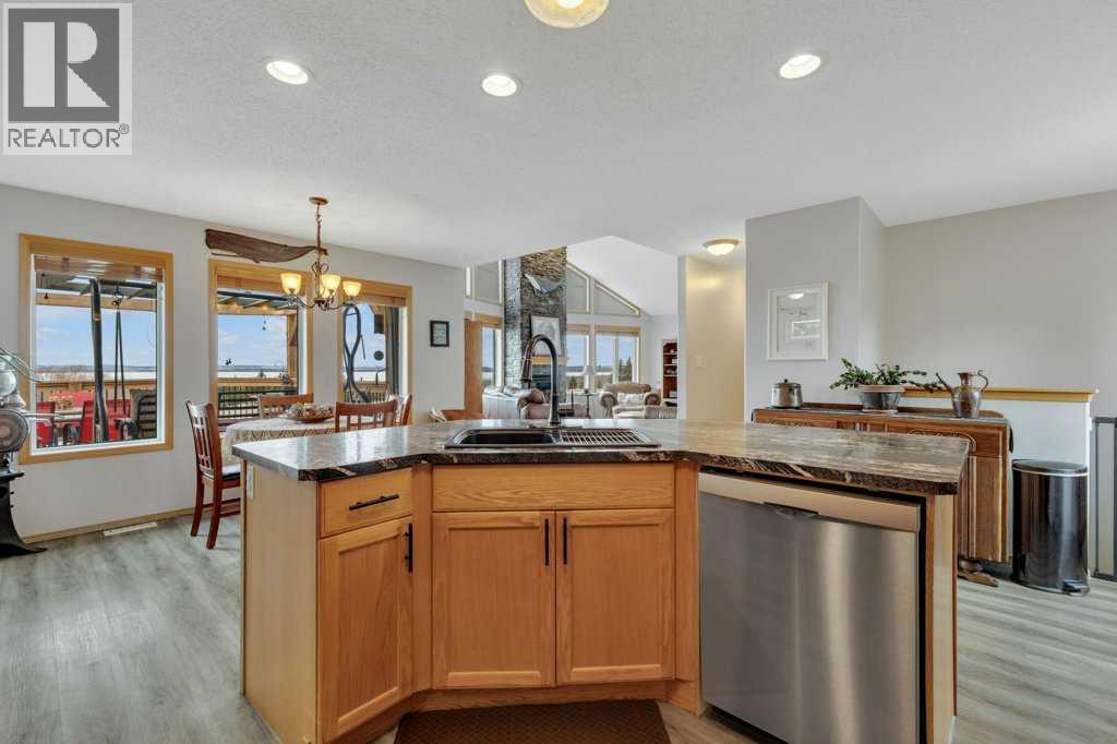 Overlooking Gull Lake, enjoy breathtaking lake views, stunning sunsets, and even a glimpse of the mountains on a clear day. This beautiful 1300 sq ft home features 4 bedrooms and 3 bathrooms, with an open-concept kitchen and dining area complete with a large island and walk-in pantry. The living room showcases a vaulted ceiling and a striking stone fireplace, perfectly framing the floor-to-ceiling windows that capture the lake view. The fully finished basement offers a spacious family room, an oversized bedroom with ensuite, a cold room, and a massive storage area with potential to be converted into an additional bedroom or living space. Upgrades include 4 front room windows with 25 yr warranty, flooring, paint, countertops throughout kitchen and bathrooms. septic pump (2 yrs), dishwasher & stove.The property has been thoughtfully and meticulously landscaped with a massive deck off the front of the home, lilacs lining the perimeter fence, and birch and poplar trees providing added shelter and privacy. You’ll also find apple and cherry trees, along with a beautifully designed garden area with 6 ft fence, featuring raised asparagus and strawberry beds, gooseberries, saskatoons, and plenty of room for vegetables. Garden area includes a garden shed/chicken coop, along with underground water lines servicing the garden and trees. Double car garage with added green house is conveniently situated close to the garden. This home must been seen to be appreciated. Most of the photos are summer pictures to capture the real essence of this property. This property offers your own personal retreat!. Don't wait to view this one! (id:63190)