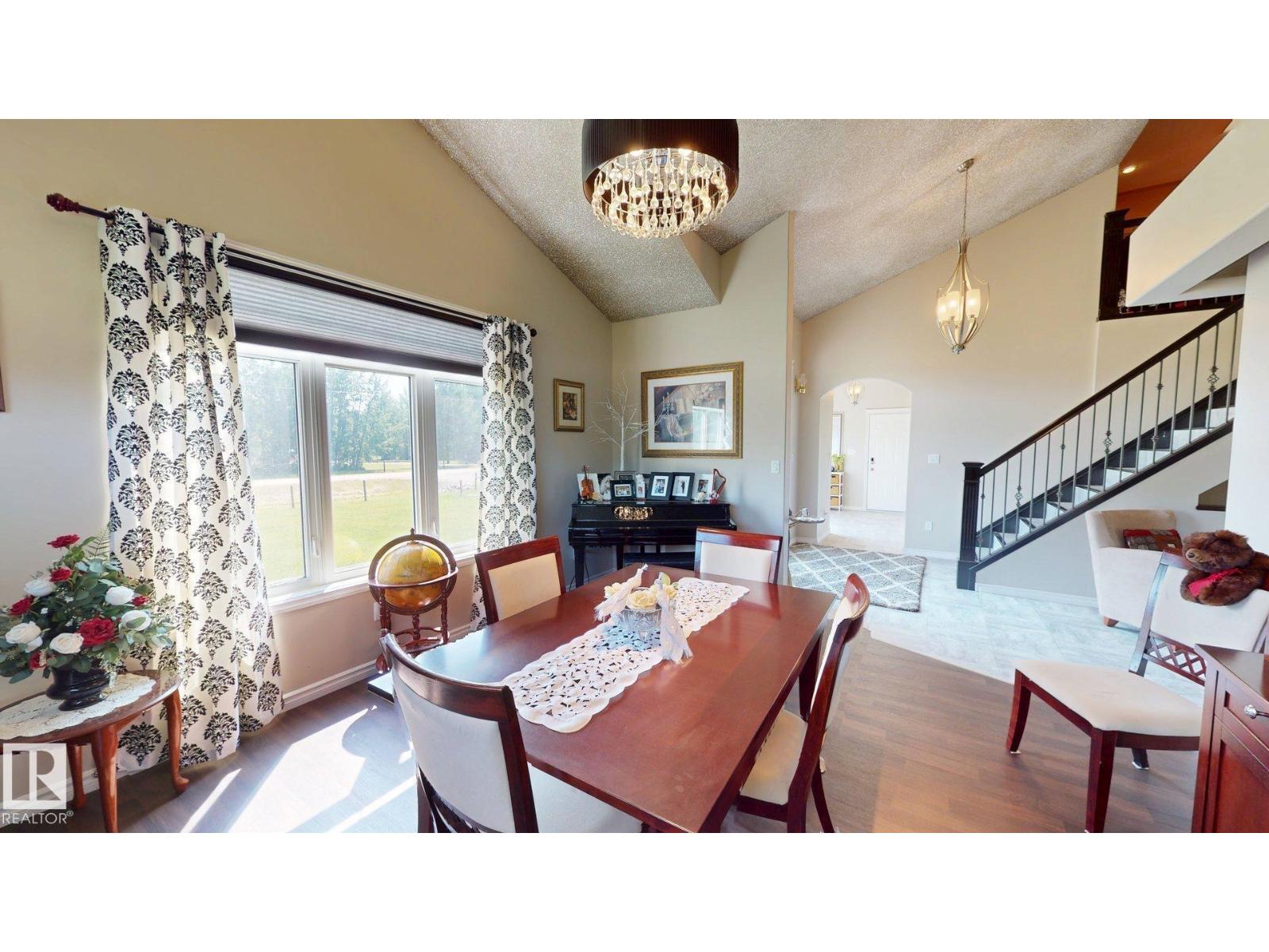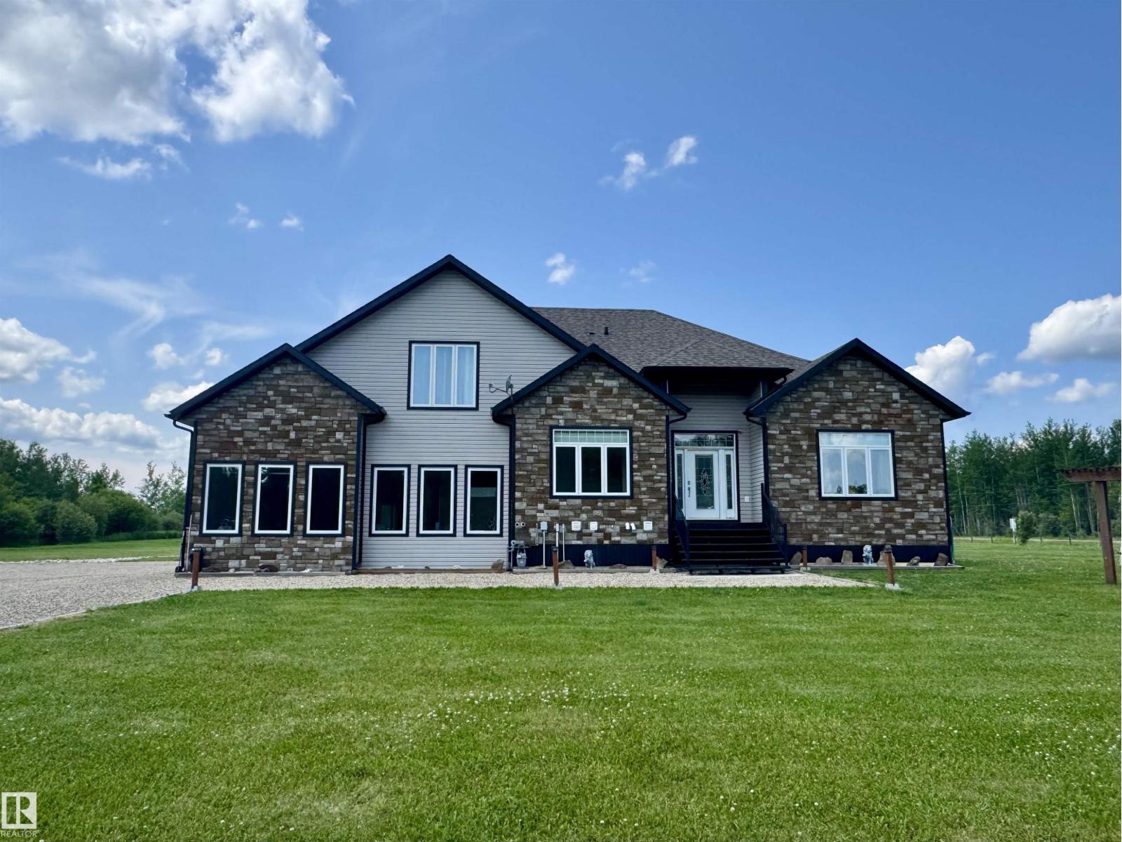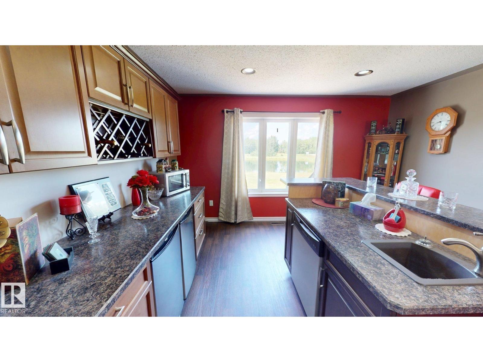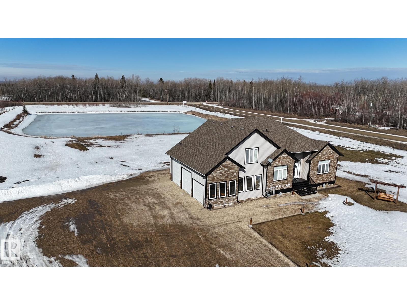 Experience refined country living on this breathtaking 4.7-acre estate, just minutes from Drayton Valley. Anchored by a stunning custom pond, this elegant 1.5-storey home blends timeless design with modern comfort. The main level showcases a beautifully appointed chef’s kitchen, formal dining space, inviting sitting room, private office, and a luxurious primary retreat complete with spa-inspired ensuite and in-closet laundry. Upstairs, an open-concept lounge with wet bar creates the perfect setting for upscale entertaining. A fully self-contained guest suite with private entrance, kitchen, ensuite, and laundry offers exceptional flexibility for extended family or income potential. Enjoy serene views from the sunroom and expansive deck, surrounded by manicured grounds. Complete with a triple attached garage and ample space for all your lifestyle needs, this is acreage living at its finest. (id:63190)