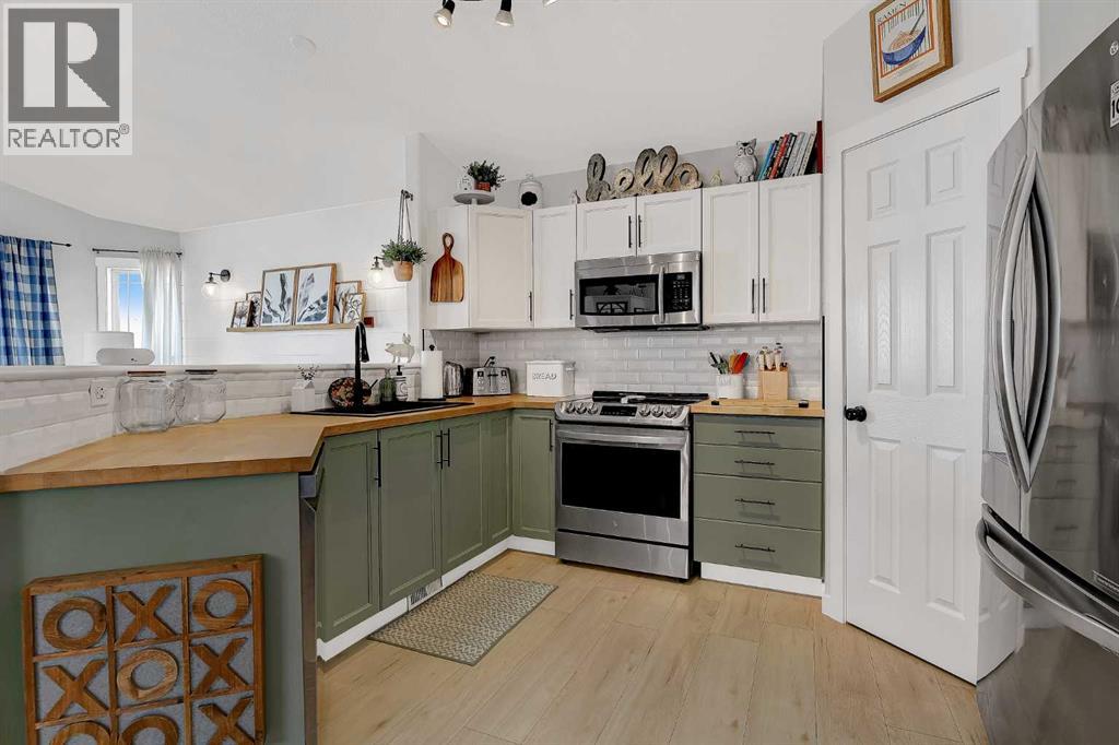 Completely transformed from top to bottom, this fully renovated 4-level split blends modern design with everyday function. From the moment you step inside, you’re greeted by a custom-built entry feature wall and a striking staircase design that sets the tone for the entire home. Thoughtful details carry throughout, including shiplap feature walls and a beautifully finished shiplap fireplace that anchors the living space with warmth and character.The kitchen is clean, bright, and on-trend—featuring classic subway tile backsplash, butcher block-style countertops, and a layout that works whether you’re hosting or just handling daily life.Each level of the home has been updated to reflect a cohesive, modern feel—nothing left untouched.Step outside from the third level walkout to a private backyard retreat, complete with a large deck, garden boxes, a fenced dog run, and your own sauna—perfect for unwinding year-round.Located within walking distance to a playground and offering a large parking pad, this property checks boxes for both lifestyle and practicality. (id:63190)