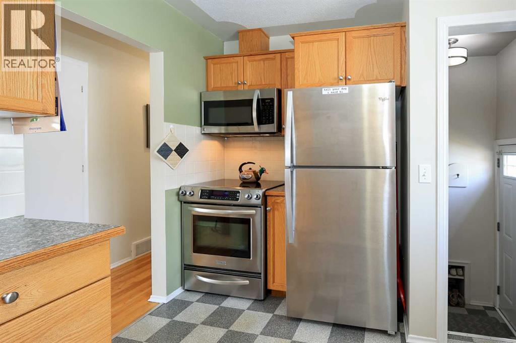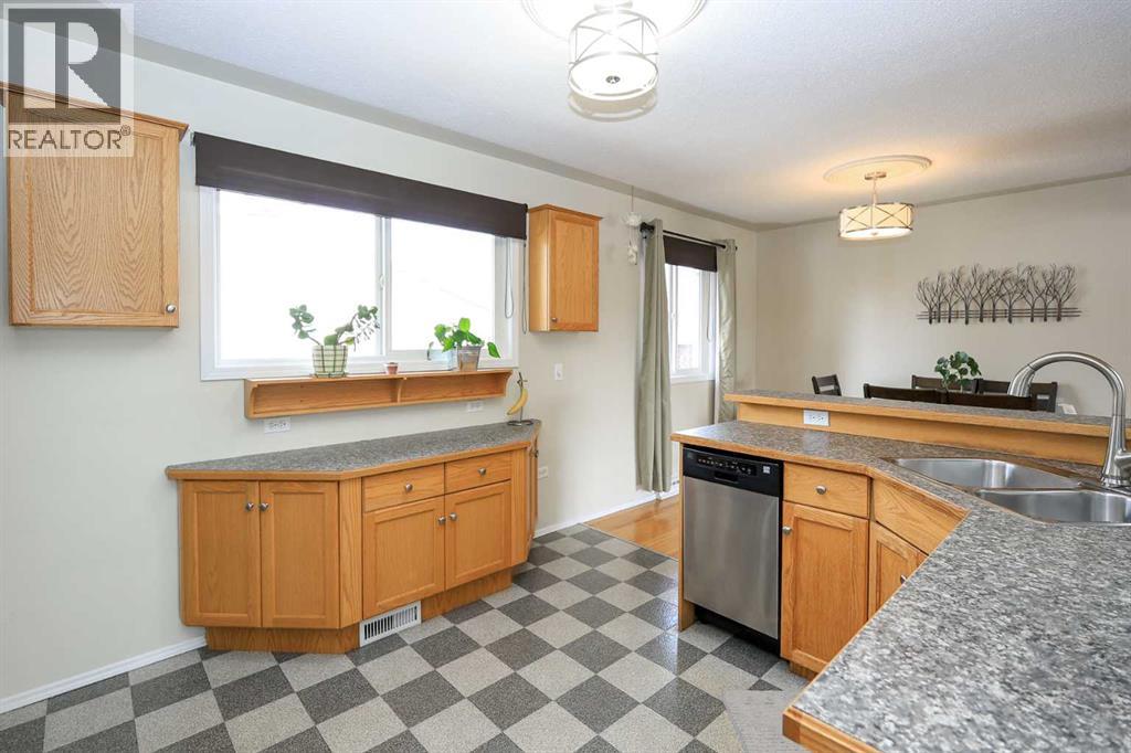 IMMEDIATE POSSESSION AVAILABLE ~ FULLY DEVELOPED 4 BEDROOM, 2 BATHROOM BUNGALOW IN GRANDVIEW ~ AIR CONDITIONING ~ HEATED DOUBLE DETACHED GARAGE ~ East facing front veranda welcomes you and leads to a sunny foyer ~ The living room features hardwood flooring and a large picture window that overlooks the front yard ~ Hardwood floors continue into the dining room where you can easily host large gatherings ~ The kitchen offers an abundance of light stained cabinets, ample counter space including a raised eating bar, full tile backsplash, stainless steel appliances and a large west facing window that overlooks the backyard ~ Rear entry just off the kitchen offers easy access to the basement, rear patio/backyard and the garage ~ Huge primary bedroom with hardwood flooring and tons of natural light can easily accommodate a king size bed plus multiple pieces of furniture or a sitting area, and features mirrored closets ~ 4 piece main bathroom features an air tub ~ Second main flor bedroom is also a generous size ~ The fully finished basement offers a spacious family room with built in cabinets, 2 large bedrooms (one with a built in desk), a den/flex room with a closet, and a 3 piece bathroom with laundry ~ New shingles in 2023 ~ New hot water tank 2024 ~ The fully fenced backyard is landscaped with mature trees, shrubs and perennials, and has plenty of grassy yard space ~ 26' L x 24' W detached garage is insulated, finished with painted drywall and has built in shelving ~ Gravel parking pad behind the garage has space for at least two vehicles ~ Centrally located in a mature neighbourhood, walking distance to all amenities, close to parks and walking trails, and easy access to downtown ~ Pride of ownership shines in this well cared for home! (id:63190)