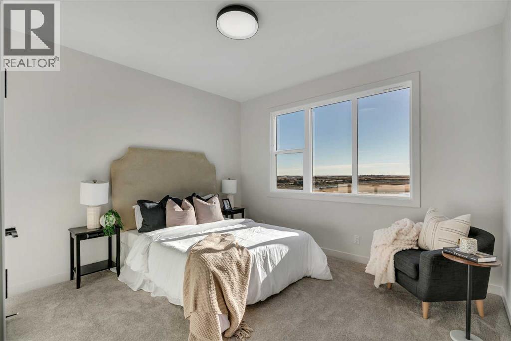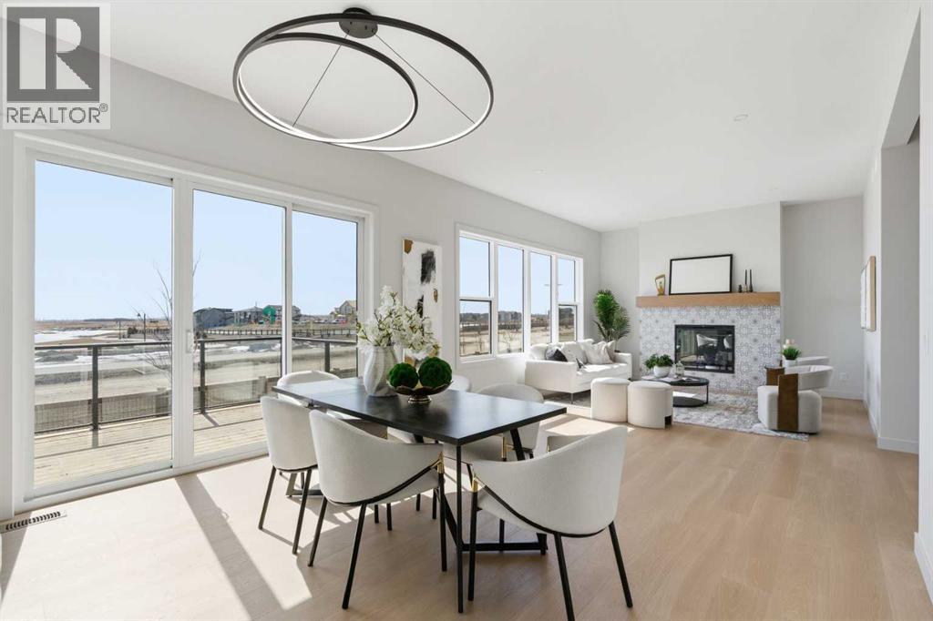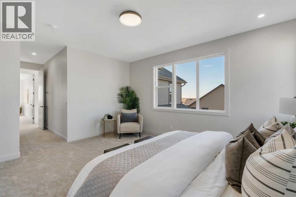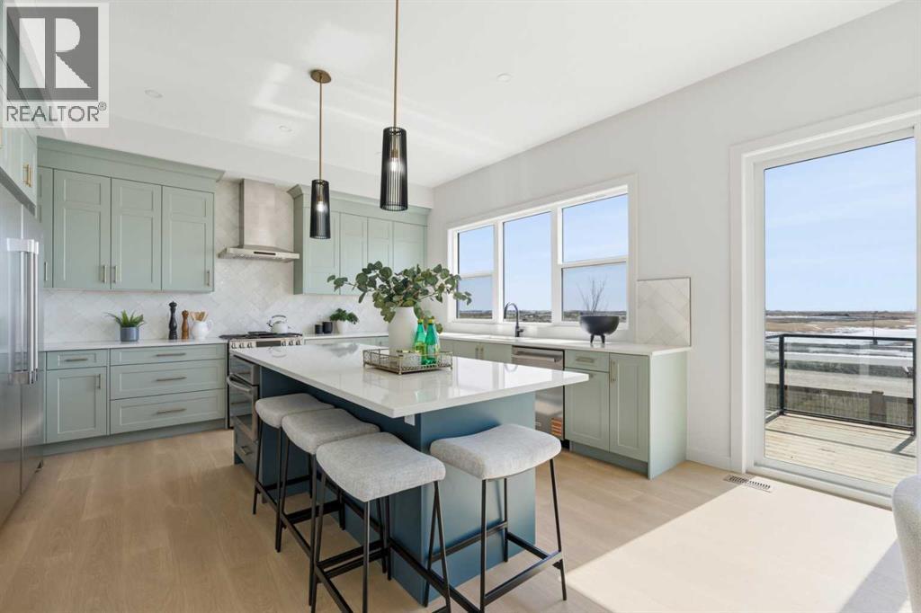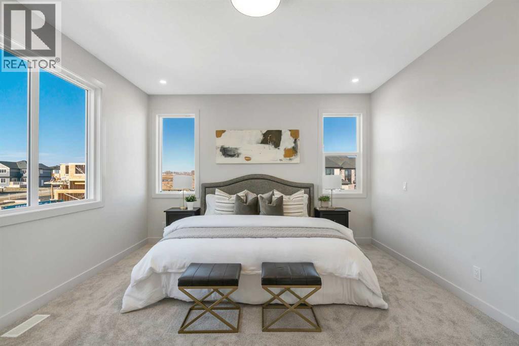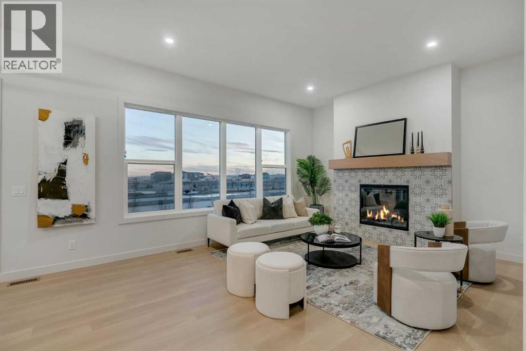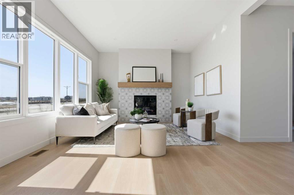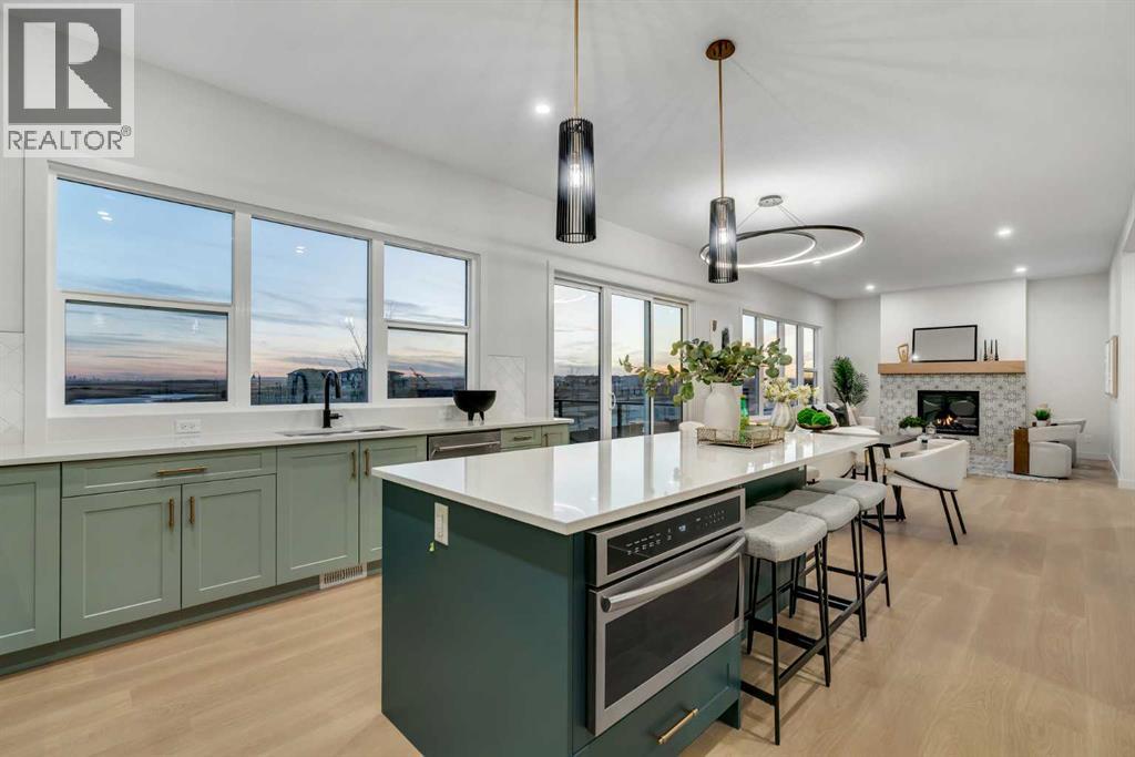 Public Open House April 26th (Sunday) 2:00-4:00PM * Dreams come true! *Watch the Video*A fully finished designer estate home offering over 4,200 SQFT of functional living space, this residence is designed to impress at every turn. A luxury estate home that truly checks every box. This stunning showpiece by Aspen Creek Designer Homes, Alberta's one of Alberta's premier luxury builder showcases exceptional craftsmanship & stellar elevated finishings. Located in the growing estate community of Goldwyn, this home offers the charm of prairie estate living with breathtaking pond, downtown, & mountain views - Perfectly situated on a quiet cul-de-sac & no neighbours behind. OVERSIZED TRIPLE GARAGE | L-SHAPED LOT | 5 BEDROOMS + MAIN FLOOR DEN | 5 FULL BATHROOMS | SOUTH BACKYARD | POND VIEWS | EXCELLENT FINISHINGS | STUNNING CHEF'S KITCHEN | SPICE KITCHEN | SPACIOUS BACKYARD | 3 SPACIOUS BEDROOMS UP WITH ENSUITES | BONUS ROOM WITH PRIVATE BALCONY | FINISHED WALKUP 2 BEDROOMS BASEMENT | HARDIE BOARD SIDINGThe expansive triple garage along with aggregate driveway create a striking first impression. Step through the grand double-door entrance into a soaring open-to-below foyer filled with natural light. The main floor features 10-foot ceilings, 9 Ft doors, oversized windows, & a spacious living room with an elegant tiled fireplace detailing. A magazine-worthy, state-of-the-art chef’s kitchen offering that aura your guests are going to love - timeless cabinetry with gold hardware, glossy backsplash, top-of-the-line appliances including an oversized refrigerator, gas cooktop, chimney hood fan, & built-in microwave. A massive centre island with blue cabinetry provides the perfect gathering space, while the fully equipped spice kitchen adds both style & function.A versatile main floor den with a French glass door sits beside an upgraded full bathroom— ideal for guests, multigenerational living, or a private home office. A generous mudroom offering ample space for a secondary home office. Walking upstairs along the grand wide staircase with designer railing, you'll notice the 9 FT ceilings & 8ft doors followed by a sun-filled central bonus room opens onto a private balcony overlooking the pond. Three spacious upstairs bedrooms each feature their own private ensuites - no compromises whatsoever. The primary suite is a true retreat, enhanced by extra windows, a huge walk-in closet, & a luxurious spa-like ensuite complete with a soaker tub, glass shower with upgraded tile surround, dual sinks, & a private toilet.The two additional south-facing bedrooms enjoy stunning pond views & upgraded attached bathrooms, offering comfort & privacy for family or guests. A massive laundry room with cabinets and tiles Step outside to a huge south-facing backyard that feels like a private summer retreat - ideal for entertaining & relaxing with your family. Dual Furnace Zoning & 72 Gal HWT adding to the efficiency. A fully upgraded over 4200 SQFT luxury home in an estate location. (id:63190)