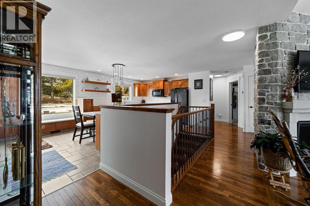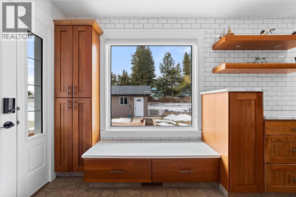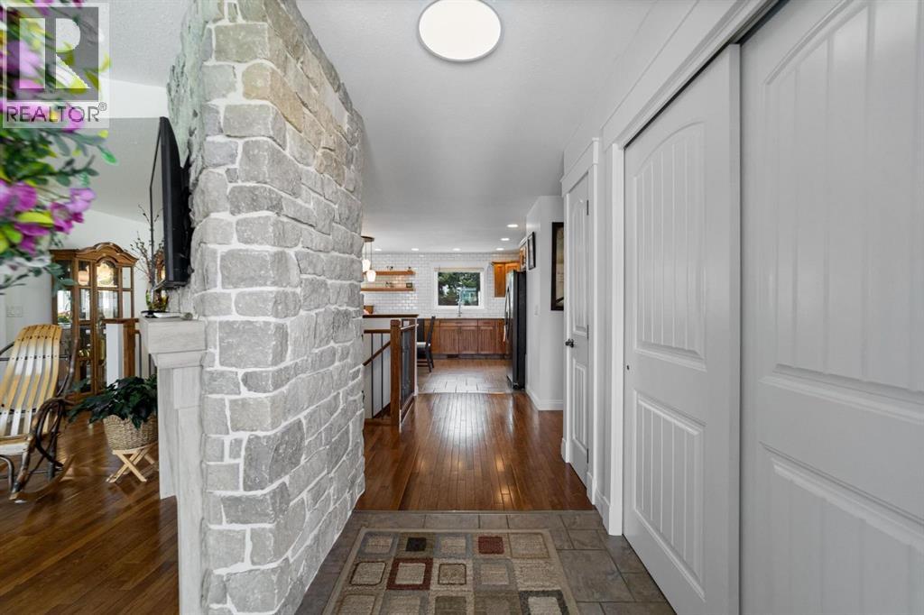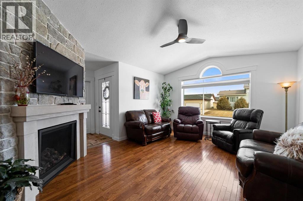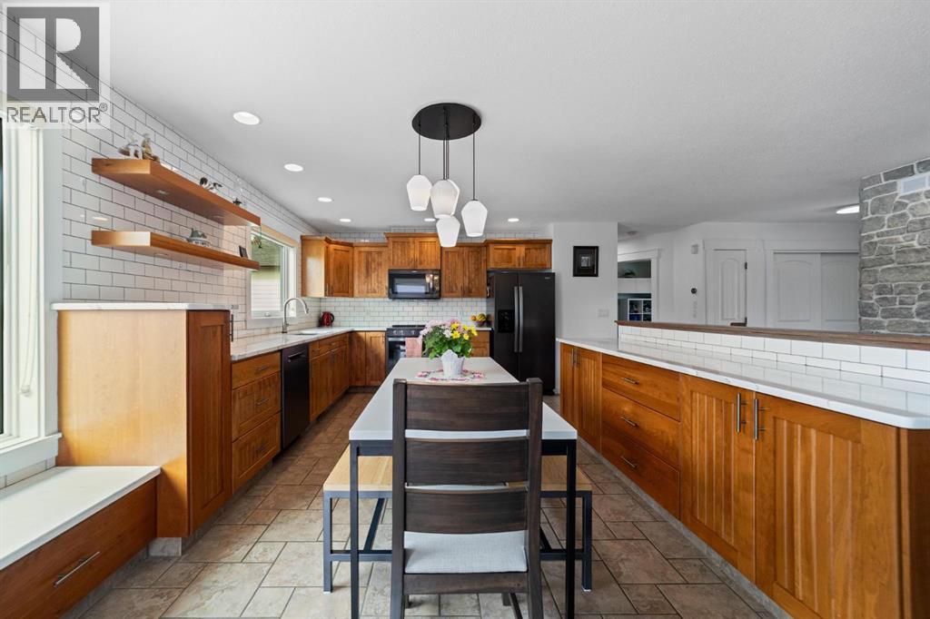 Modern bungalow with custom finishes throughout, offering a well maintained and move-in ready space that balances style and everyday function. Elevated custom kitchen features quartz countertops, custom cabinetry, tile backsplash to the ceiling, and updated appliances. Floating shelving, back island for extra counter space, and an included dining table with bench seating add both function and style. Space continues the flow into the main living area while still offering defined areas. Vaulted ceilings, hardwood floors, triple pane windows, and crown mouldings enhance the home, while a custom stone gas fireplace creates a warm focal point and adds character to the living room. Spacious primary bedroom is set privately at one end of the home with a walk-in closet and ensuite featuring a jetted soaker tub and separate upgraded shower. Two additional bedrooms and a full bathroom are located on the opposite side — a layout that works well for families or guests. Fully developed basement continues the inviting feel with a bright family space designed for movie nights, complete with a custom feature wall, included TV, and wet bar. Two more bedrooms, another full bathroom, and a laundry room bring the total to 5 bedrooms and 3 bathrooms. Added features include central air conditioning, radon extraction system, phantom screen doors, and ample storage with built-in shelving and cabinetry. Outside offers covered front and back porches, a large south-facing deck with custom garden boxes, plus a fully fenced yard with garden plot ready to go. 24x24 detached garage is finished and heated, with room for vehicles, storage, and workspace. Additional yard features include new 10x12 and 8x10 garden sheds for extra storage. Bashaw is a welcoming community with everything you need close by, and kids can ride bikes and play at ease. Enjoy summer nights at Buffalo Lake just a short drive away. Camrose, Stettler, and Red Deer are all within an easy commute. (id:63190)