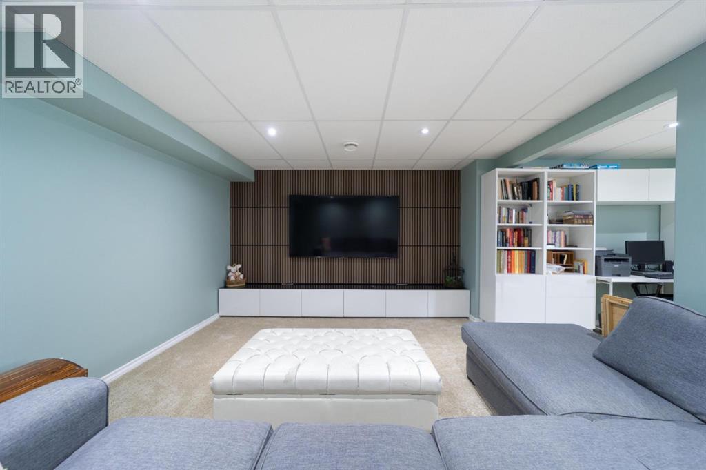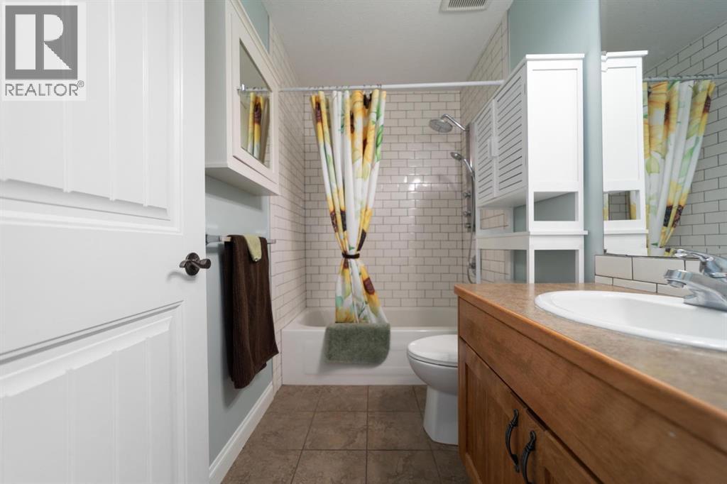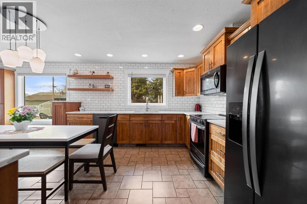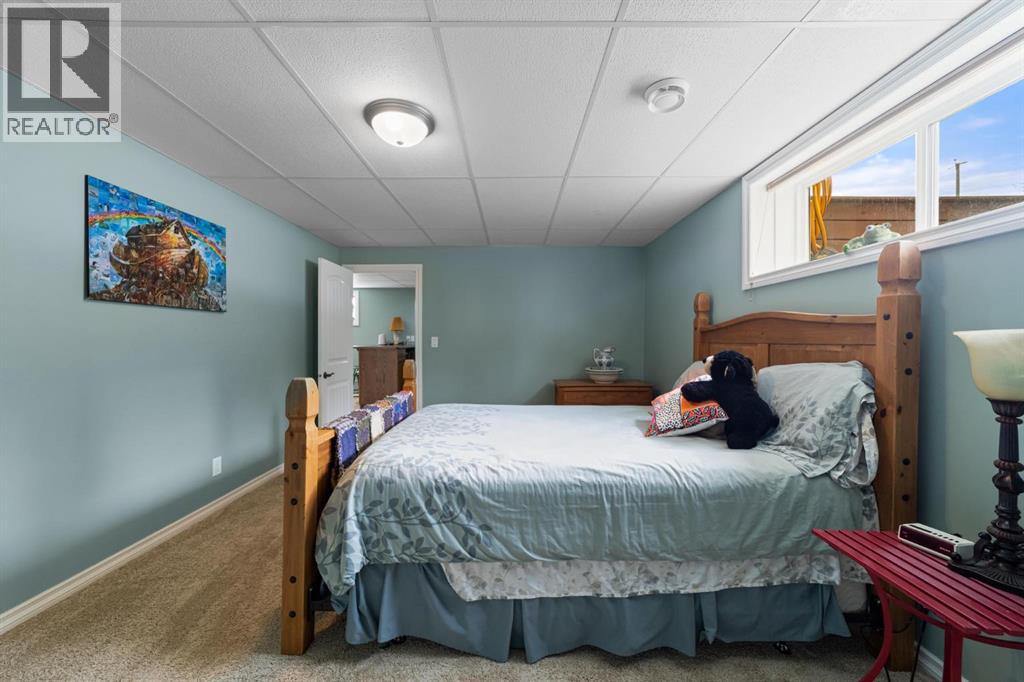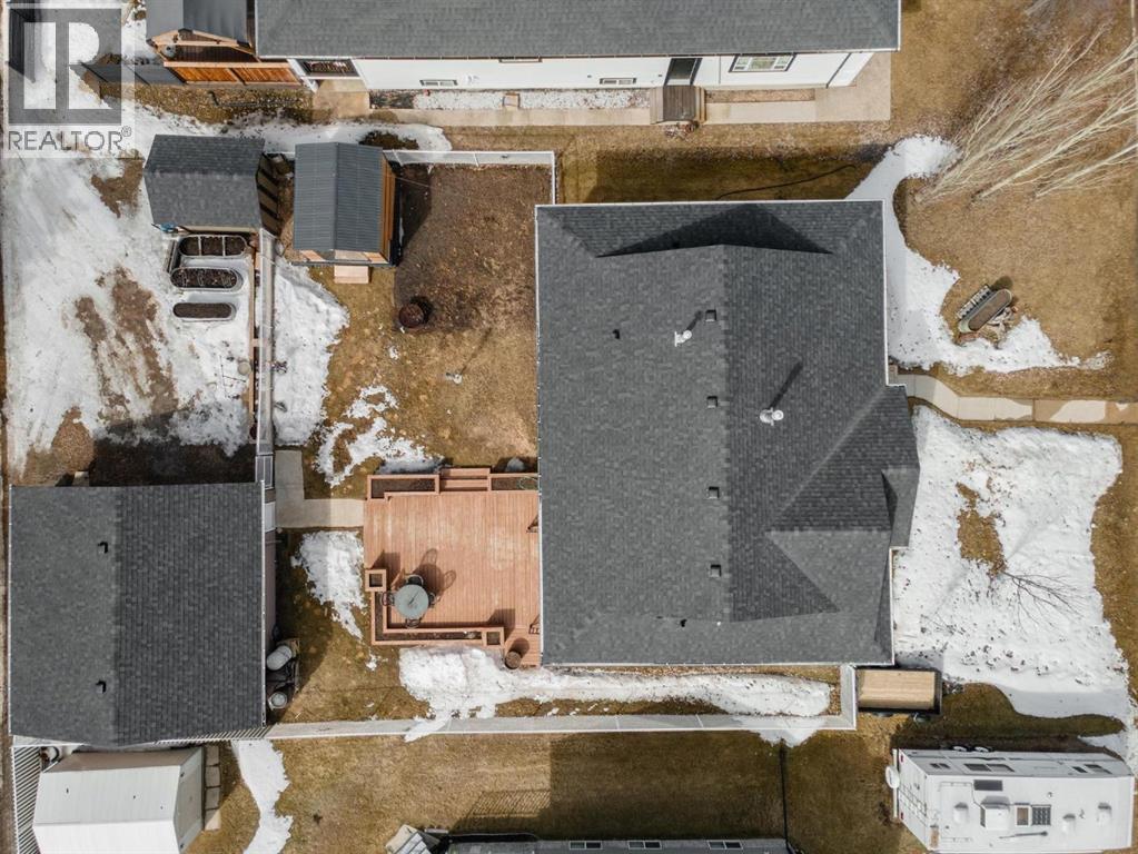 Modern bungalow with custom finishes throughout, offering a well maintained and move-in ready space that balances style and everyday function. Elevated custom kitchen features quartz countertops, custom cabinetry, tile backsplash to the ceiling, and updated appliances. Floating shelving, back island for extra counter space, and an included dining table with bench seating add both function and style. Space continues the flow into the main living area while still offering defined areas. Vaulted ceilings, hardwood floors, triple pane windows, and crown mouldings enhance the home, while a custom stone gas fireplace creates a warm focal point and adds character to the living room. Spacious primary bedroom is set privately at one end of the home with a walk-in closet and ensuite featuring a jetted soaker tub and separate upgraded shower. Two additional bedrooms and a full bathroom are located on the opposite side — a layout that works well for families or guests. Fully developed basement continues the inviting feel with a bright family space designed for movie nights, complete with a custom feature wall, included TV, and wet bar. Two more bedrooms, another full bathroom, and a laundry room bring the total to 5 bedrooms and 3 bathrooms. Added features include central air conditioning, radon extraction system, phantom screen doors, and ample storage with built-in shelving and cabinetry. Outside offers covered front and back porches, a large south-facing deck with custom garden boxes, plus a fully fenced yard with garden plot ready to go. 24x24 detached garage is finished and heated, with room for vehicles, storage, and workspace. Additional yard features include new 10x12 and 8x10 garden sheds for extra storage. Bashaw is a welcoming community with everything you need close by, and kids can ride bikes and play at ease. Enjoy summer nights at Buffalo Lake just a short drive away. Camrose, Stettler, and Red Deer are all within an easy commute. (id:63190)