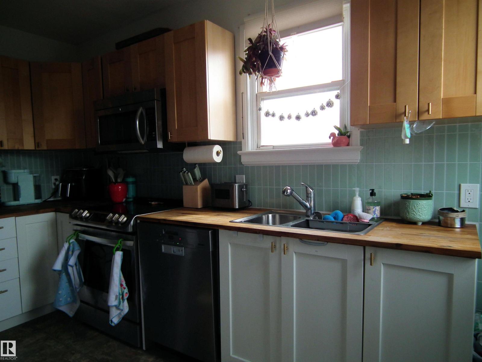 Great Location for access to LRT station and the popular Arts Community of Parkdale just off Alberta Avenue. The home fronts onto the parkland and is just steps from Borden Park as well. The spacious living room can easily be a living room/dining room combo and the kitchen has all the modern amenities. 2 generous bedrooms and a 4 pc. bath complete this level. Downstairs is a complete kitchen (no stove) with a 3 pc bath and a good sized bedroom. Entry can be privately created and separate from the upstairs living area, and the large windows make this convenient for a student or family member. The furnace and air conditioner are 2020, hot water tank 2024, and the larger windows front and back are newer. A new fence encloses the entire yard front and back as a bonus for pets. Zoning is large scale residential so highly suitable for future developement. (id:63190)
