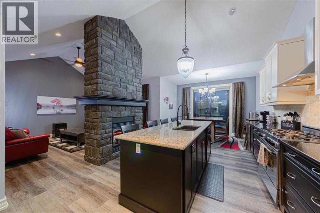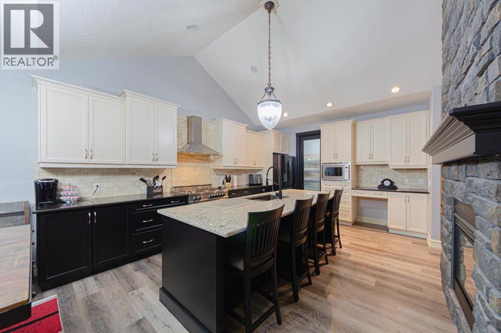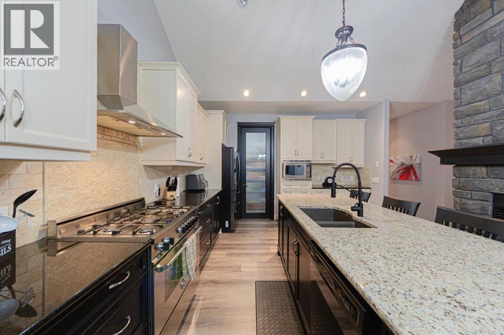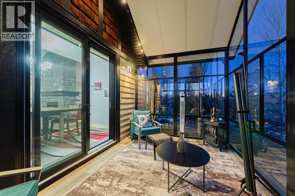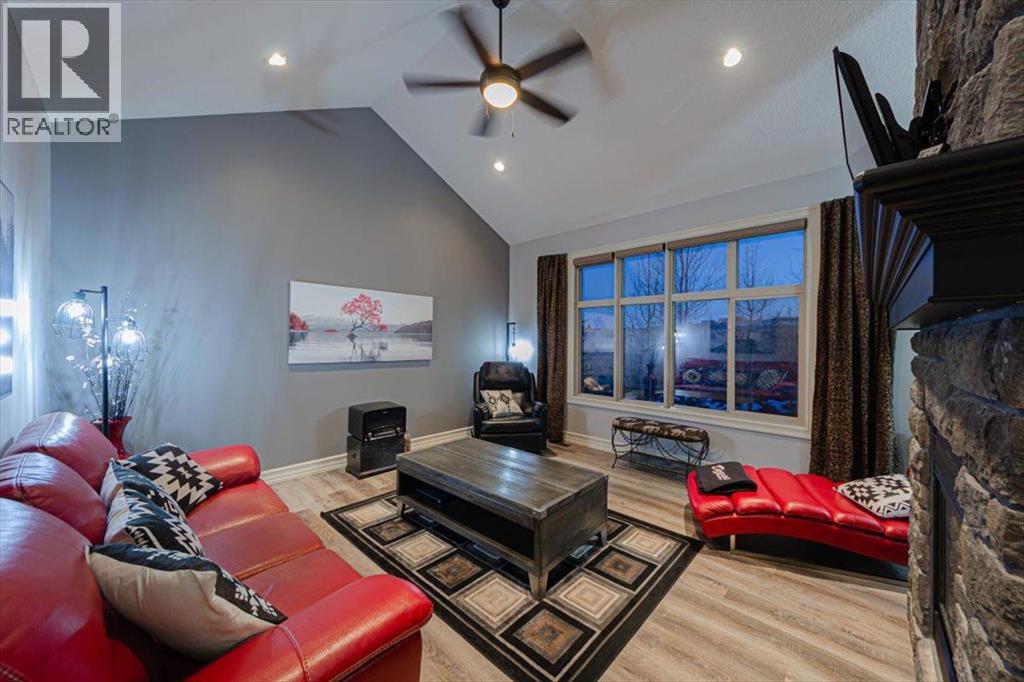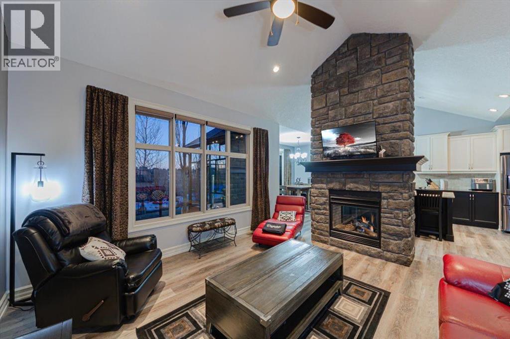 Welcome to an exceptional bungalow estate, gracefully positioned on a beautifully landscaped 0.41-acre lot in the prestigious community of Monterra in the Cochrane Lakes—offering the rare luxury of no rear neighbors and uninterrupted views of tranquil green space. From the moment you arrive, the home’s striking stone exterior and inviting covered front porch set the tone for the elegance within. Step into a grand foyer that opens into a private study, a refined formal living and dining area, where soaring vaulted ceilings and a stunning two-way stone fireplace create an atmosphere of warmth and timeless sophistication. The heart of the home is an exquisitely designed kitchen, thoughtfully appointed with a center island breakfast bar, perfect for both everyday living and entertaining. A beautifully crafted two-way pinnacle fireplace connects the kitchen to the living space, enhancing both ambiance and flow. This home has been meticulously maintained and thoughtfully upgraded, including brand new shingles in 2025 and the addition of a spectacular all-season solarium—an ideal retreat that seamlessly extends your living space into the serene natural surroundings beyond. The fully finished layout offers three spacious bedrooms, including two luxurious ensuites, and a total of three and a half beautifully appointed bathrooms, providing both comfort and privacy for family and guests alike. Downstairs, the lower level is fully finished with the exception of one room ready for your personal needs. For your conveniance there is infloor heating already roughed in. Completing this remarkable property is a triple attached garage, offering ample space for vehicles, and storage. This is more than a home—it’s a private retreat where elegance, comfort, and nature come together in perfect harmony. (id:63190)