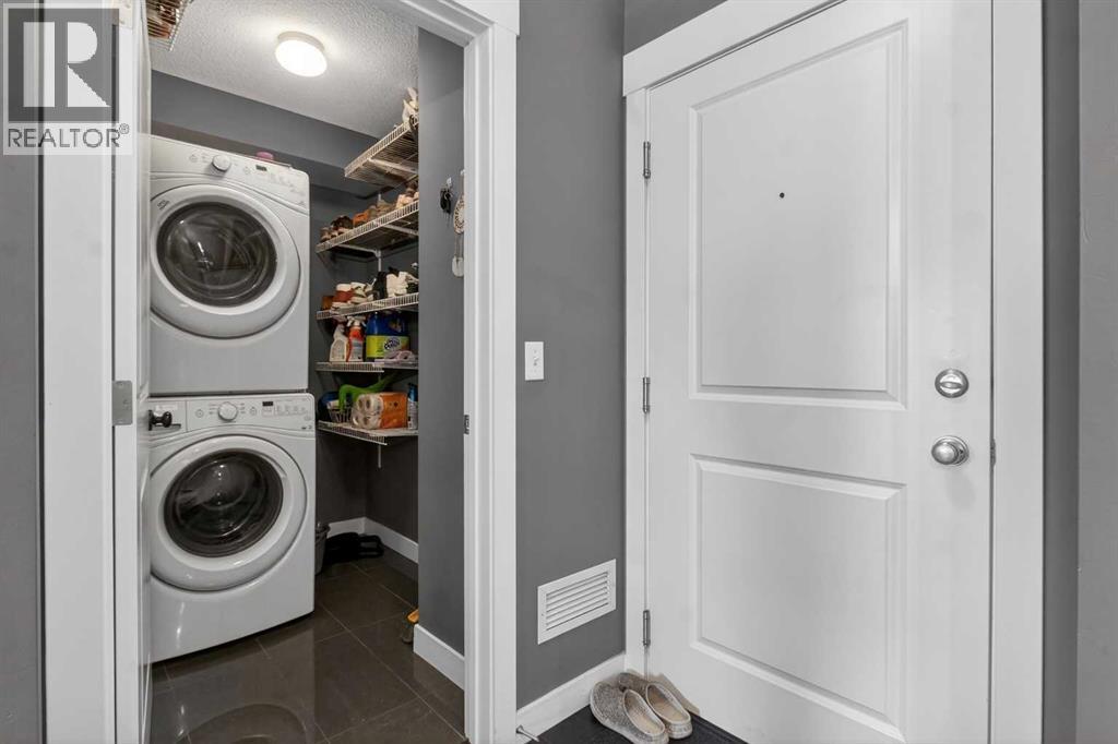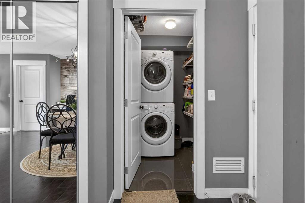 Welcome to this incredibly bright and spacious 818-sq-ft unit in a family-friendly community! This thoughtfully curated 2 – bedroom, 2–bathroom top–floor unit in Skyview Ranch blends style and substance effortlessly, with every room crafted for comfort, natural light, and connection. Morning sunshine streams through the patio doors, bathing the open-concept living area in a gentle glow. From the living room, sliding glass doors usher you onto a generous balcony overlooking the mountains, where you can savor outdoor meals all summer long. The spacious kitchen, framed with full-height cabinetry and refined finishes, feels both grounded and welcoming, including quartz countertops, stainless steel appliances, in-suite laundry, cork flooring, and carpet. A modern light fixture anchors the dining area, perfectly centering your dining table. A built-in desk area is nestled between the dining and living rooms, offering a convenient place for remote work or school assignments. Both bedrooms are ample and finished with luxurious carpeting. The primary bedroom boasts a walk-through closet that opens into a private 4-piece ensuite with a tub/shower combo. The second large bedroom on the far side of the unit is served by an adjacent 4-piece bath. The in-suite laundry is a welcome convenience and provides sufficient storage. This condo also includes the convenience of a titled underground parking stall, along with an additional storage locker located in front of the stall, perfect for seasonal items. As a resident of Skyview Ranch, you’ll enjoy an unbeatable lifestyle with access to schools, shopping, restaurants, parks, and excellent transportation routes, making commuting easy. With quick access to Stoney Trail, Deerfoot Trail, CrossIron Mills, Amazon shipping depot, and The Airport. You’ll be well-connected to go anywhere you want to explore. Schedule your showing today! (id:63190)