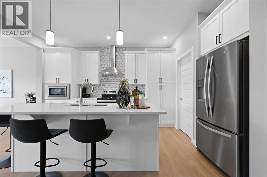 Situated in the community of Bayside, the "Mateo ll" is a thoughtfully designed home with over 2500 sq ft above grade and offers an often hard-to-find four bedrooms on the upper level. The main floor features an open-concept living space with a chef-inspired kitchen, a functional island for prep or entertaining, sleek stainless-steel appliances, and beautiful cabinetry. Not only does this home have 4 bedrooms upstairs, but it also offers a main-floor office. With this home, there is no sacrificing space. The open-concept living space is perfect for entertaining, with ample room for family dinners in the dining room and for relaxing in the living room, which features a striking focal-point fireplace. Complementing the main floor is a mudroom off the garage, which helps keep all the odds and ends organized, and a powder room nicely tucked away. Venturing upstairs, you will notice the open-to-above foyer, which adds a touch of sophistication to the home. A nice-sized loft greets you at the top of the stairs, and the primary suite offers amicable separation from the other three bedrooms, all of which have walk-in closets. The sizeable primary bedroom provides plenty of space for a king-size suite, and the spa-like ensuite offers dual sinks, a soaker tub, a separate shower, and a huge walk-in closet. Completing the upper level is a 3-piece bathroom with a tub, which makes kids' bathtime a breeze and an upper laundry for convenience. The basement is unfinished and has a separate side entrance, 9' ceilings, and is laid out well for future development. Bayside is one of Airdrie’s most desirable communities, known for its scenic canal system and year-round outdoor lifestyle. Residents enjoy walking paths, parks, and activities like paddle boarding in the summer and skating in the winter. With close access to schools, shopping, and everyday amenities, Bayside offers the perfect balance of nature, convenience, and community living. *PHOTOS ARE OF A PREVIOUSLY BUILT MODEL. Col ours will vary. RMS has been applied to construction drawings provided by the builder. Taxes to be assessed. (id:63190)