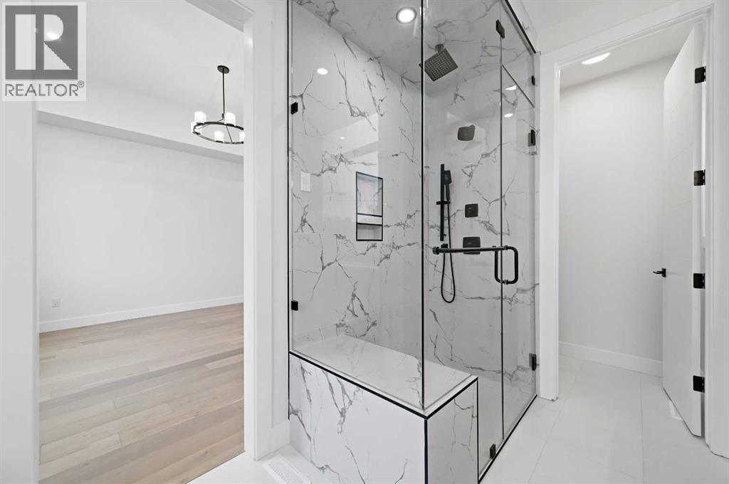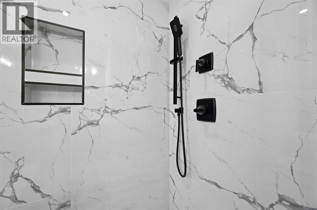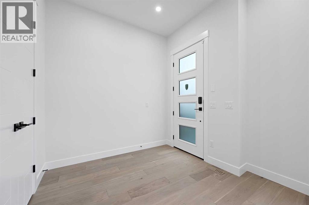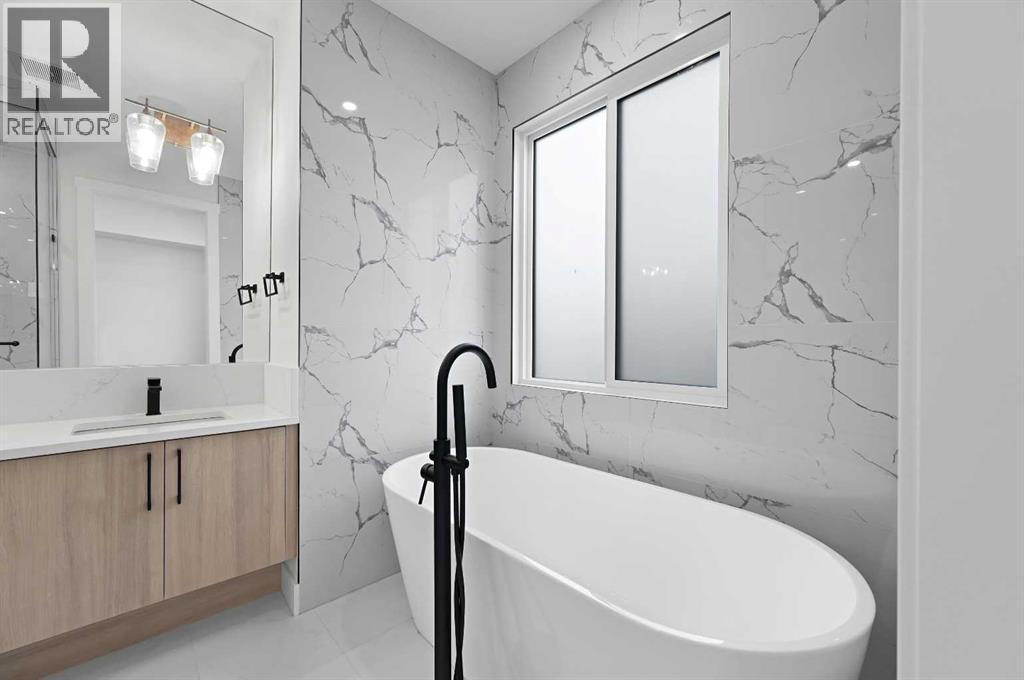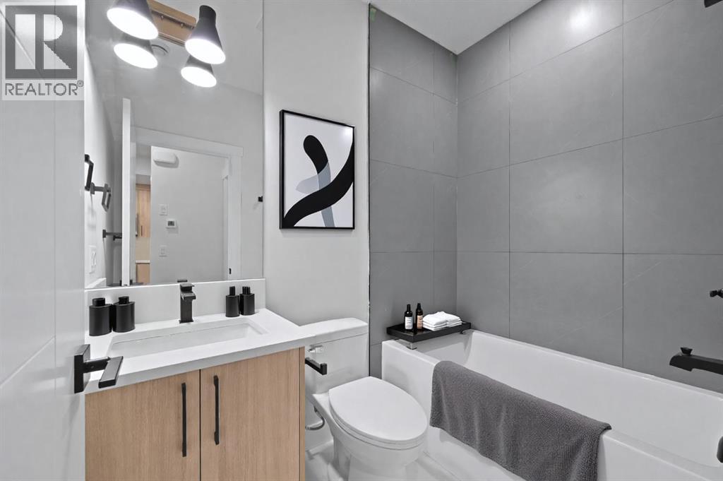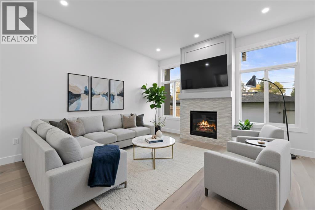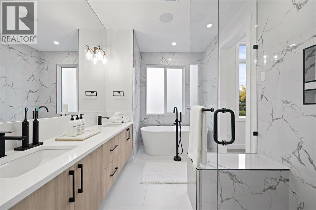 Calling all Investors! Looking for a brand new SXS Duplex with legal basement suites? This 8112 unit can be sold together with attached 8114 to provide an excellent cash flowing opportunity with the convenience of having all construction materials and components still under New Home Warranty. Both 8112 and 8114 are rented on long term leases with tenants who would prefer to stay. This unit rents monthly at $2900 for the upper suite + 70% util. and $1250 + 30% util. for the lower suite. Amazing home boasting elevated design and incredible functionality, featuring a legal 2-bedroom basement suite and a sunny south exposed front with expansive valley views from the upper floor. Every detail was thoughtfully selected, from the wide-plank modern floors to the curated lighting and premium finishes throughout. Step inside to a bright, open-concept main floor with 10' ceilings, oversized windows and neutral tones that create an airy, inviting vibe. The large, well-lit dining room is perfect for bigger families and/or hosting guests and shows off a vibrant and colourful feature wall, which flows seamlessly into a designer kitchen featuring modern warm toned cabinetry, paired with beautifully coloured glass backsplash, quartz countertops, matte black hardware, a huge walk-in pantry with built-in shelving, and a perfect-sized center island with bar seating with more natural wood tones, bringing everything together beautifully. The upgraded stainless steel appliance package includes an oversized sub zero fridge with french doors, a gas cooktop with stylish hood fan, and a thoughtfully placed wall oven and microwave. The rear living room is wide and spacious featuring additional large windows plus a cozy gas fireplace with stone surround and custom mantle, and which leads you out to the large backyard, which features an oversized concrete pad, perfect for end of the day BBQ's and lounging. An enclosed mudroom with a large closet area and a sleek powder room that comes with a rai sed matte black sink complete the mainfloor. Upstairs contains the three large bedrooms, all with trayed ceilings, including the primary bedroom which is a true retreat that features a large walk-in closet with several custom built-ins plus a hotel like ensuite. Enjoy heated tile flooring, dual sinks, quartz countertops, matching tile surrounds, plus a free standing soaker tub and an oversized glass shower with rain shower head and roughed-in for steam. The upper laundry room comes with a sink, quartz countertops, additional wood toned cabinetry, and is situated beside the stylish full bathroom which features a tiled tub/shower combo. Downstairs features the thoughtfully designed legal 2 bedroom suite and features 9' ceilings, luxury vinyl plank flooring, wonderfully warm toned cabinetry, stainless steel appliances and lots of pot lighting. A full bathroom with elegant tile is also featured plus a dedicated laundry room, separate side entrance and storage, making this perfect for rental income. (id:63190)