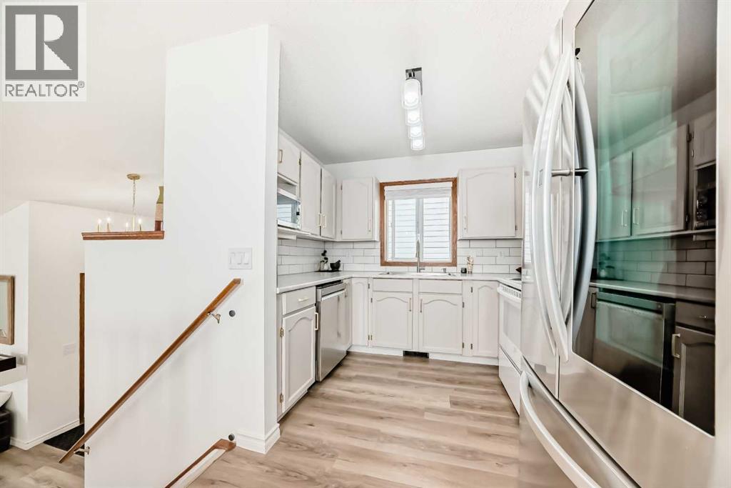 BACK ONTO GREEN SPACE, step into comfort, and fall in love with a great family lifestyle! Welcome to this beautiful cozy Updated Bi-Level home perfectly designed for modern family living. Offering a total of 3 bedrooms and a FULLY FINISHED basement, this home combines style and functionality in a highly sought-after location. The main level features soaring vaulted ceilings in the living room and a large bay window that fills the space with natural light, creating an airy and inviting feel from the moment you walk in. Enjoy the OPEN-CONCEPT layout, where the kitchen and dining nook flow seamlessly together—practical and perfect for everyday living and entertaining. The nook area features sliding patio doors leading to the backyard, making indoor-outdoor living effortless. The spacious and large primary bedroom offers a comfortable retreat together with another good size bedroom on this level, while the lower level provides even more living space with a cozy fireplace, ideal for relaxing evenings or hosting family and friends, or a great workspace and/or gym space. This home has been thoughtfully updated with new flooring and newer appliances, showcasing pride of ownership throughout. Step outside to a private backyard complete with a shed, backing onto a wide open field offering ample privacy, school, and nearby community center (school and community centre only steps away from the home), offering both privacy and beautiful surroundings. Additional highlights include a paved back alley and convenient access to schools, parks, and public transportation, making this an ideal choice for families. MOVE-IN READY, well cared for, and in an unbeatable location—this is one you don’t want to miss! Welcome Home! (id:63190)