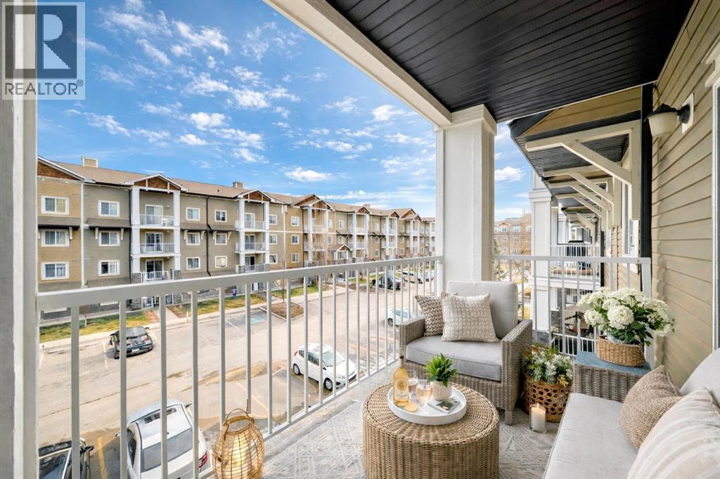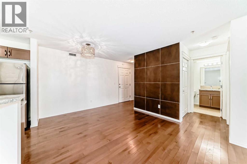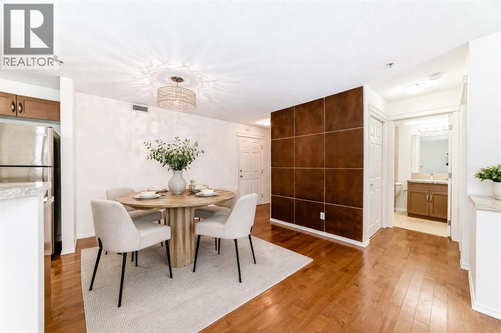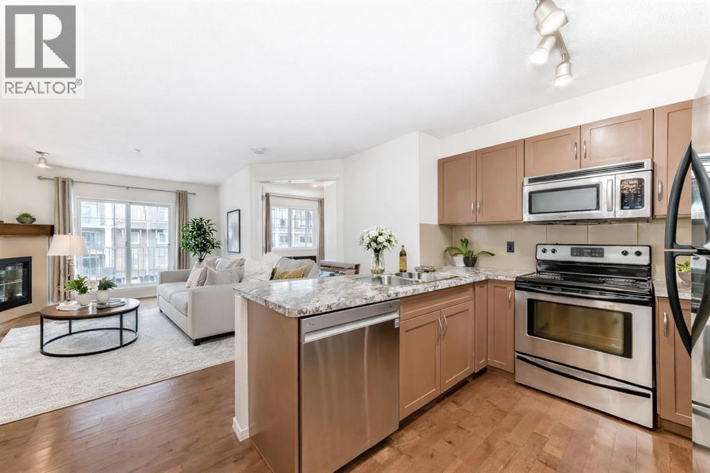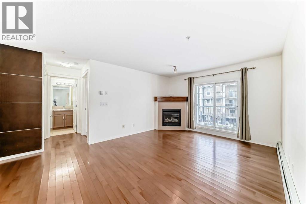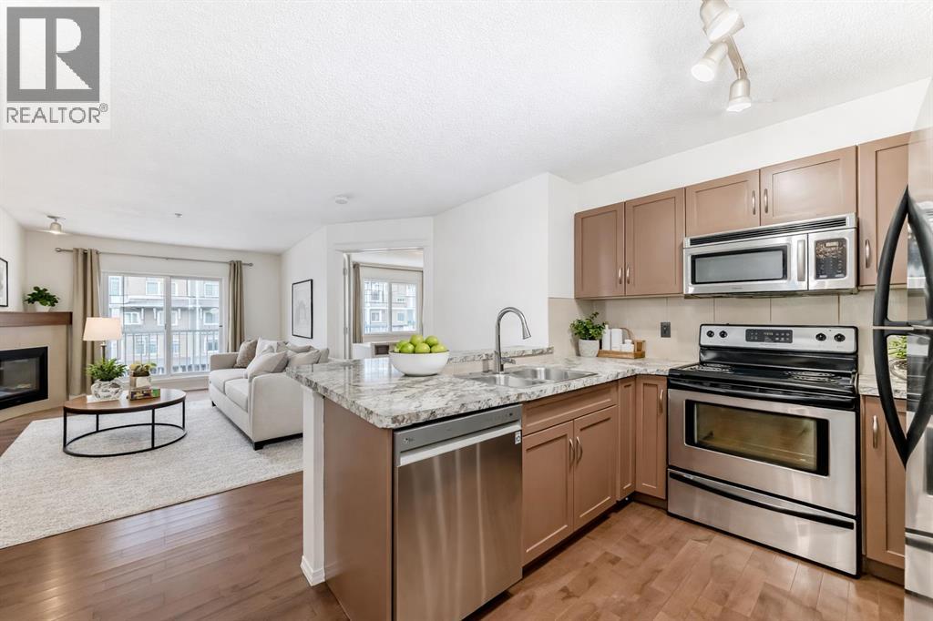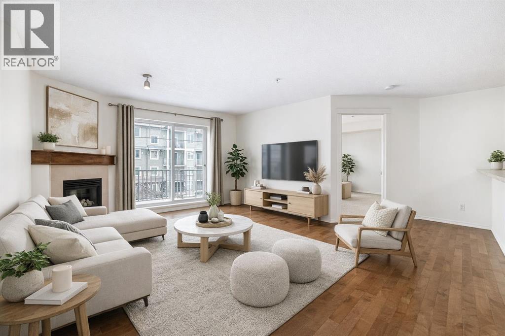 Welcome to Prestwick Place in McKenzie Towne—an updated, contemporary apartment-style condo offering 841 sq. ft. of comfortable, open-concept living just minutes to schools, parks, and shopping. Hardwood flooring flows through the main living space, where a bright open kitchen features stainless steel appliances, and an island. The spacious living room is anchored by a cozy fireplace with direct access to the balcony—perfect for morning coffee or evening downtime. The thoughtful layout includes two generous bedrooms, with the primary including a walk-in closet and 4-piece ensuite, plus a versatile den ideal for a home office or storage. Recent updates include fresh paint, new countertops, a newer dishwasher, and a newer microwave/hood fan. Finished with in-suite laundry. One indoor titled parking stall with a storage locker. Some photos have been virtually staged to give you an idea of what you can do with this great space. Condo fees: $461.43. (id:63190)