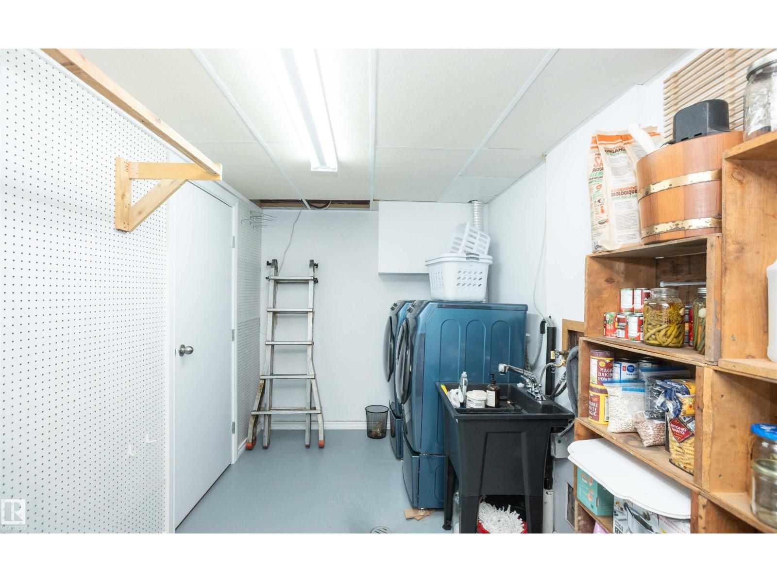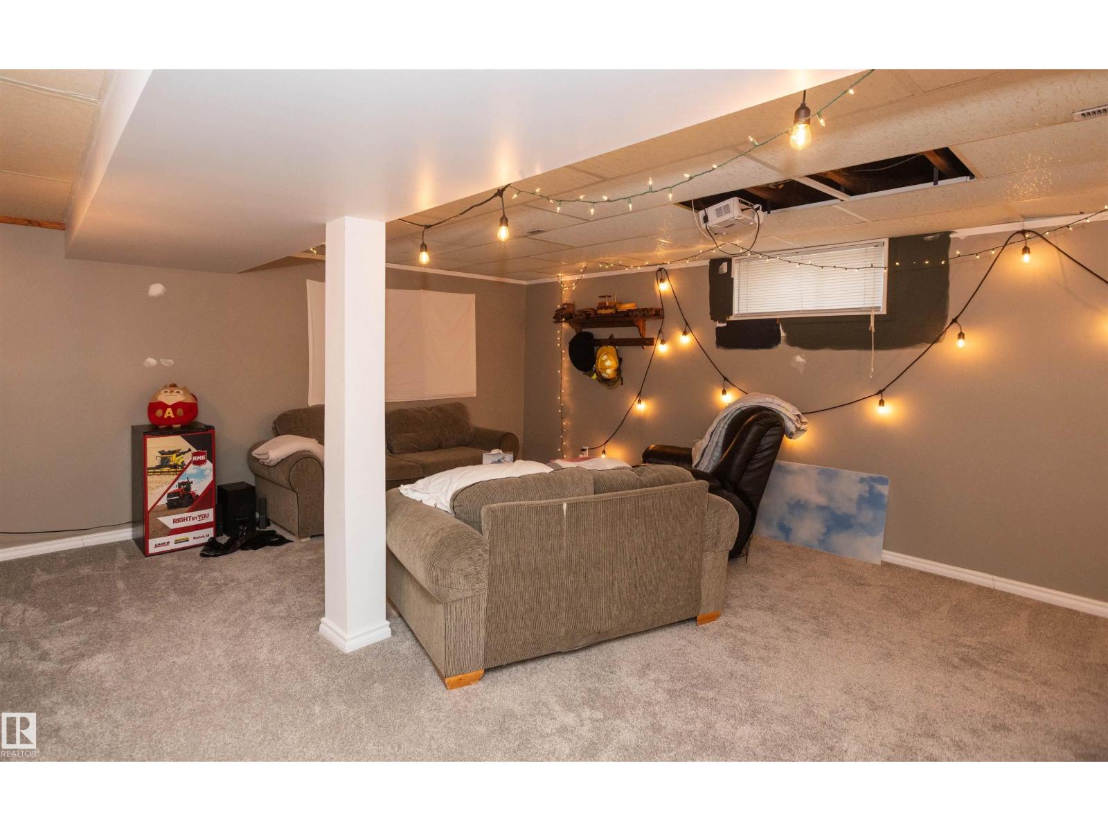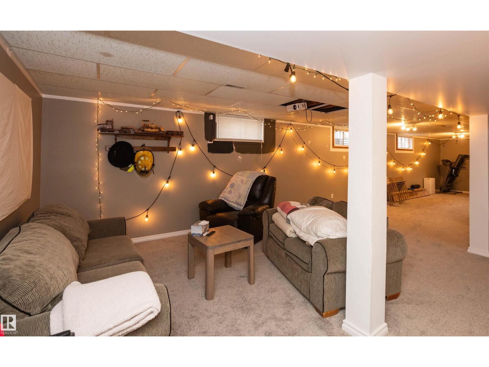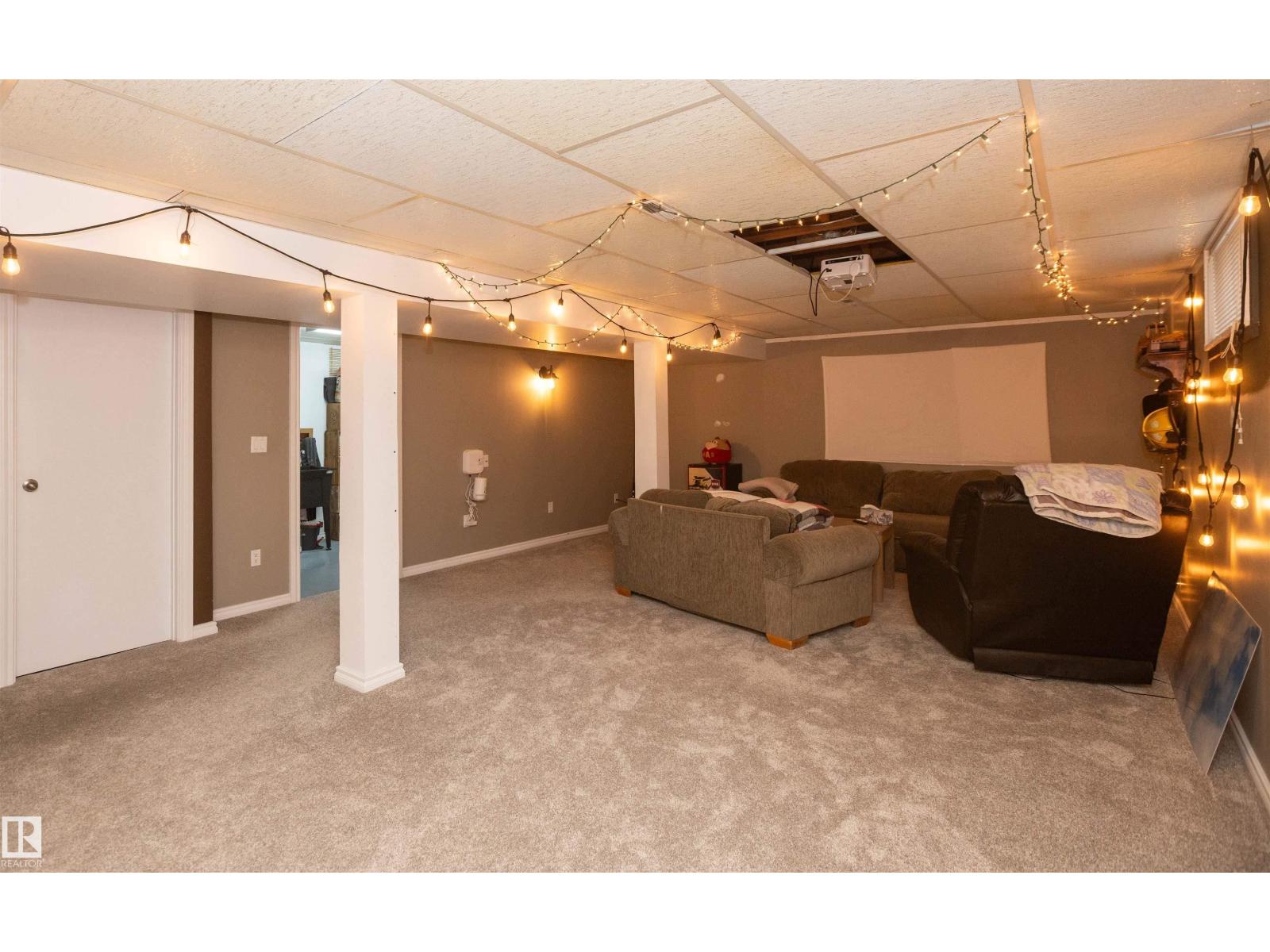 Across from Westlock Elementary school is a lovely home. Bright south-facing kitchen w/white cabinets, nice countertops, beautiful appliances (gas stove 1 yr) & nice eating area. Patio doors to deck on west. Spacious living room is lovely & bright. Three bedrooms main floor- the primary bdrm has full wall of closets. Bdrm 2 - nice size & bdrm 3 makes a nice den or office w/patio doors to large deck. Main floor bath w/double sinks, deep soaker tub & ceramic floor. Downstairs you'll find a massive family room w/beautiful carpet, large bdrm w/French doors & ensuite bath, laundry room w/plenty of space & front load W/D, storage room & furnace room. On your front deck sit and watch the fireworks on July 01. In the rear yard enjoy the beautiful new deck, trees & privacy. There is an area perfect for a garden, also two storage sheds, trees, new lawn & new landscaping! New shingles 2023. Furnace & water tank upgraded - not sure of date. Room for garage at rear or park on front driveway (room for 2) or street. (id:63190)