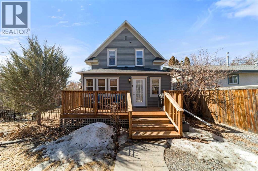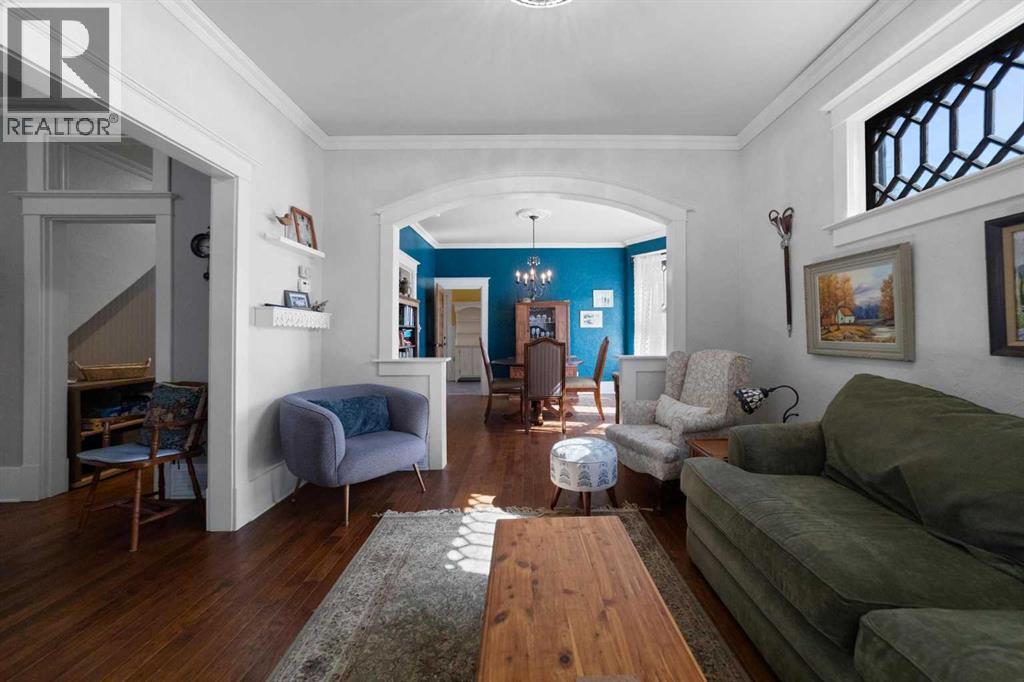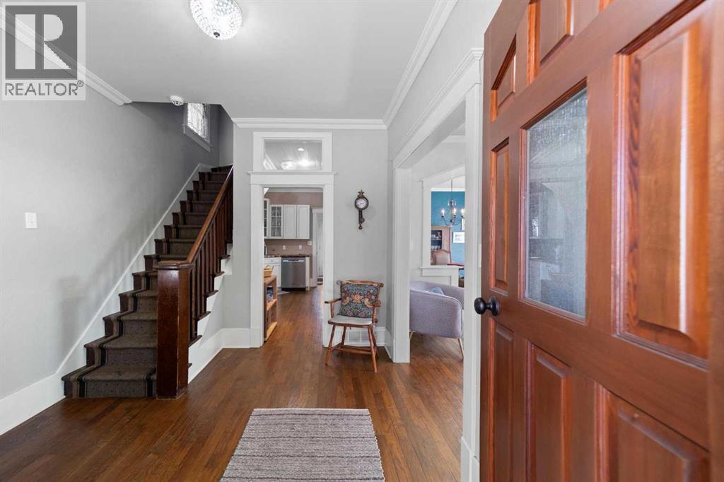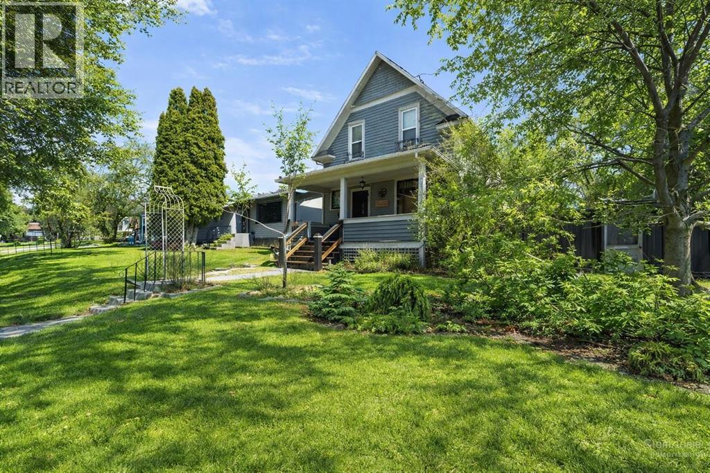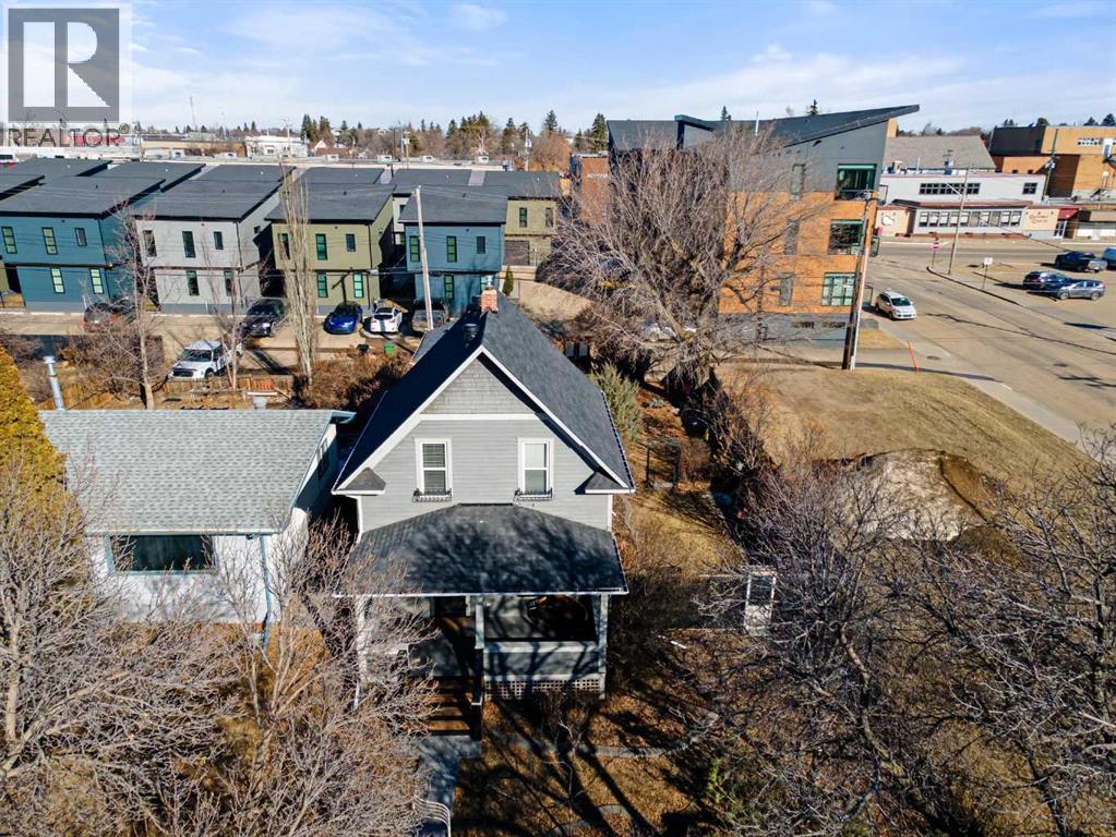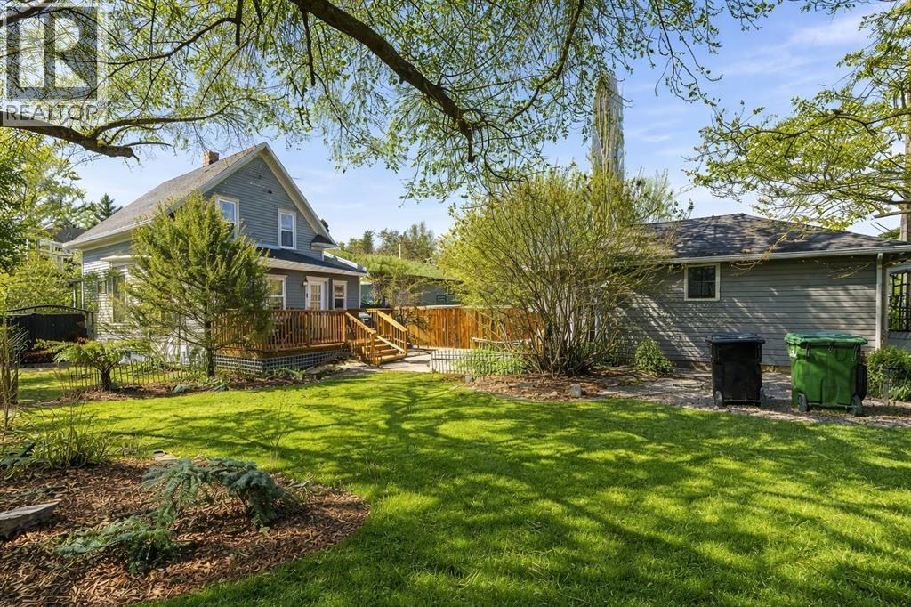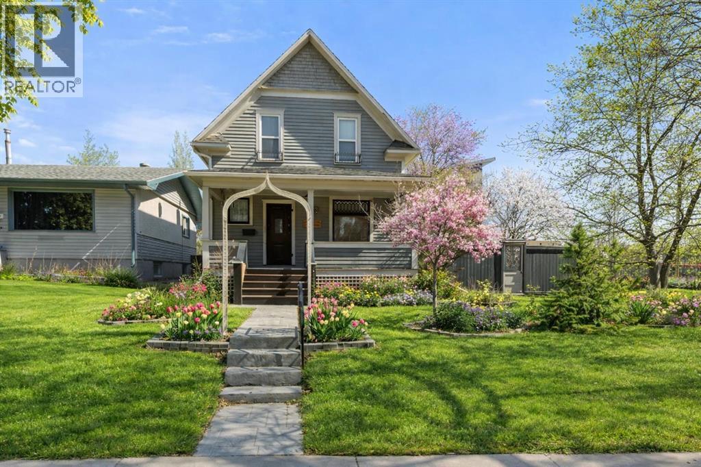 This home tells a story, and it's ready for the next chapter with you! The epitome of grandeur, charm and character, this 1912 two story home in the downtown core of Camrose offers convenience, lifestyle and charisma that is a true rarity. Pride of ownership is evident with outdoor living elevated from every direction - a stately covered front porch, fully fenced and landscaped back yard and deck with new stairs, an aggregate patio, fruit trees, flower gardens, raised beds, lilacs, peonies, roses, a rhubarb patch, flowering shrubs and the canopy of a mature poplar tree. In the glory of summer while in full bloom, it creates a park like setting - your very own secret garden escape. Offering timeless curb appeal with classic architectural details and a warm welcoming neutral pallet, you won't be disappointed as you step inside. Rich hardwood floors, crown moulding, wide doorways and trims, tall ceilings and defined living spaces help keep the authenticity of the era while meshing modern and stylish touches like the crystal fandelier in the living room. The large windows flood the main floor with light, and the bay windows in the formal dining room expand your views while enjoying time around the table. There is a 4 season sunroom at the back of the house, along with an updated 3 piece bath. In the kitchen you will appreciate the updated appliances, new butcher block counters and an idyllic balance of openness and separation. The crafted staircase leads you to the second story where you will find another full bath complete with claw foot tub, 3 bedrooms and a generous landing that creates a flex space. In the basement you will find a wide open canvas to finish to your desire or continue to enjoy as a functional laundry, storage and utility room. The HWT was replaced summer of 2025, the furnace in 2024 and there is even central vac and a water softener installed for extra convenience. The single garage has alley access, and you can stroll across the street for groceri es or access to mirror lake, and downtown shops and services are a mere block away. With rich heritage and a bright future, this solid home was built to last - don't wait to book your viewing today! (id:63190)