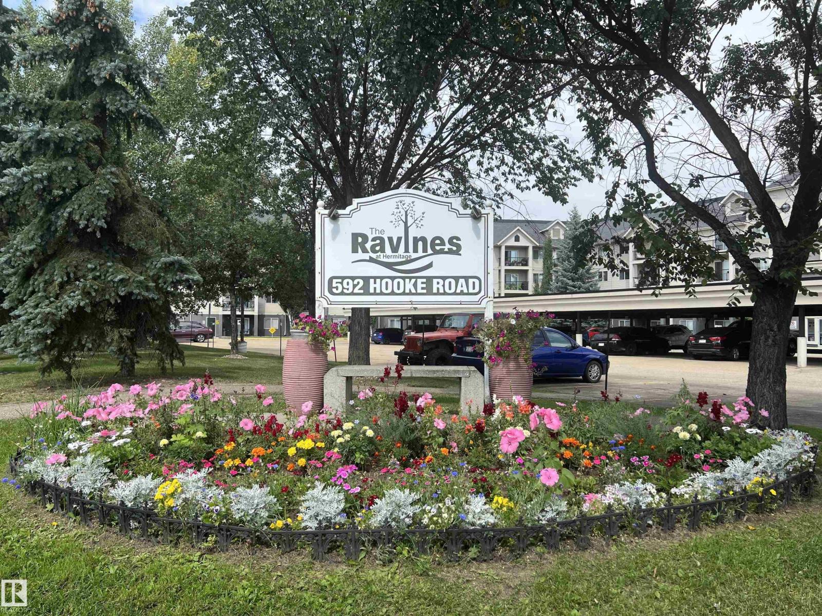 Here Comes the Sun in this Bright and Beautiful South Facing Condo located in the Ravines at Hermitage. This 2 Bedroom with 1 HUGE Bathroom, Features In-Site Laundry, Open Concept, Enjoy the convenience of a covered powered parking stall. The building backs onto a beautiful ravine with walking/biking trails - perfect for nature lovers. Amenities room with Pool Table, Shuffle Board, Library, Kitchen, TV. Small pets allowed with board approval. Condo fees include Heat & Water. A great opportunity for first-time buyers, downsizers, or investors. (id:63190)