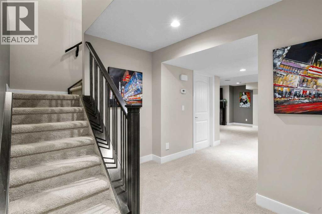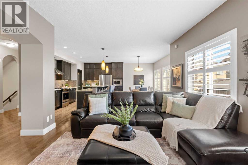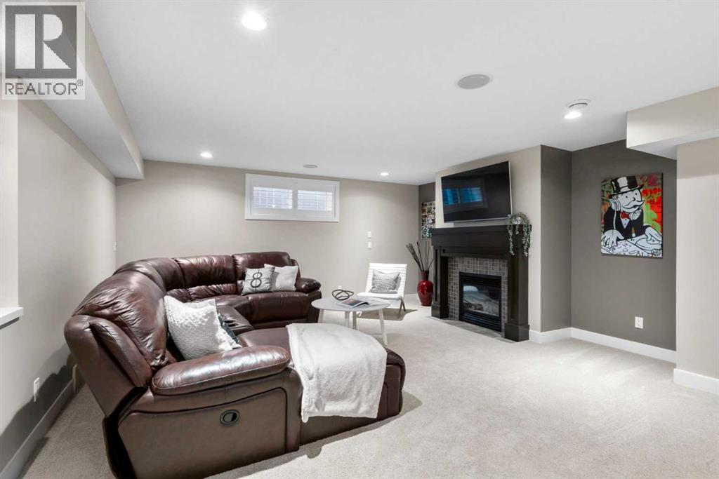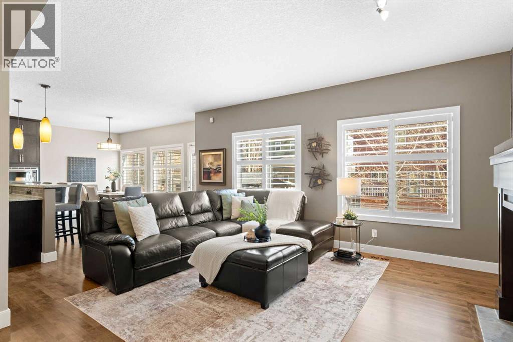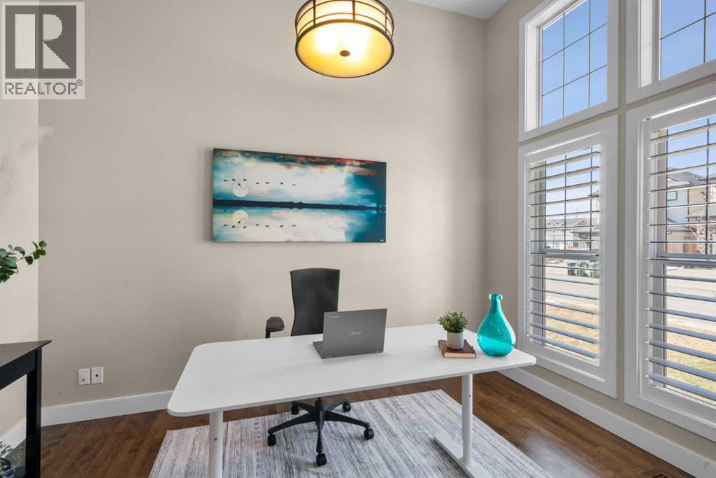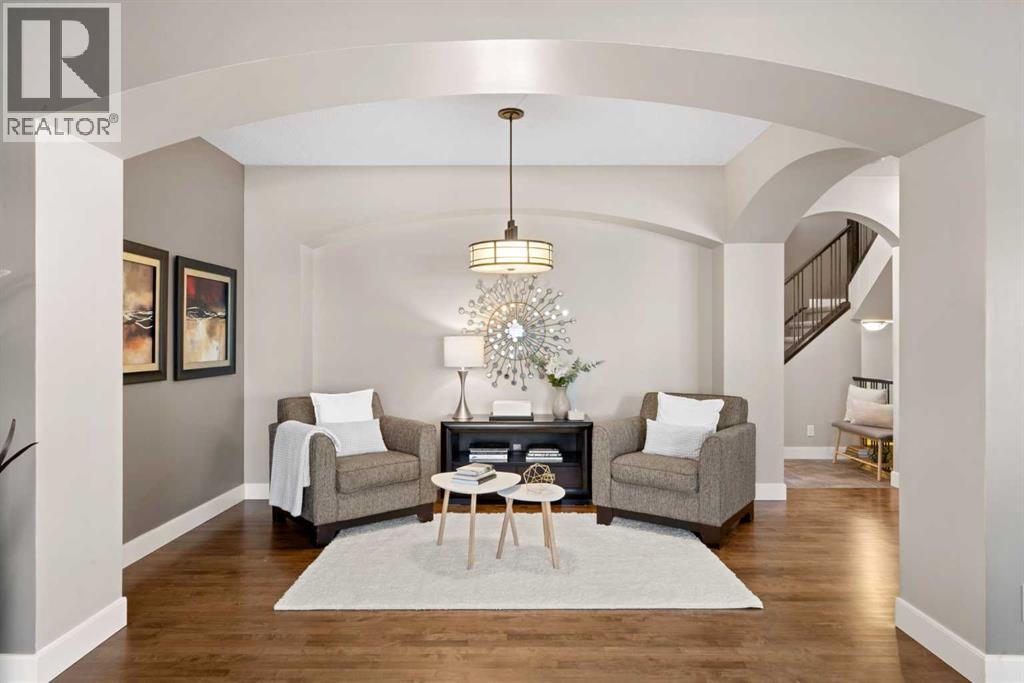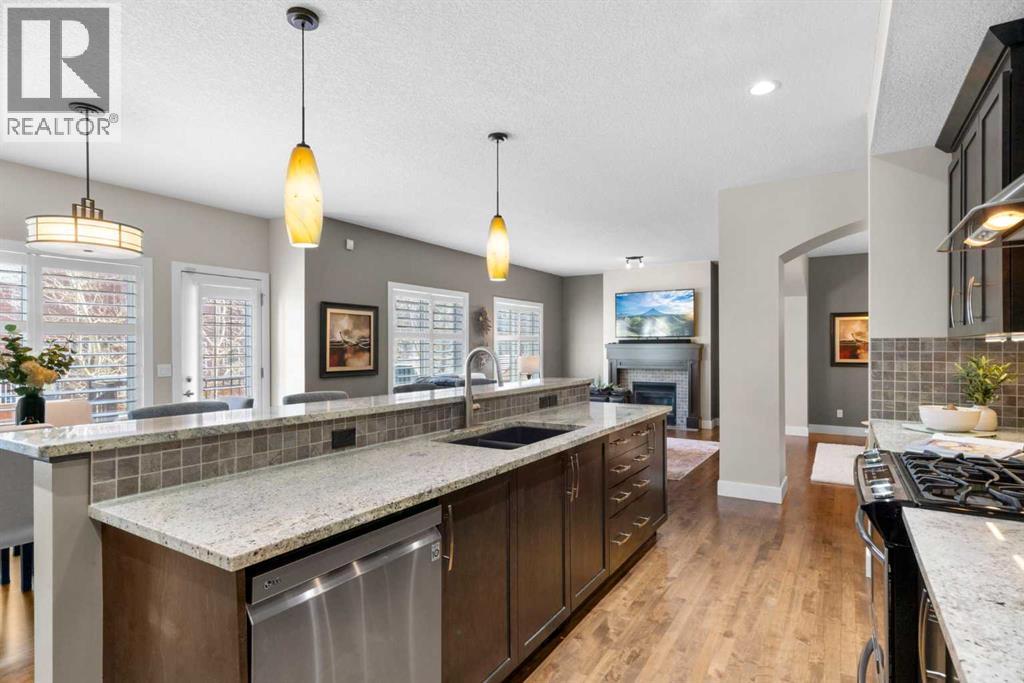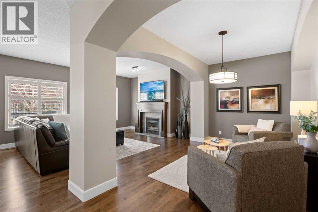 Welcome to this elegantly designed luxury residence offering nearly 4,000 sq ft of sophisticated living space, thoughtfully crafted to balance comfort and functionality. From the moment you enter, you’re greeted by a bright, airy interior featuring 9’ ceilings, rich hardwood flooring, and an abundance of natural light, creating a warm and refined atmosphere.The main level showcases a striking open-concept layout. The chef-inspired kitchen is a true showpiece, featuring a stunning oversized island, extensive cabinetry, and a walk-through pantry connecting seamlessly to a spacious mudroom. The inviting living room is anchored by a gas fireplace, while a private main-floor office offers a quiet and versatile workspace.Upstairs, the primary suite is a luxurious retreat, complete with a spa-inspired ensuite and expansive walk-in closet. Completing the upstairs is a spacious bonus room with fireplace and two additional generous sized bedrooms—both with walk-in closets—provide exceptional comfort.The fully developed basement extends the home’s living space with a wet bar, expansive recreation area, third fireplace, fourth bedroom, full bathroom, and ample storage—perfect for entertaining and family living.Step outside to a beautifully landscaped backyard with a deck, patio, gazebo, and hot tub, creating a serene, resort-inspired setting—perfect for entertaining or unwinding in style and comfort.Ideally located on a quiet street in one of Airdrie’s most sought-after communities, with creekside pathways, parks, schools, shopping, restaurants and transit all close by, this is a rare opportunity you won’t want to miss. (id:63190)