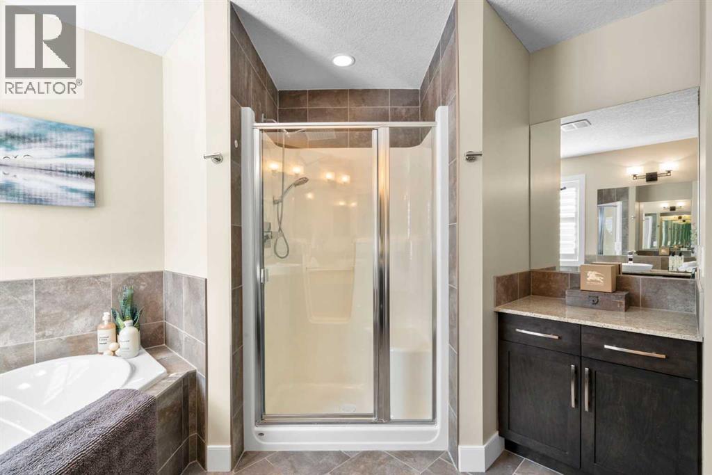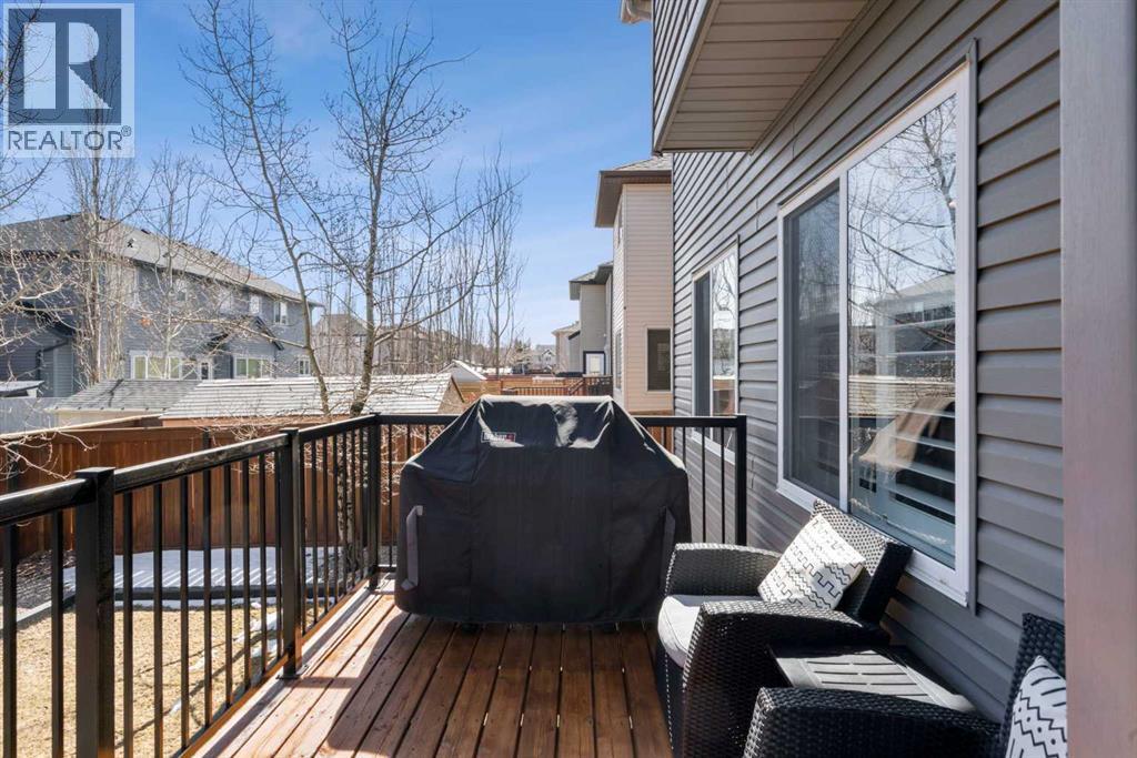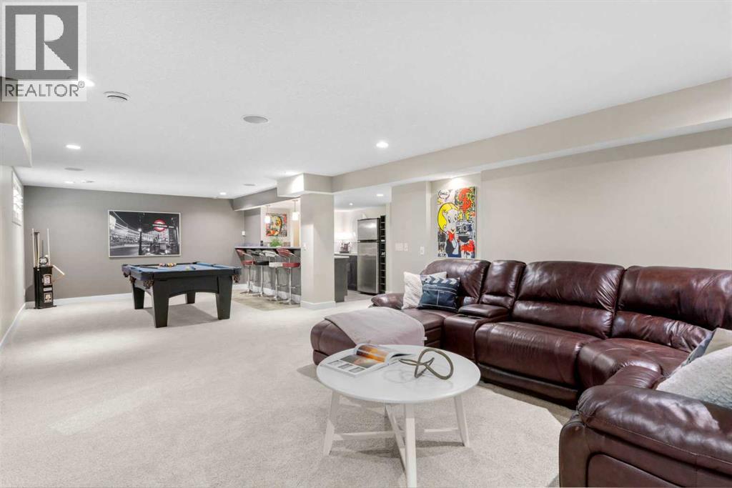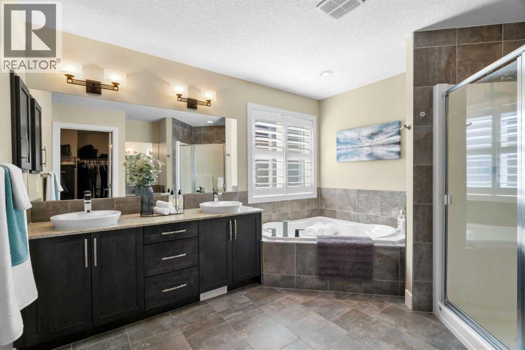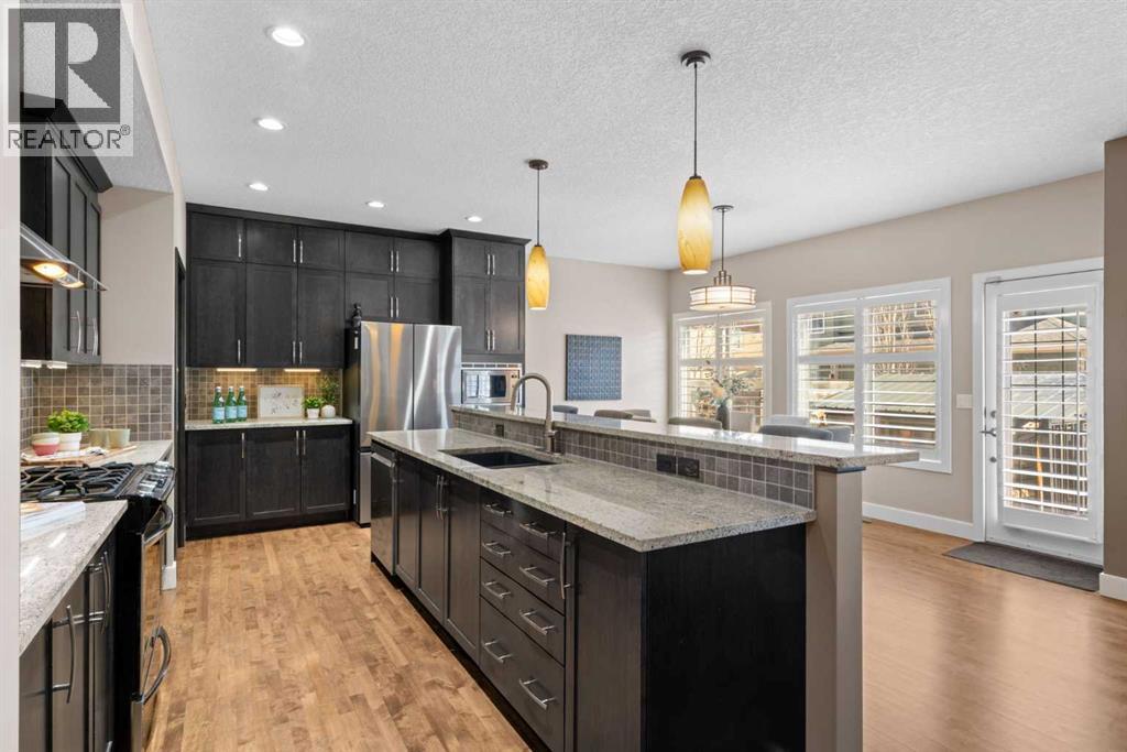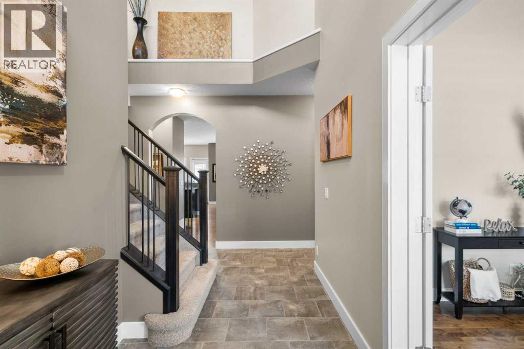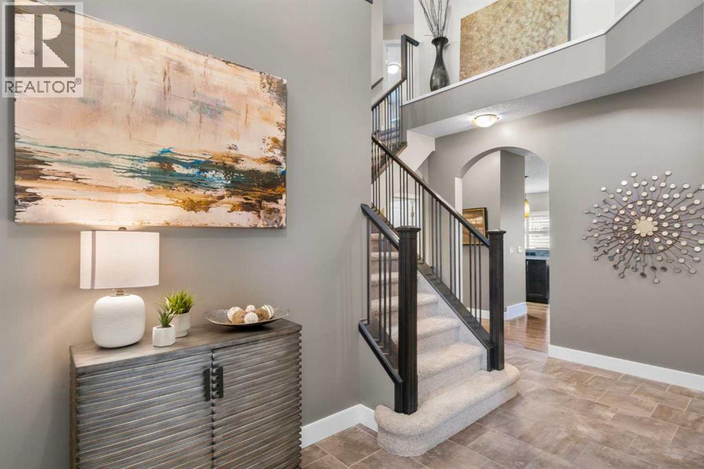 Welcome to this elegantly designed luxury residence offering nearly 4,000 sq ft of sophisticated living space, thoughtfully crafted to balance comfort and functionality. From the moment you enter, you’re greeted by a bright, airy interior featuring 9’ ceilings, rich hardwood flooring, and an abundance of natural light, creating a warm and refined atmosphere.The main level showcases a striking open-concept layout. The chef-inspired kitchen is a true showpiece, featuring a stunning oversized island, extensive cabinetry, and a walk-through pantry connecting seamlessly to a spacious mudroom. The inviting living room is anchored by a gas fireplace, while a private main-floor office offers a quiet and versatile workspace.Upstairs, the primary suite is a luxurious retreat, complete with a spa-inspired ensuite and expansive walk-in closet. Completing the upstairs is a spacious bonus room with fireplace and two additional generous sized bedrooms—both with walk-in closets—provide exceptional comfort.The fully developed basement extends the home’s living space with a wet bar, expansive recreation area, third fireplace, fourth bedroom, full bathroom, and ample storage—perfect for entertaining and family living.Step outside to a beautifully landscaped backyard with a deck, patio, gazebo, and hot tub, creating a serene, resort-inspired setting—perfect for entertaining or unwinding in style and comfort.Ideally located on a quiet street in one of Airdrie’s most sought-after communities, with creekside pathways, parks, schools, shopping, restaurants and transit all close by, this is a rare opportunity you won’t want to miss. (id:63190)