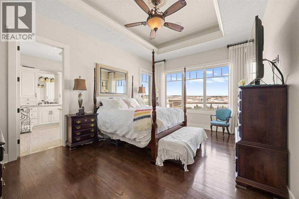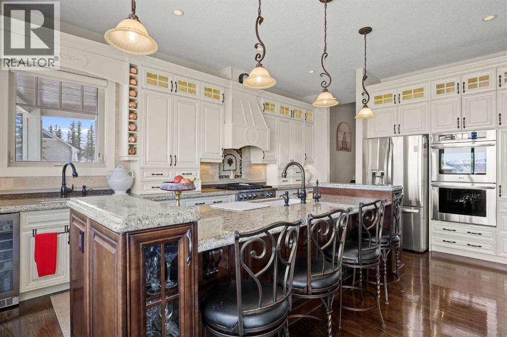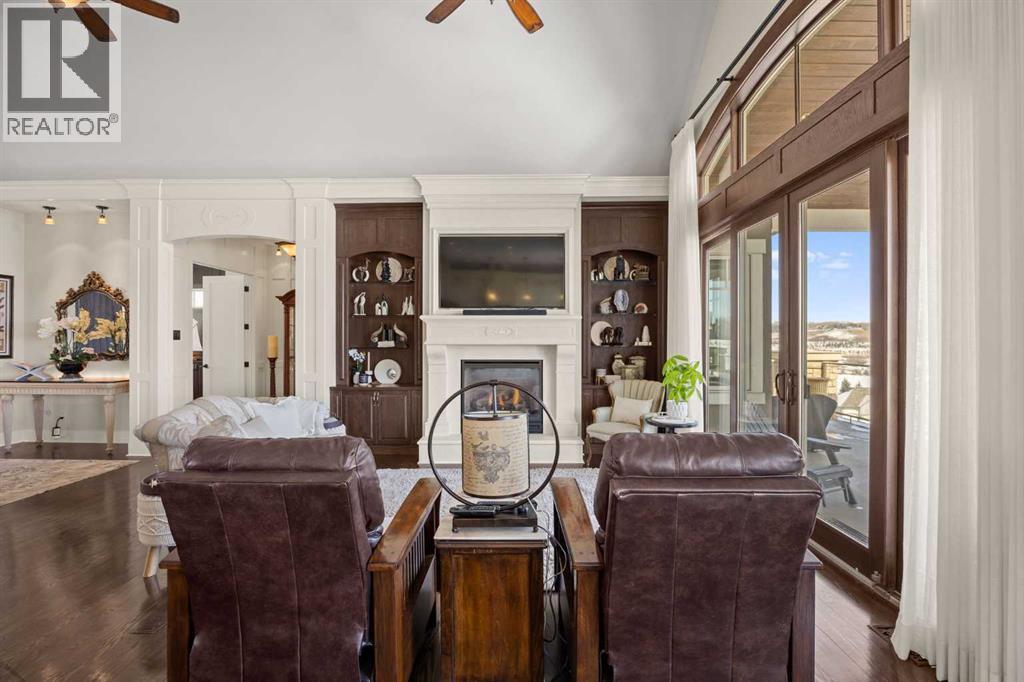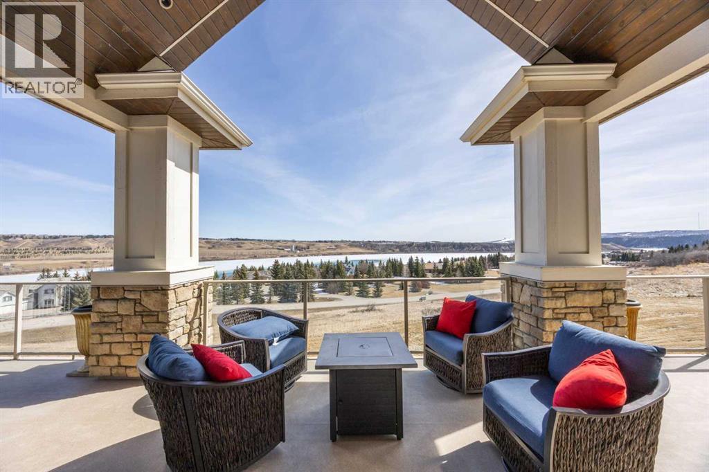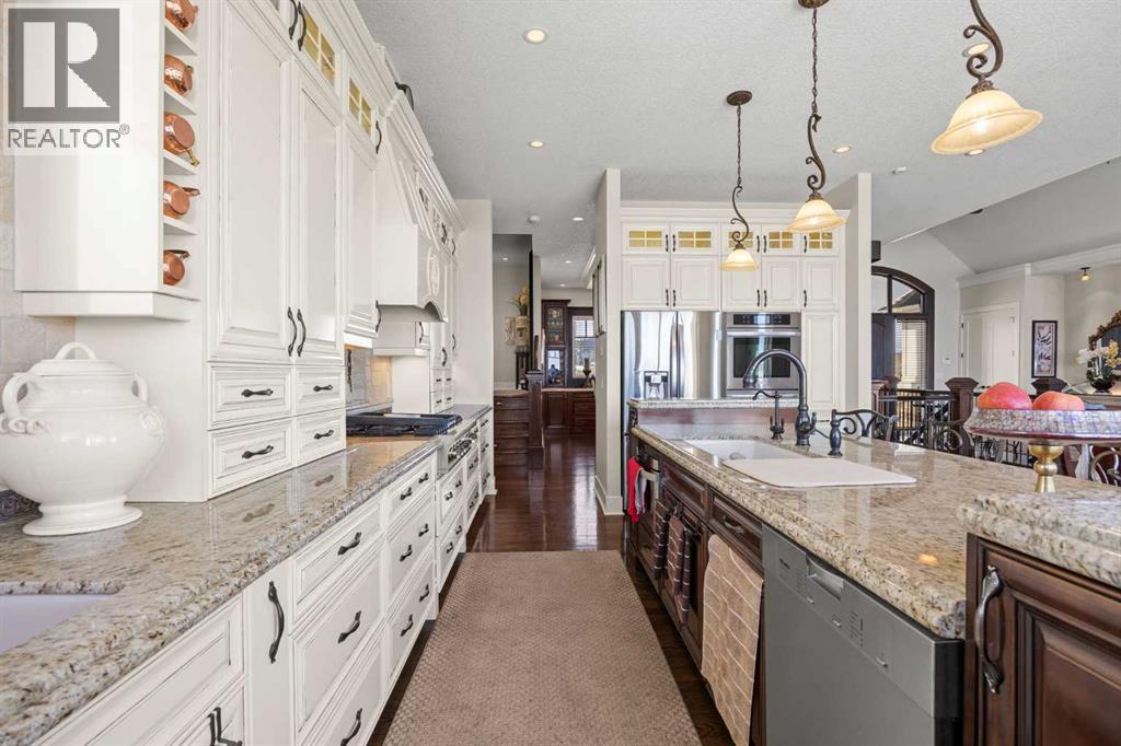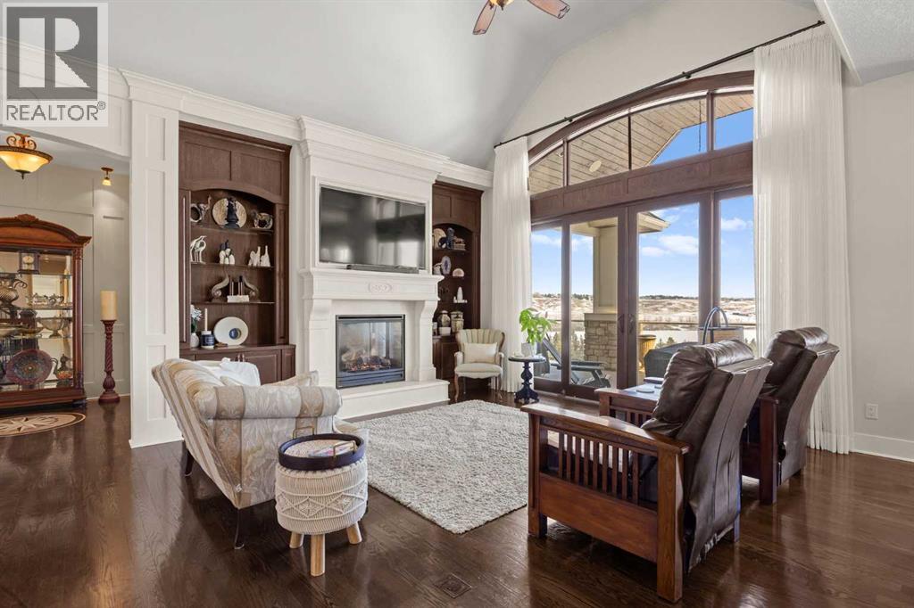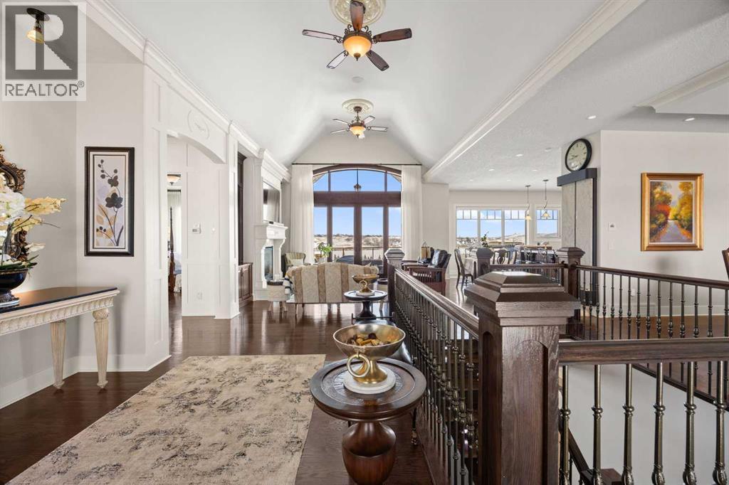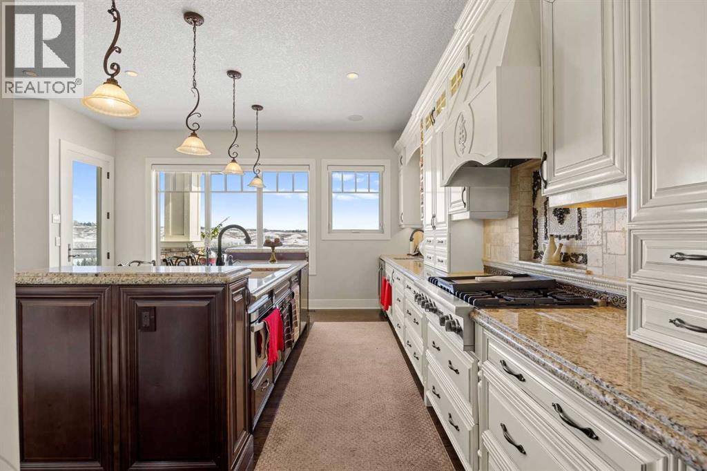 Perfectly positioned along the ridge in Emerald Bay, this custom-built walkout bungalow captures sweeping, unobstructed views of the Bow River and Rocky Mountains. Set on a quiet cul-de-sac, the home offers a rare combination of privacy, elevation, and a constantly changing natural backdrop.The main level is thoughtfully designed to showcase the scenery from nearly every principal room. Soaring vaulted ceilings and expansive windows draw the outdoors in, filling the living spaces with natural light while framing the river valley and mountain peaks beyond. The living room, anchored by a fireplace, flows seamlessly into the dining area and chef-inspired kitchen—creating an ideal setting for both everyday living and entertaining. The kitchen is anchored by a large granite island with seating, complemented by extensive cabinetry, a walk-through pantry, and direct access to a spacious mudroom and oversized laundry room that add exceptional day-to-day convenience.Privately set on its own upper level, the primary suite offers a peaceful retreat with elevated views, a spacious walk-in closet with a dedicated makeup area, and a luxurious ensuite featuring a soaker tub, glass rain and steam shower, and dual vanities.A main floor bedroom with its own ensuite provides flexibility for guests or multi-generational living, while a dedicated office creates a quiet work-from-home space. Above the garage, a private mother-in-law suite with its own separate entrance offers ideal accommodation for extended family, guests, or live-in support.The fully developed walkout basement expands the home’s versatility with three additional bedrooms, multiple bathrooms, a large family room, full bar, gym, and flexible spaces including a den and extensive storage . In-floor heating throughout the lower level and primary ensuite adds an extra layer of comfort year-round, while direct access to the lower patio creates a seamless indoor-outdoor connection.Outdoor living is just as compelling , with an expansive upper deck perfectly positioned to take in the panoramic views, along with a covered lower patio for more private gatherings. Exposed aggregate finishes on the patio and walkways enhance both durability and curb appeal.The fully finished triple attached garage is designed with both function and presentation in mind, featuring epoxy floors, built-in drainage, and in-floor heat, while an additional bay expands capacity to a total of four vehicles.With 5 bedrooms, 4 full bathrooms plus a powder room, and over 5,800 sq ft of developed living space, this home offers a rare opportunity to enjoy elevated acreage living with truly exceptional views. (id:63190)