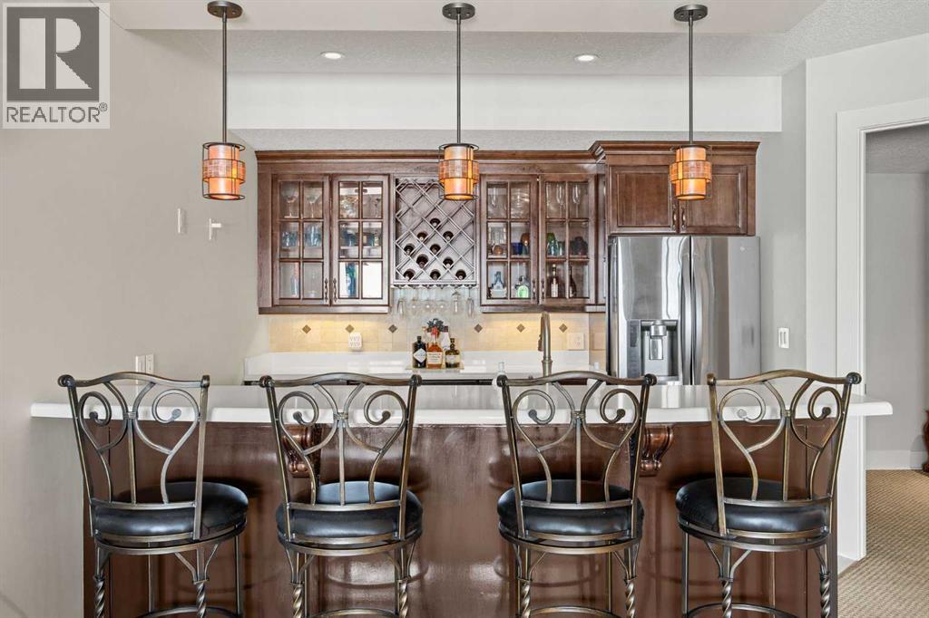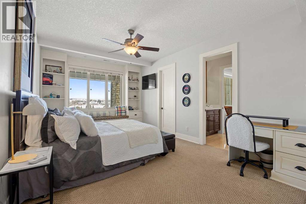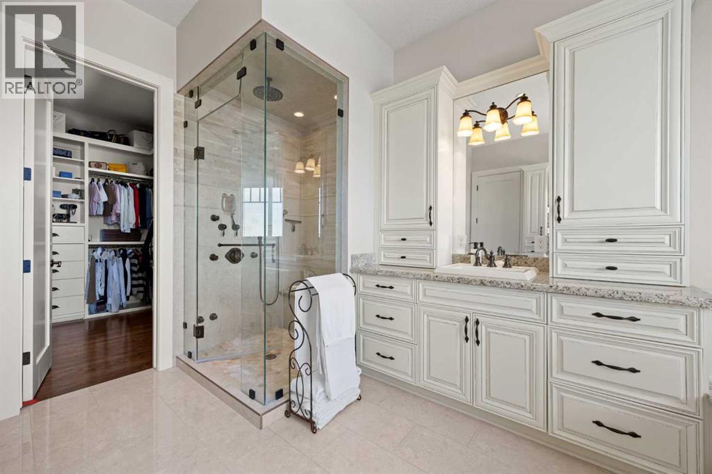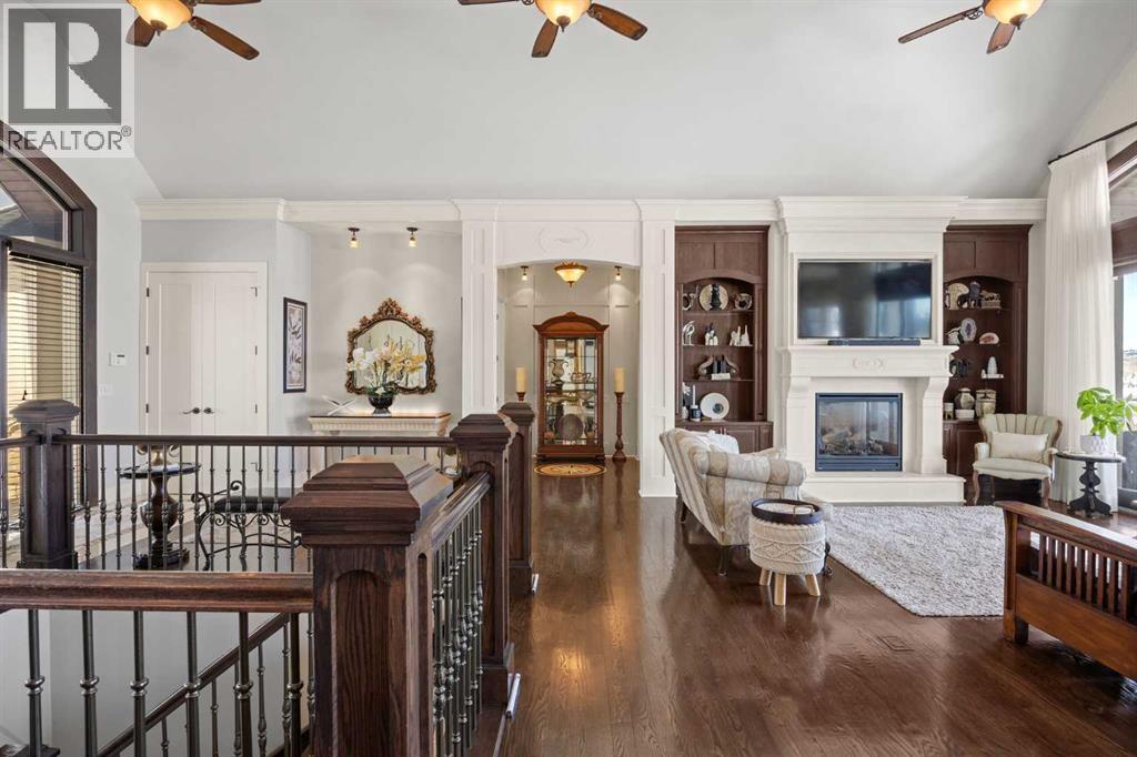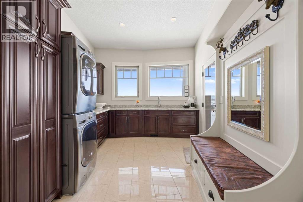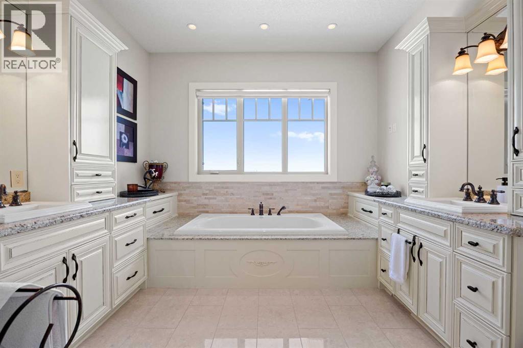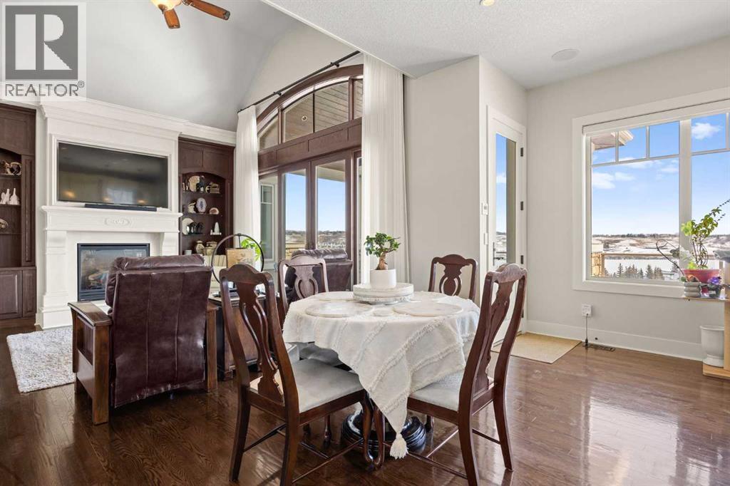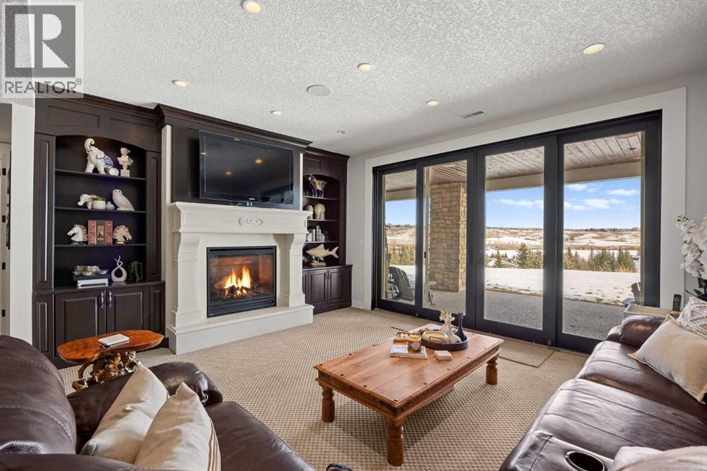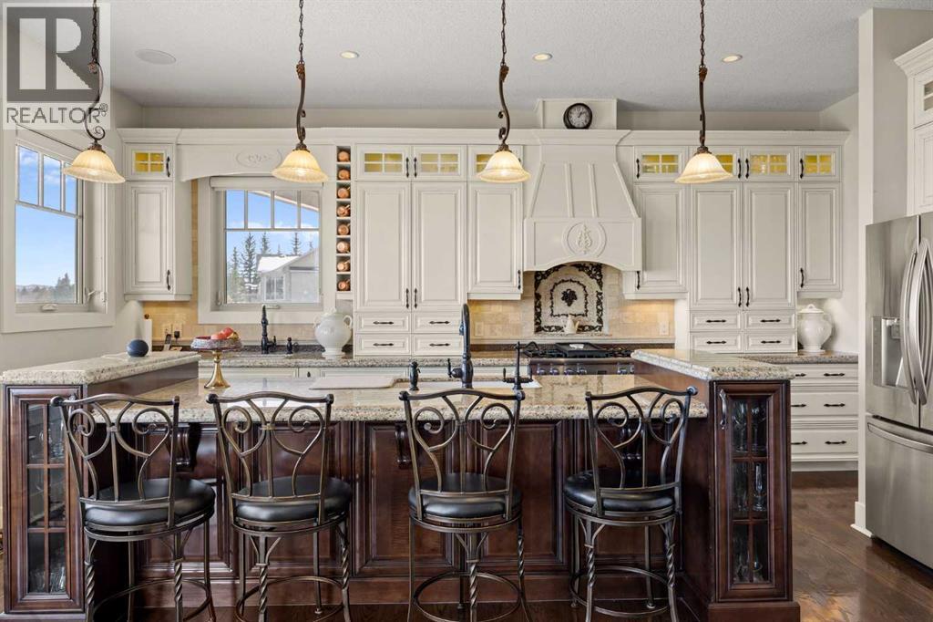 Perfectly positioned along the ridge in Emerald Bay, this custom-built walkout bungalow captures sweeping, unobstructed views of the Bow River and Rocky Mountains. Set on a quiet cul-de-sac, the home offers a rare combination of privacy, elevation, and a constantly changing natural backdrop.The main level is thoughtfully designed to showcase the scenery from nearly every principal room. Soaring vaulted ceilings and expansive windows draw the outdoors in, filling the living spaces with natural light while framing the river valley and mountain peaks beyond. The living room, anchored by a fireplace, flows seamlessly into the dining area and chef-inspired kitchen—creating an ideal setting for both everyday living and entertaining. The kitchen is anchored by a large granite island with seating, complemented by extensive cabinetry, a walk-through pantry, and direct access to a spacious mudroom and oversized laundry room that add exceptional day-to-day convenience.Privately set on its own upper level, the primary suite offers a peaceful retreat with elevated views, a spacious walk-in closet with a dedicated makeup area, and a luxurious ensuite featuring a soaker tub, glass rain and steam shower, and dual vanities.A main floor bedroom with its own ensuite provides flexibility for guests or multi-generational living, while a dedicated office creates a quiet work-from-home space. Above the garage, a private mother-in-law suite with its own separate entrance offers ideal accommodation for extended family, guests, or live-in support.The fully developed walkout basement expands the home’s versatility with three additional bedrooms, multiple bathrooms, a large family room, full bar, gym, and flexible spaces including a den and extensive storage . In-floor heating throughout the lower level and primary ensuite adds an extra layer of comfort year-round, while direct access to the lower patio creates a seamless indoor-outdoor connection.Outdoor living is just as compelling , with an expansive upper deck perfectly positioned to take in the panoramic views, along with a covered lower patio for more private gatherings. Exposed aggregate finishes on the patio and walkways enhance both durability and curb appeal.The fully finished triple attached garage is designed with both function and presentation in mind, featuring epoxy floors, built-in drainage, and in-floor heat, while an additional bay expands capacity to a total of four vehicles.With 5 bedrooms, 4 full bathrooms plus a powder room, and over 5,800 sq ft of developed living space, this home offers a rare opportunity to enjoy elevated acreage living with truly exceptional views. (id:63190)