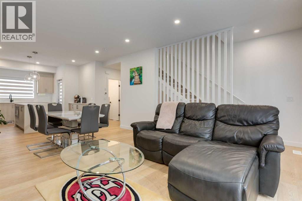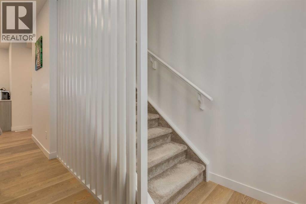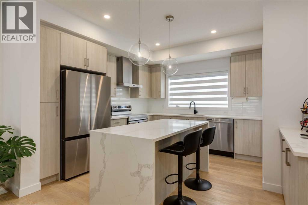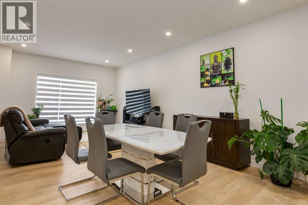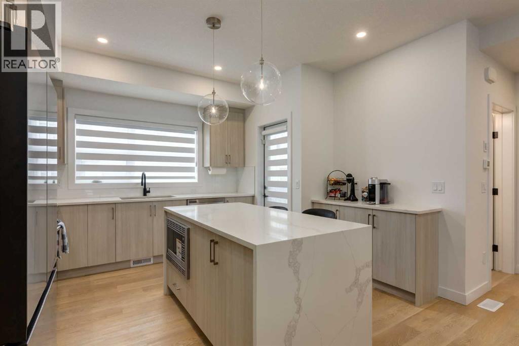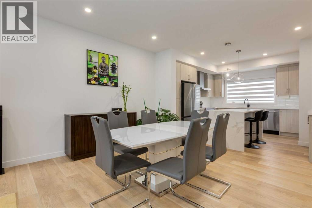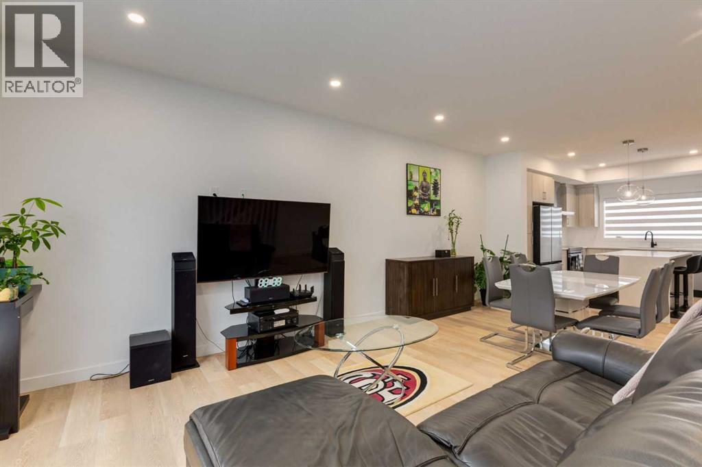 Nestled in the desirable lake community of Mahogany, this 2024 built, three storey townhouse by Mountain Pacific Homes offers a seamless blend of modern design, high end finishes and functional living. Featuring 3 bedrooms, 2.5 bathrooms and a double side by side attached garage with driveway; this home is designed for both comfort and convenience. From the moment you arrive, the Hardie board siding and engineered exterior trim provide standout curb appeal and lasting durability. Inside, you’re welcomed by a spacious foyer and a versatile flex room; ideal for a home office, gym, or additional lounge space along with direct access to the garage. The open concept main floor showcases 9’ ceilings, luxury vinyl plank flooring and large windows that fill the home with natural light. The chef inspired kitchen features quartz countertops, a waterfall island, full height cabinetry with a dedicated coffee bar, soft close doors and drawers and a full stainless steel appliance package, including a French door refrigerator and smooth top range. A full height ceramic tile backsplash, pendant lighting and pot lights throughout add a polished, modern finish. The kitchen flows seamlessly into the dining and living areas, perfect for entertaining. Upstairs, you’ll find laundry, a full four piece bathroom and three spacious bedrooms; one being the primary retreat with walk-in closet and four piece ensuite. Both upper level bathrooms continue the upscale feel with quartz countertops, tiled flooring, extra cabinetry and full height tile surrounds in the tub and shower. Additional highlights include automated blinds throughout and a private balcony with a BBQ gas line, ideal for relaxing or hosting guests. Located in the award winning lake community of Mahogany, you’ll enjoy close proximity to Mahogany Lake, along with schools, parks, pathways, shops, and trendy restaurants; offering a vibrant, walkable lifestyle.. Truly a must see, book your showing today! (id:63190)