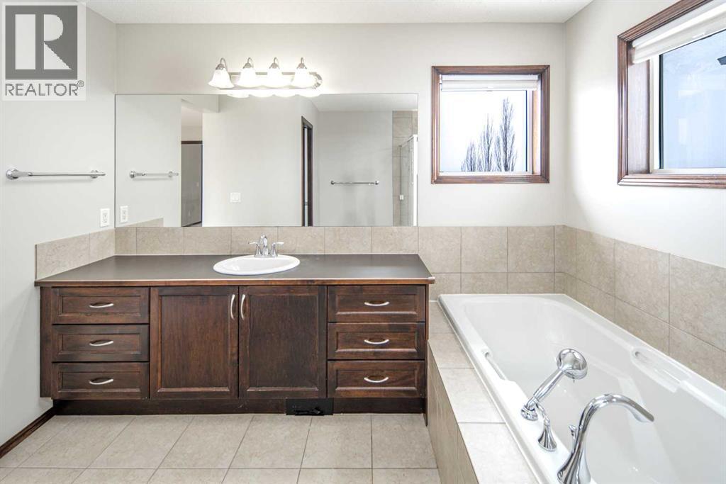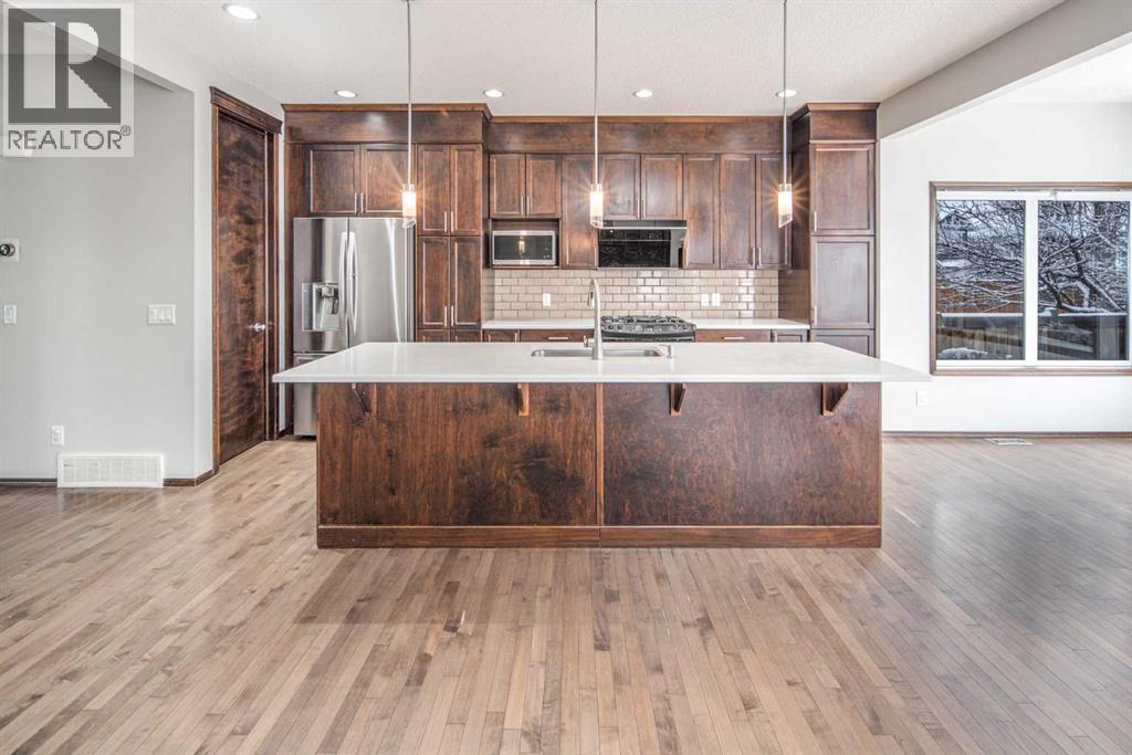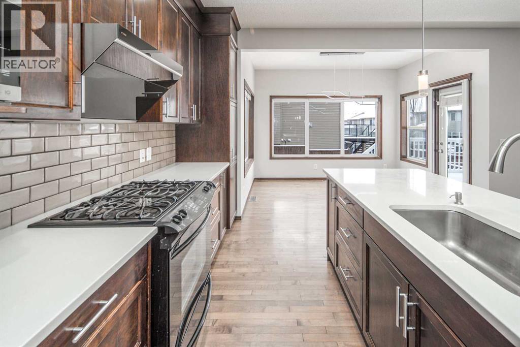 Welcome to this sunny and well-maintained 2,391 sq ft 2-storey home on a quiet street in Panorama Hills! Featuring an insulated double attached garage and extended driveway with parking for up to 5 vehicles.Main floor offers hardwood flooring, 9-ft ceilings, and 8-ft doors, plus a gourmet kitchen with maple cabinetry, quartz countertops, subway tile backsplash, gas stove, new hood fan, new dishwasher, new fridge, and a large island. Bright living and dining areas with abundant south-facing natural light.Upstairs includes a spacious primary bedroom with room for a king-sized bed and sitting area, 4-pc ensuite, and walk-in closet. Two additional bedrooms and a vaulted bonus room with pot lights complete the level.Fully fenced south-facing backyard with deck—ideal for outdoor living.Upgrades: central A/C, central vacuum, water softener, new hood and dishwasher, brand new roof and siding (2026), and fresh paint throughout. Move-in ready! (id:63190)
