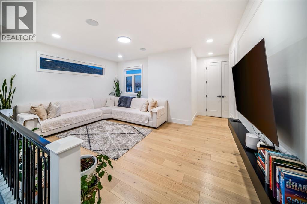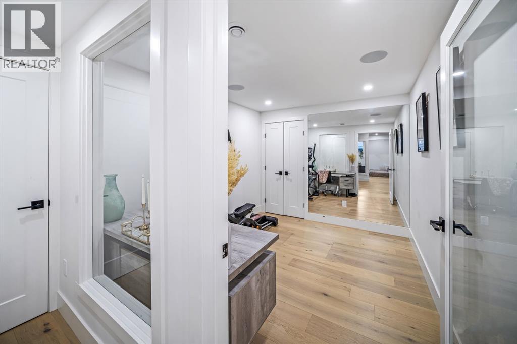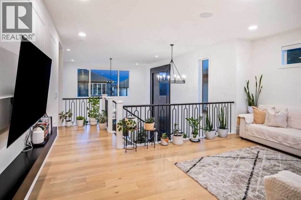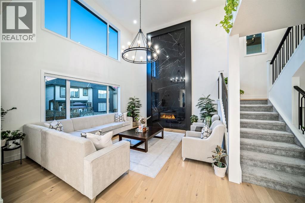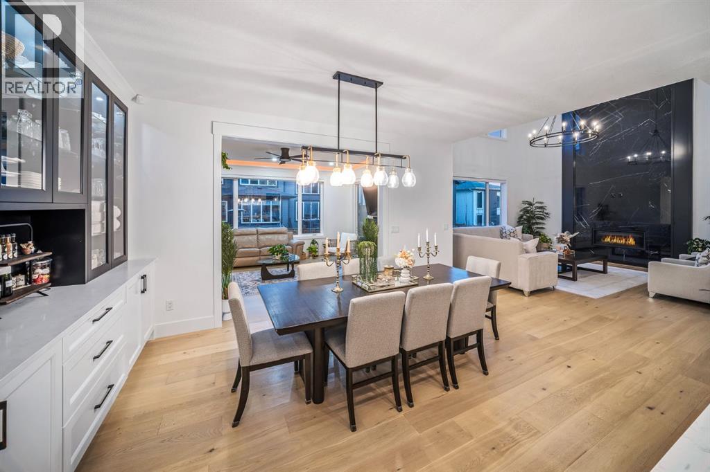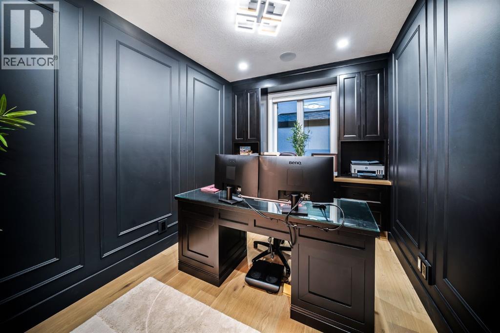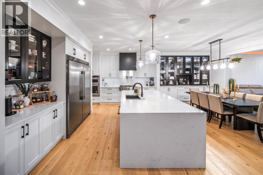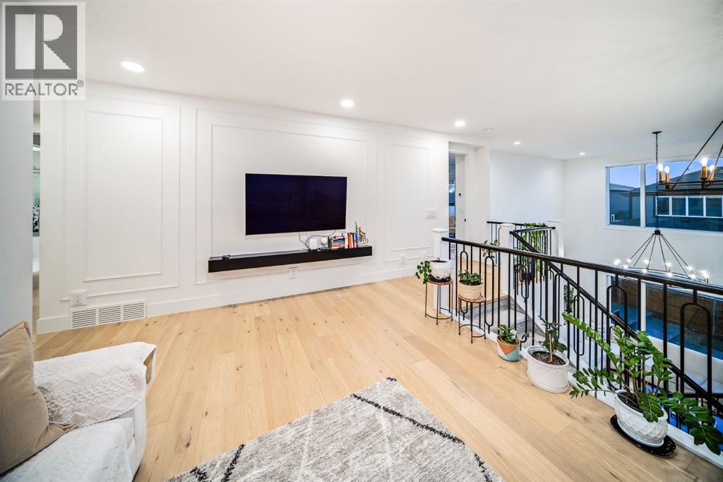 Welcome to this exceptional custom residence in the prestigious community of Aspen Woods—an exquisite family home offering over 4,800 sq ft of impeccably designed living space. Featuring 5 bedrooms and 4.5 bathrooms, this home is thoughtfully crafted for both refined everyday living and elevated entertaining, all set on a generous east-facing lot with a triple attached garage.Upon entry, you’re greeted by soaring 9-foot ceilings and rich hardwood flooring that lead into a breathtaking open-concept living space, where dramatic 20-foot ceilings create a grand yet inviting atmosphere filled with natural light. The chef-inspired kitchen is a true centerpiece, beautifully appointed with extensive custom cabinetry, quartz countertops, a built-in wall oven, gas cooktop with pot filler, an oversized island, and a fully outfitted walk-in pantry. Designed with both function and sophistication in mind, the home also features a separate spice kitchen/butler’s pantry with its own garage access—offering seamless flow and added convenience.The dining area is elegantly enhanced with custom buffet millwork and transitions effortlessly to the outdoor living space. Anchoring the main living room is a stunning floor-to-ceiling stone gas fireplace, complemented by designer lighting and expansive windows that flood the home with warmth and light. A true highlight of the property is the fully enclosed sunroom, thoughtfully designed as an extension of the home and complete with its own fireplace—creating a luxurious, year-round retreat that opens seamlessly onto the patio. Above, a private upper deck awaits completion, offering the opportunity to further elevate the outdoor experience. The main floor also features a beautifully reimagined office, complete with bespoke millwork and custom built-ins. Designer detailing continues throughout, from the refined front entry to the stylish powder room and into the primary suite, creating a cohesive and elevated aesthetic. A well-appointed mudr oom with additional storage completes the level. Upstairs, hardwood flooring continues throughout, leading to a spacious loft-style bonus room—perfect for family living or relaxation. The primary suite is a true sanctuary, featuring a custom sliding barn door and a spa-inspired ensuite with dual vanities, a dedicated makeup station, glass-enclosed steam shower, and a deep soaker tub. Three additional bedrooms complete the upper level—two with private ensuites—alongside an additional 5-piece bathroom, ideal for growing families. The fully developed lower level is designed for both comfort and entertainment, offering a dedicated home theatre, wet bar, versatile flex space, a fifth bedroom, a 3-piece bath, and a generous recreation area. Ideally located near top-rated schools, premium amenities, and with effortless access to the mountains, this remarkable home embodies the Aspen Woods lifestyle—luxurious, connected, and effortlessly refined. (id:63190)