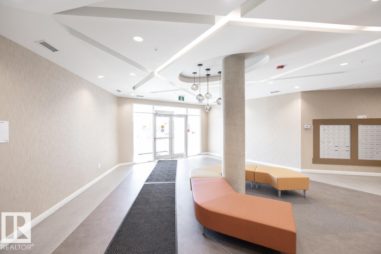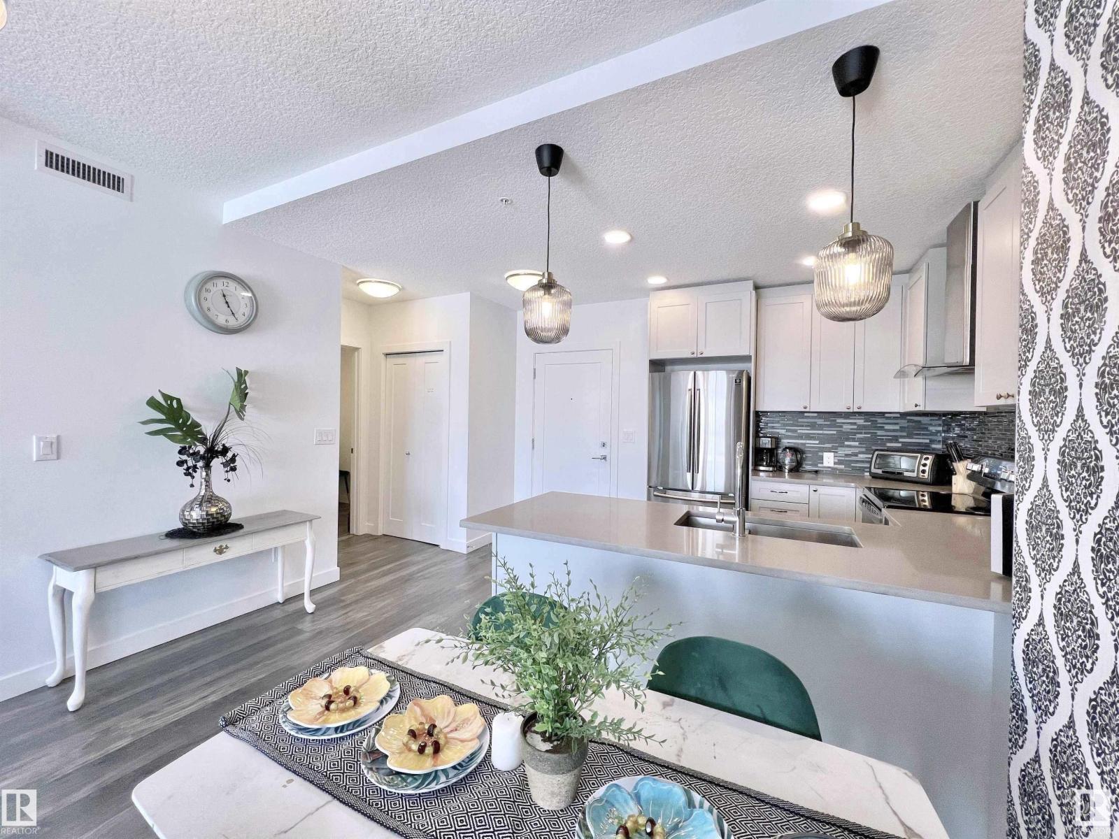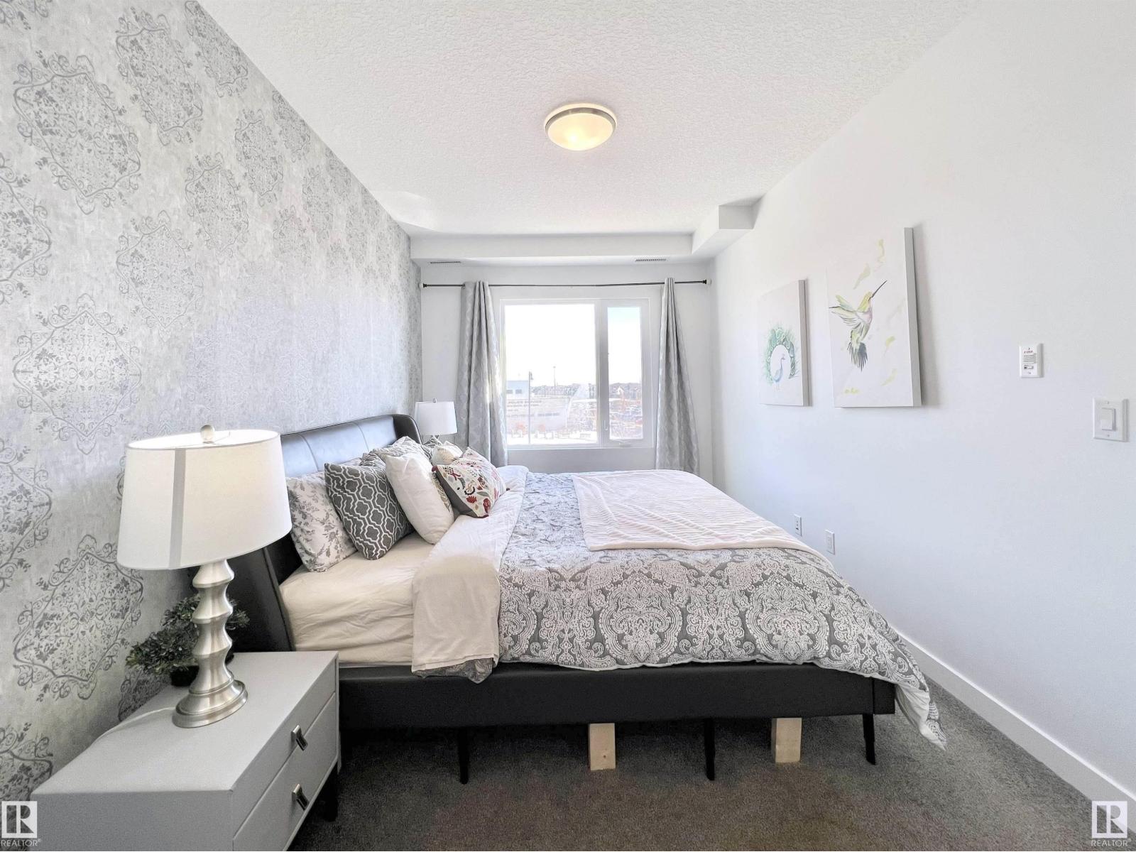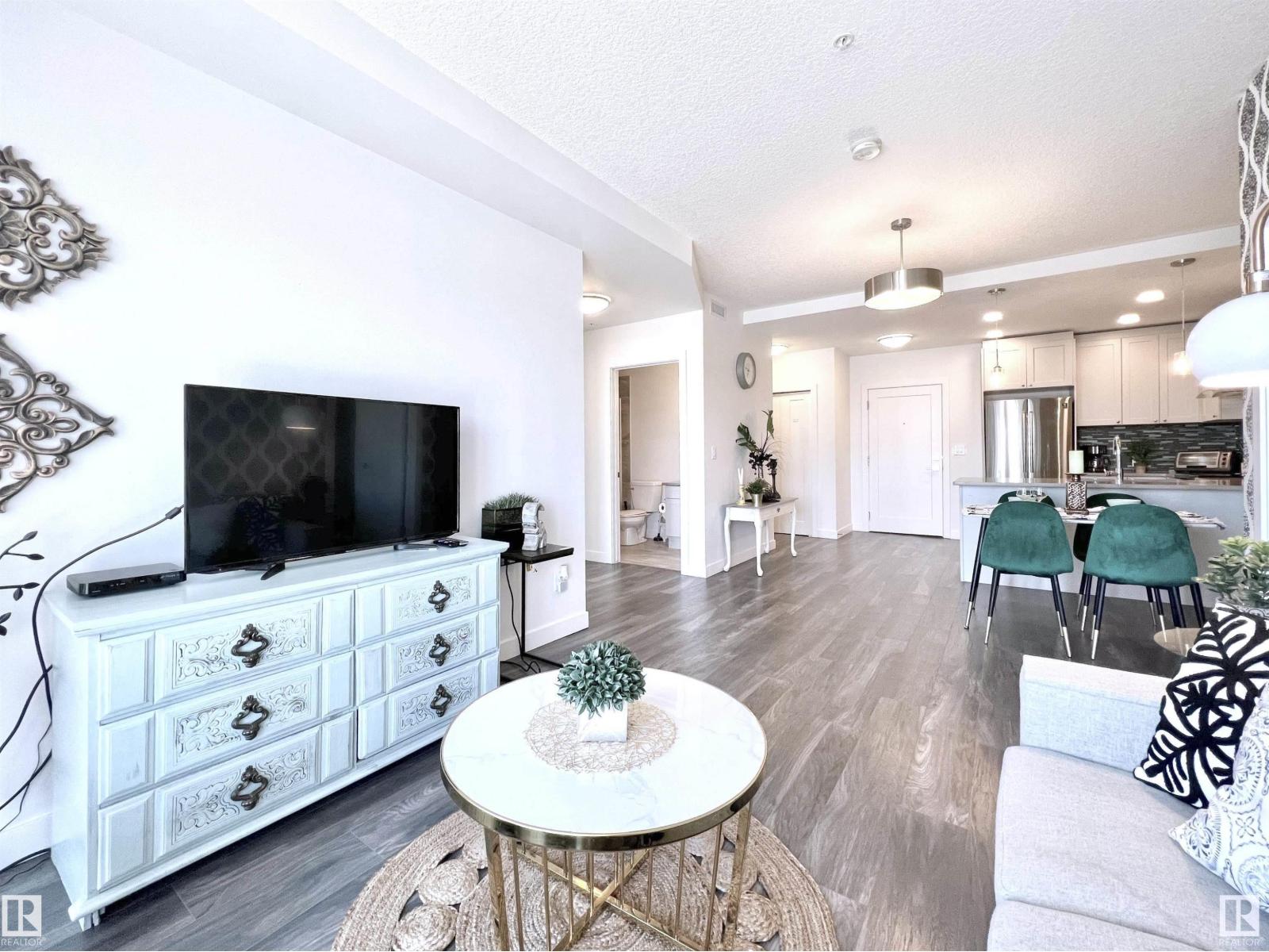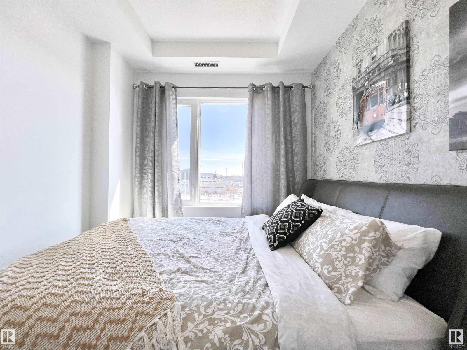 Experience luxury living in this sun-drenched, high-end condo in Southwest Edmonton. Boasting over 900sqft of elegant living space, this home impresses with soaring 9’ ceilings and a modern open-concept layout. The gourmet kitchen is a chef’s dream, featuring premium stainless steel appliances and designer finishes. Both spacious bedrooms and the private balcony enjoy a desirable Southeast exposure, flooding the interior with vibrant natural light all day long. The primary suite offers sophisticated tray-ceiling details, a generous walk-in closet, and a spa-like ensuite. This residence also includes a functional work-from-home nook and stylish flooring throughout. Located in a secure building with a grand, sophisticated lobby, you are just steps away from premium shopping, dining, and transit. This move-in-ready gem is the perfect blend of comfort, style, and location. Truly a rare find for those seeking a bright and airy sanctuary! (id:63190)