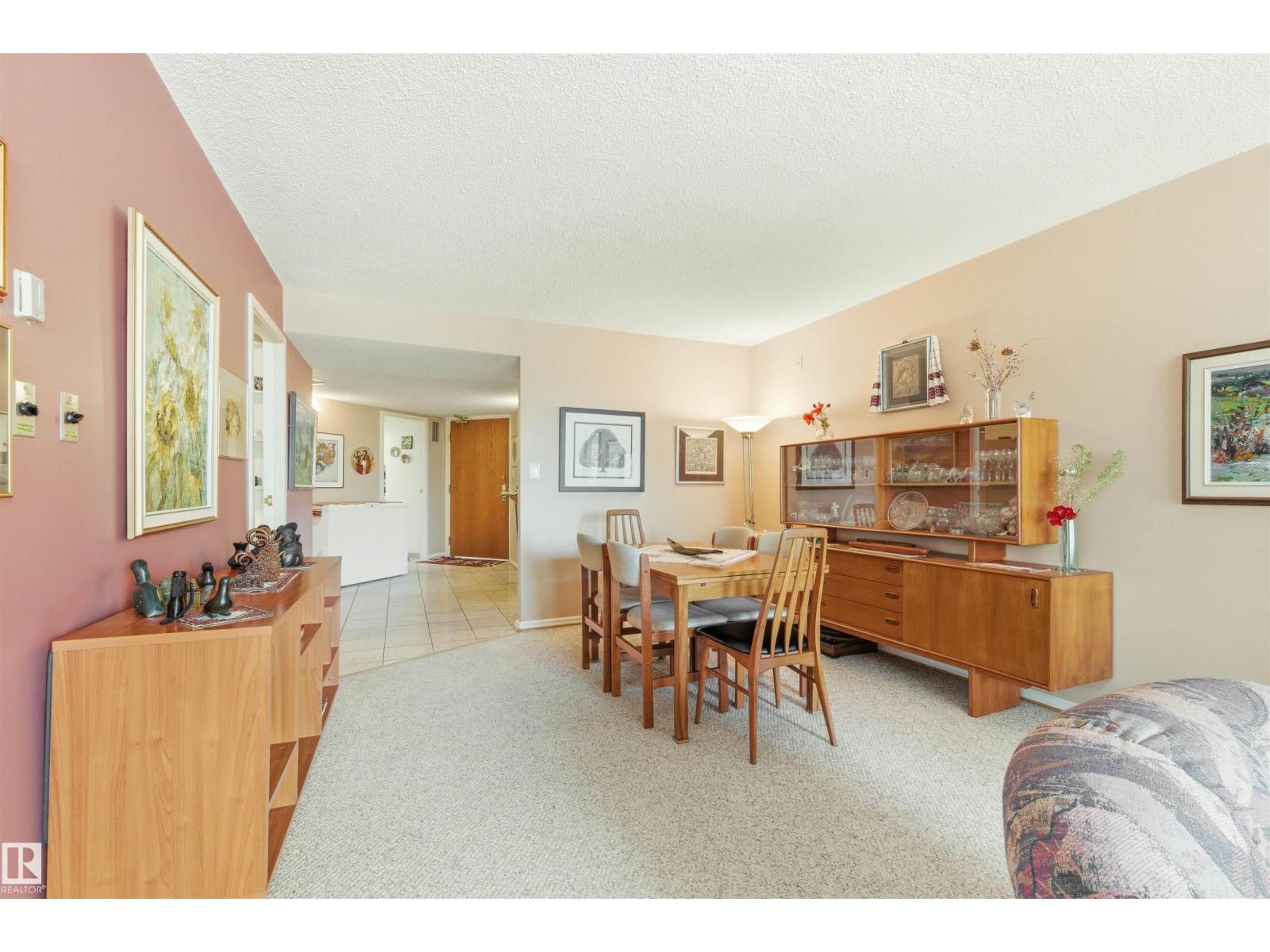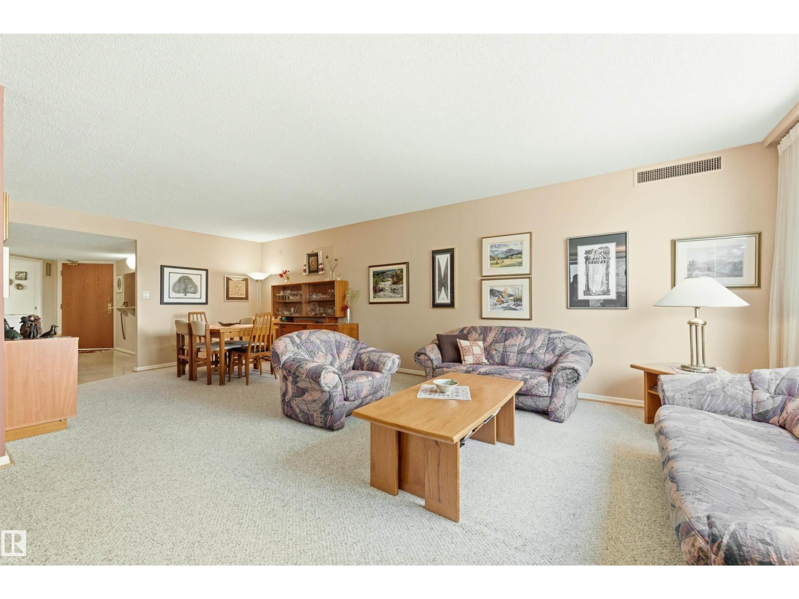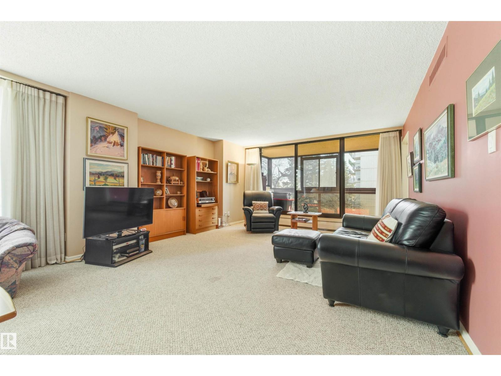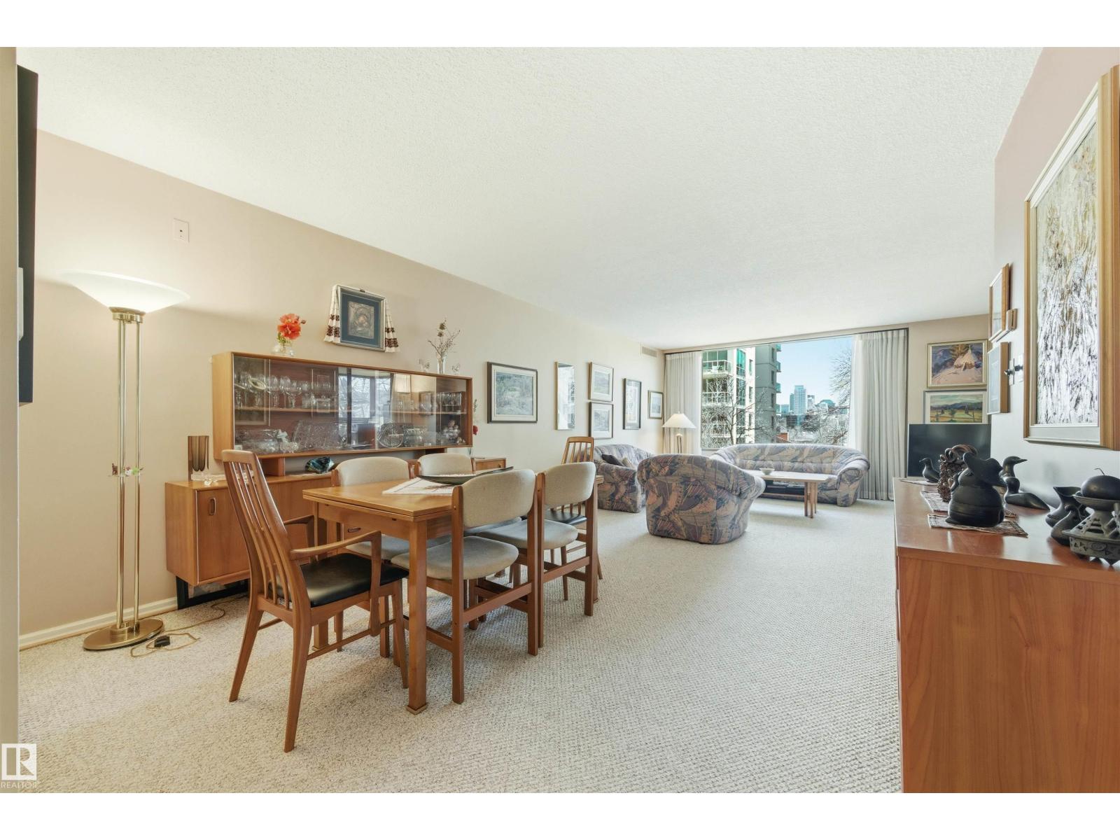 Style & elegance welcomes you to this lovely two bedroom,two bathroom condo with two parking stalls+1564sqft of living space.The living area is bright,spacious+features two sitting areas(one w/a sliding door to the enclosed balcony)+an adjoining dining room--perfect for entertaining.The kitchen offers ample cabinets,corian counters+a separate garden door to the gorgeous three season balcony.The large primary bedroom is a dream w/a 4pc ensuite,closet space+bulit-in vanity.Completing this unit is a second bedroom,a spacious front foyer,a 3pc bath(w/sauna),laundry/storage room+2 storage lockers in the underground parking.The suite has been immaculately maintained in its original move-in condition,+ is a blank canvas for someone looking to renovate+add their own personal touch.Nestled in a quiet,well maintained building w/only 3 units per floor.Steps to Jasper Ave,Victoria Promenade,the River Valley, shops,restaurants+transit.Urban living has never felt so FABULOUS—Your new condo awaits! (id:63190)