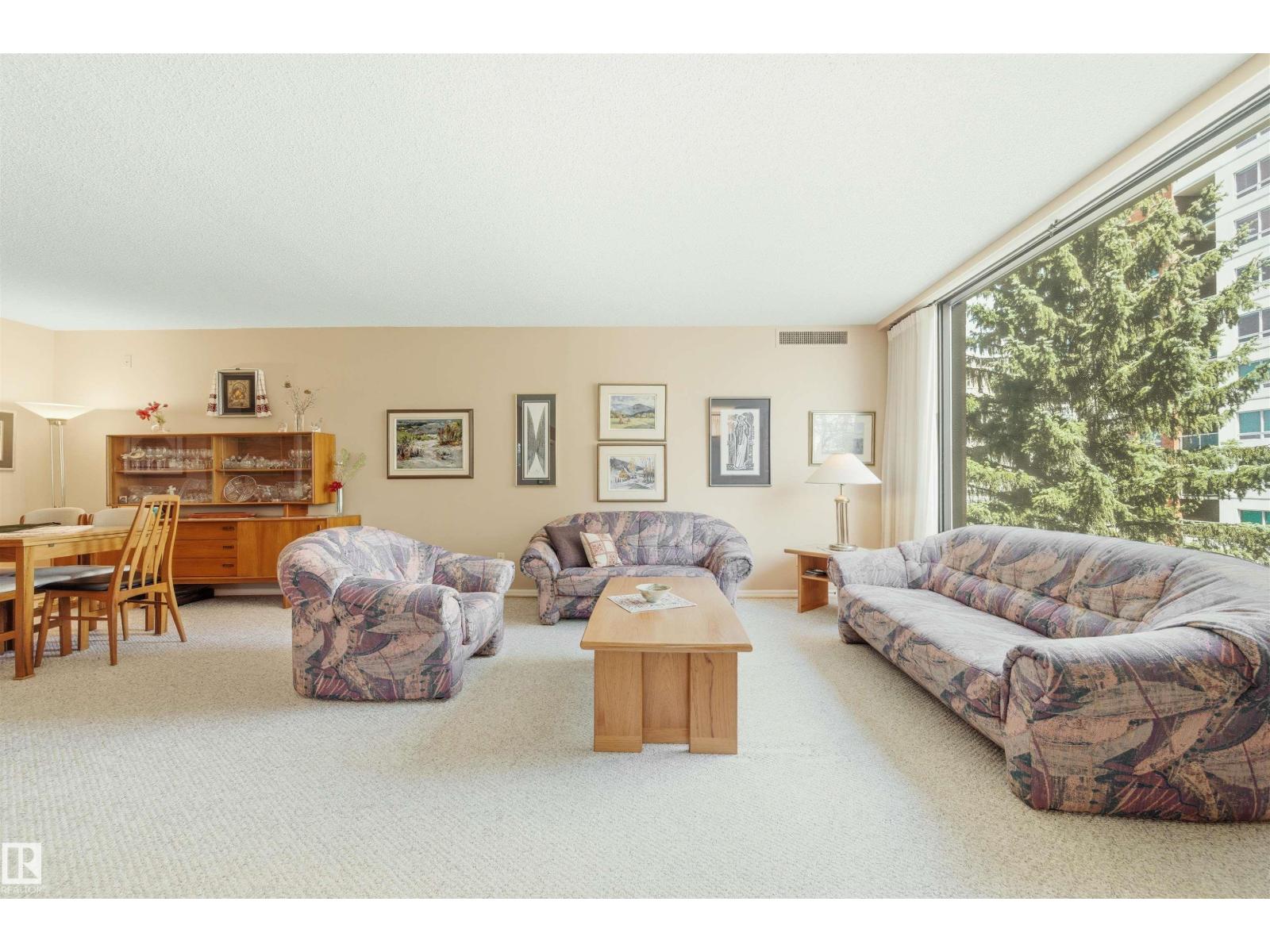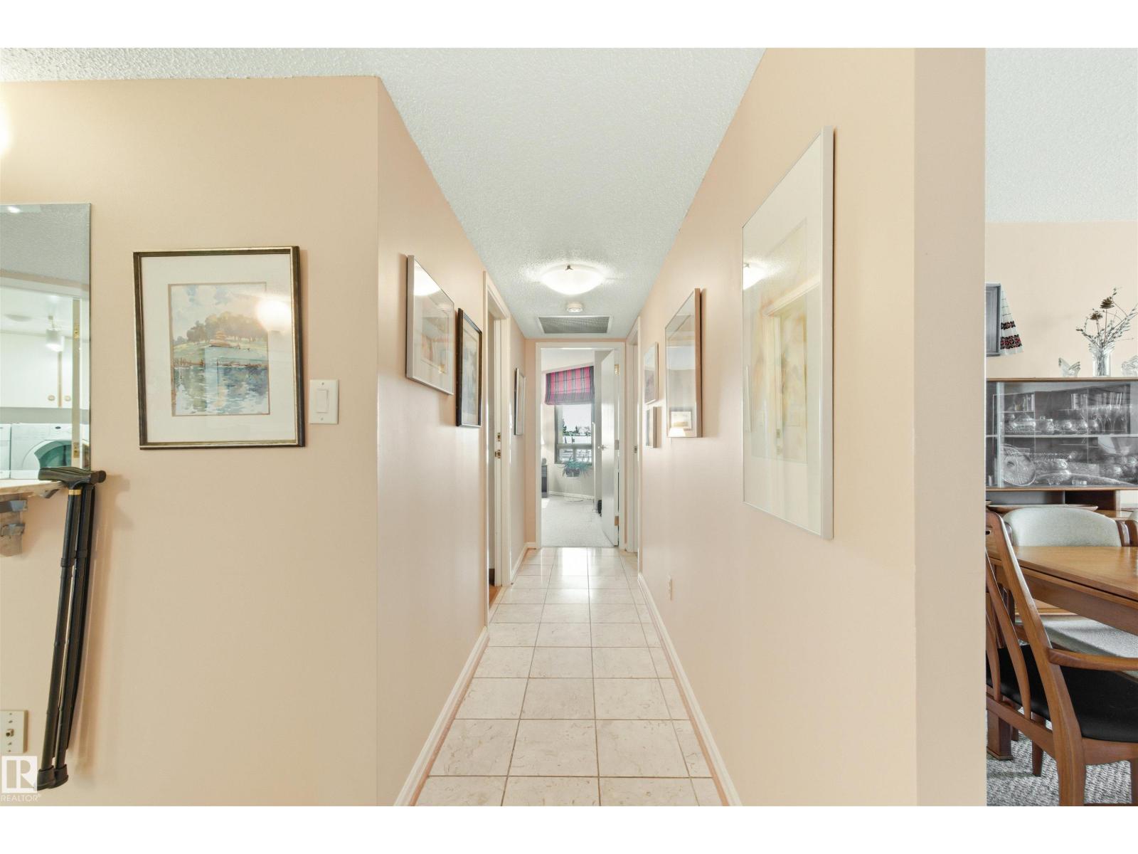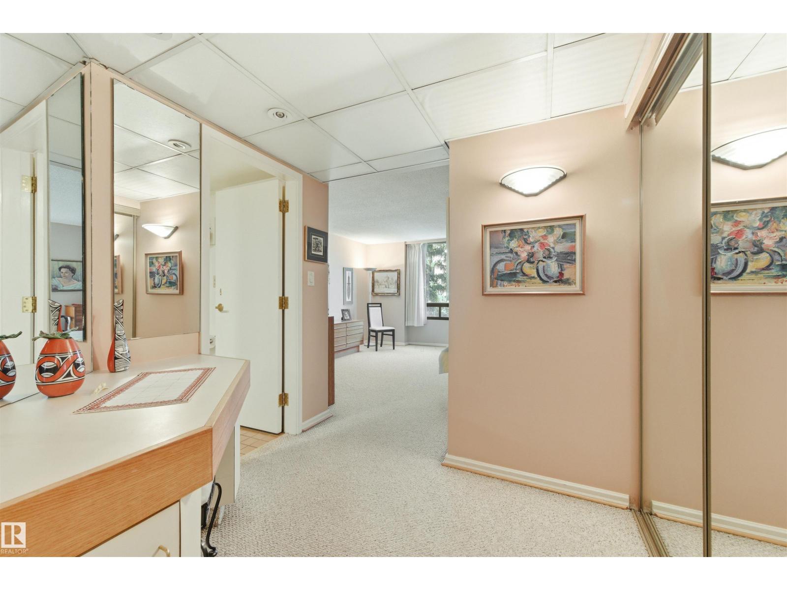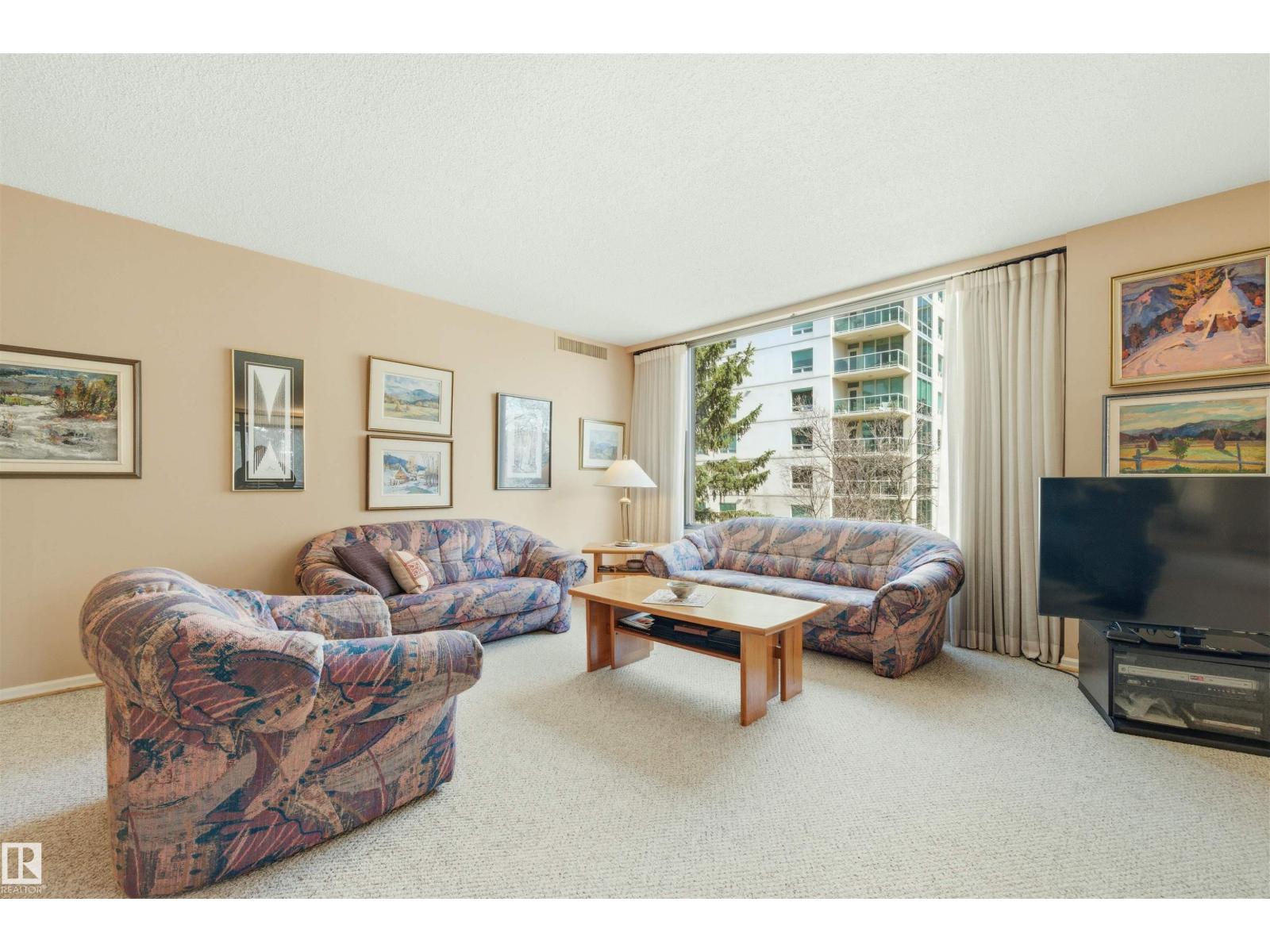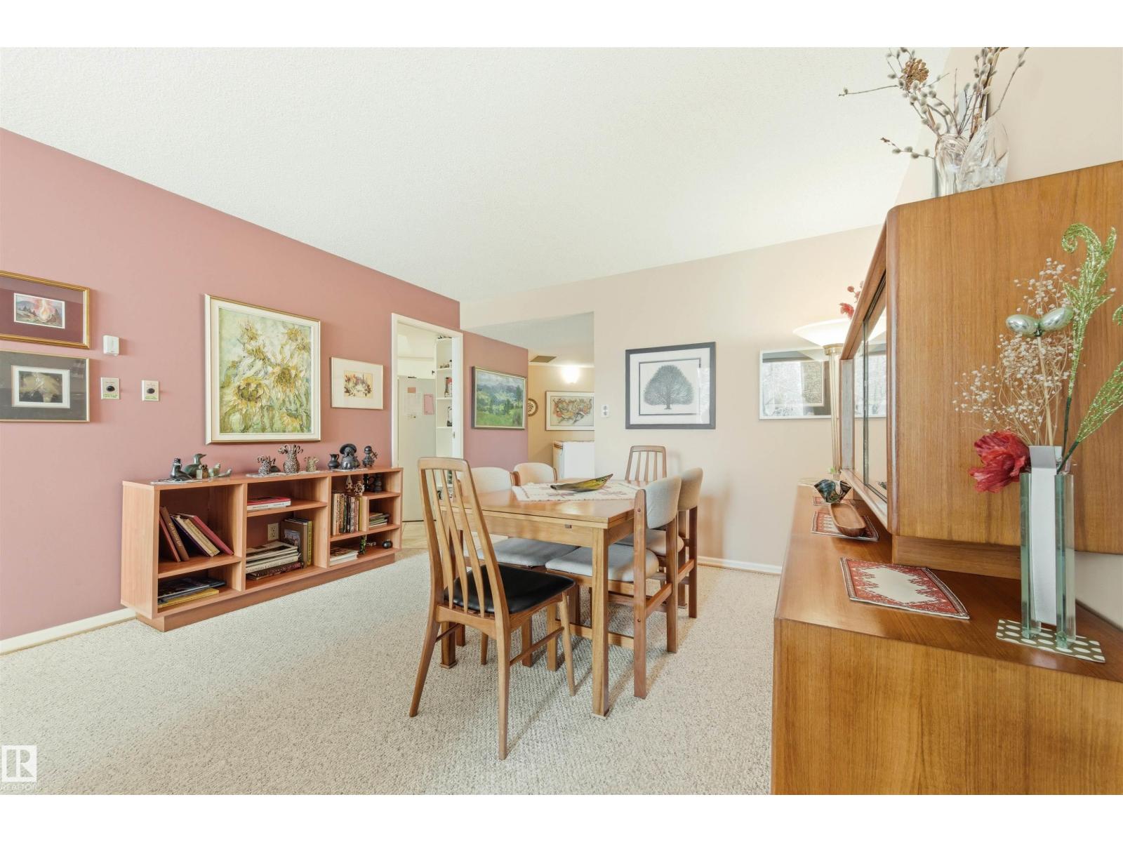 Style & elegance welcomes you to this lovely two bedroom,two bathroom condo with two parking stalls+1564sqft of living space.The living area is bright,spacious+features two sitting areas(one w/a sliding door to the enclosed balcony)+an adjoining dining room--perfect for entertaining.The kitchen offers ample cabinets,corian counters+a separate garden door to the gorgeous three season balcony.The large primary bedroom is a dream w/a 4pc ensuite,closet space+bulit-in vanity.Completing this unit is a second bedroom,a spacious front foyer,a 3pc bath(w/sauna),laundry/storage room+2 storage lockers in the underground parking.The suite has been immaculately maintained in its original move-in condition,+ is a blank canvas for someone looking to renovate+add their own personal touch.Nestled in a quiet,well maintained building w/only 3 units per floor.Steps to Jasper Ave,Victoria Promenade,the River Valley, shops,restaurants+transit.Urban living has never felt so FABULOUS—Your new condo awaits! (id:63190)